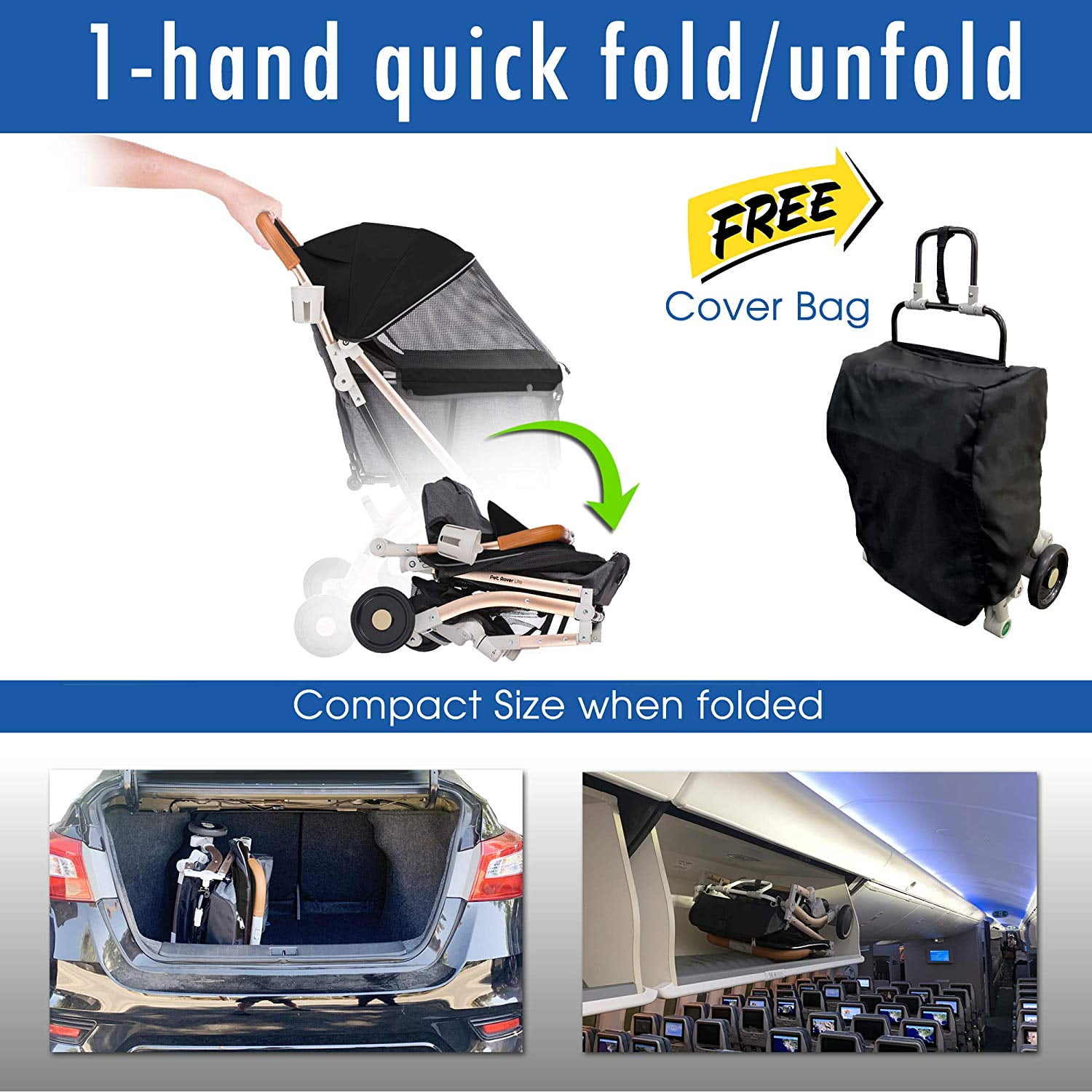 2nd-Generation model features upgrade fabrics, stronger hardware & improved tires. SUPER TRAVEL-FRIENDLY – This premium pet stroller is small and light making traveling with your pets a breeze. Its low-profile and compact design fold into an airplane overhead-bin or store in the trunk of a small car. A retractable towing handle provides easy maneuverability.1-HAND QUICK FOLD/UNFOLD- The stroller can be folded and unfolded in just seconds with one hand only, so you can open or close it effortlessly. A FREE cover bag is included to store the stroller. EXPANDABLE PET COMPARTMENT – Patented front and rear expansions allow the pet compartment to convert from 13”x13” to 13”x27″-Long, accommodating a few small pets or one medium pet up to 30 lbs. ERGONOMIC LIGHT-WEIGHT DESIGN – This light-weight pet buggy is made of rust-free aluminum in anodized gold color. Front and rear canopy openings provide viewing flexibility. 2 front-wheel suspension and PU-leather handlebar made traveling with pets enjoyable. No assembly required, just snap the wheels, and it’s ready to go. PET-CENTRIC DESIGNS -This premium pet stroller features a retractable meal bowl holder to feed your pets at any time, and two tethers in the basket buckle your pets in snugly. It also includes two machine-washable carrier pads and durable water-resistant fabric. Three organizer pockets and a large under-basket made traveling easy and tidy.