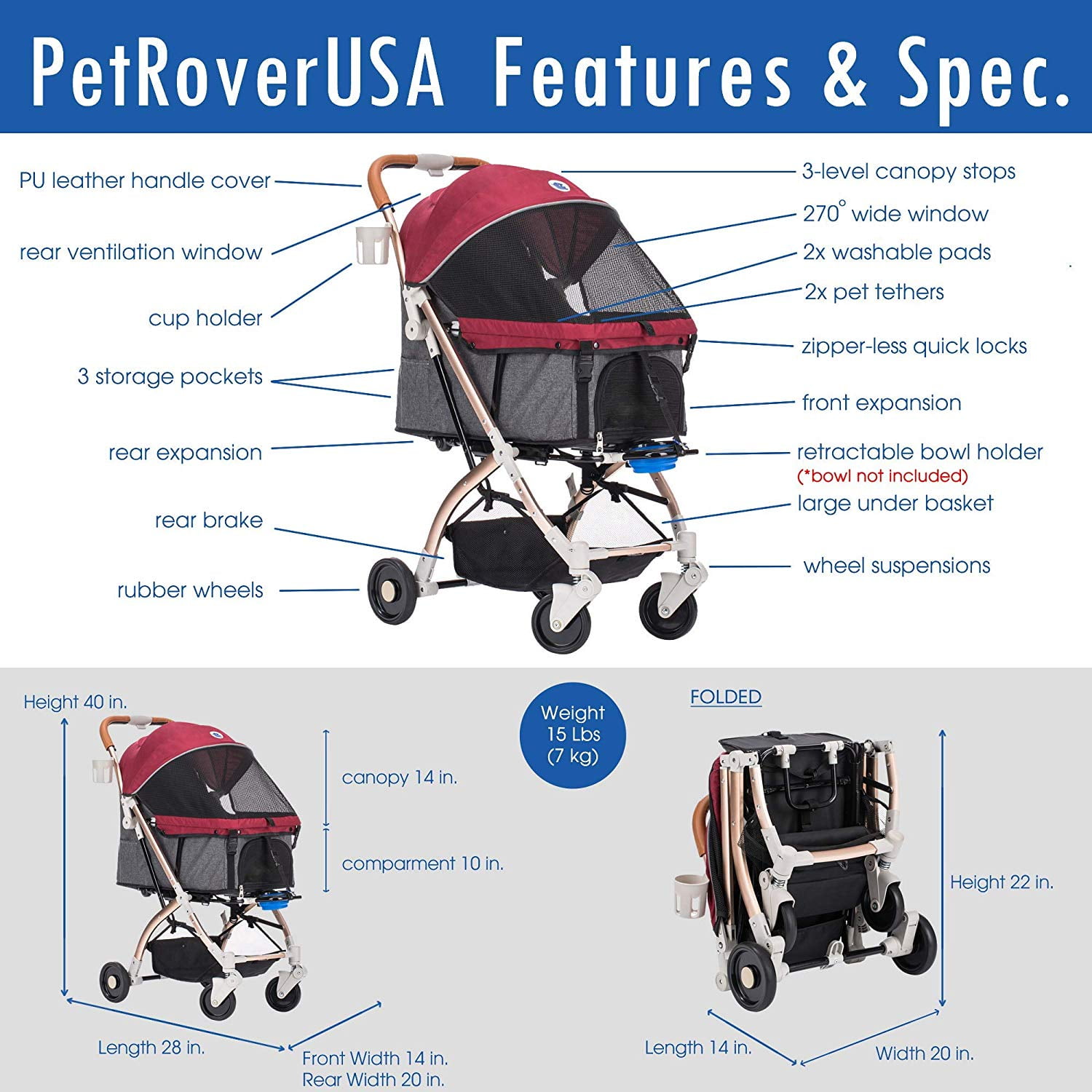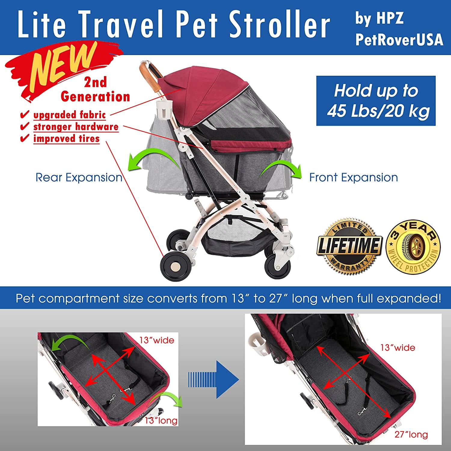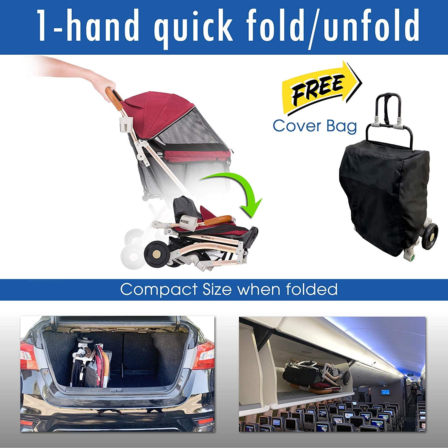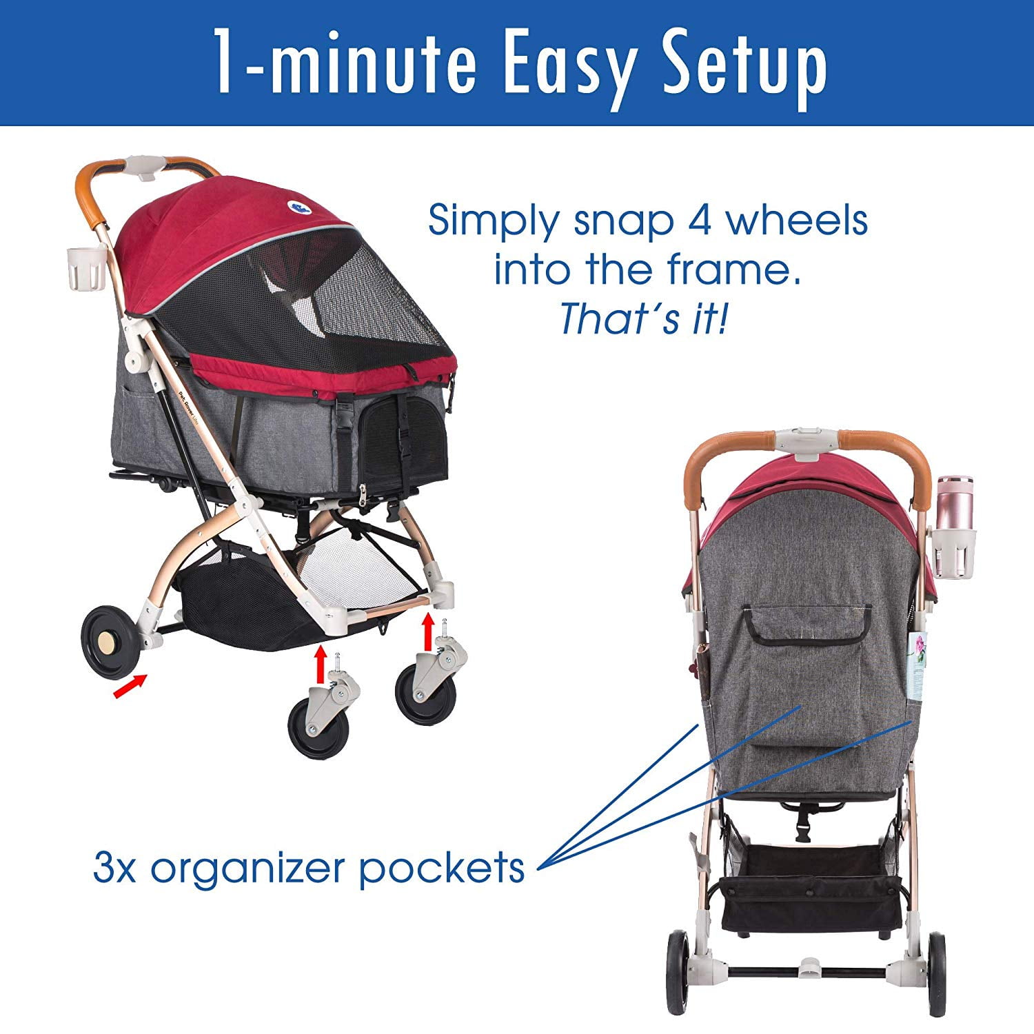 2nd-Generation model features upgrade fabrics, stronger hardware & improved tires. SUPER TRAVEL-FRIENDLY-This premium pet stroller is small and light making traveling with your pets a breeze. Its low-profile and compact design fold into an airplane overhead-bin or store in the trunk of a small car. A retractable towing handle provides easy maneuverability.1-HAND QUICK FOLD/UNFOLD – The stroller can be folded and unfolded in just seconds with one hand only, so you can open or close it effortlessly. A FREE cover bag is included to store the stroller. EXPANDABLE PET COMPARTMENT- Patented front and rear expansions allow the pet compartment to convert from 13”x13” to 13”x27″-Long, accommodating a few small pets or one medium pet up to 30 lbs. ERGONOMIC LIGHT-WEIGHT DESIGN -This light-weight pet buggy is made of rust-free aluminum in anodized gold color. Front and rear canopy openings provide viewing flexibility. 2 front-wheel suspension and PU-leather handlebar made traveling with pets enjoyable. No assembly required, just snap the wheels, and it’s ready to go. PET-CENTRIC DESIGNS – This premium pet stroller features a retractable meal bowl holder to feed your pets at any time, and two tethers in the basket buckle your pets in snugly. It also includes two machine-washable carrier pads and durable water-resistant fabric. Three organizer pockets and a large under-basket made traveling easy and tidy.