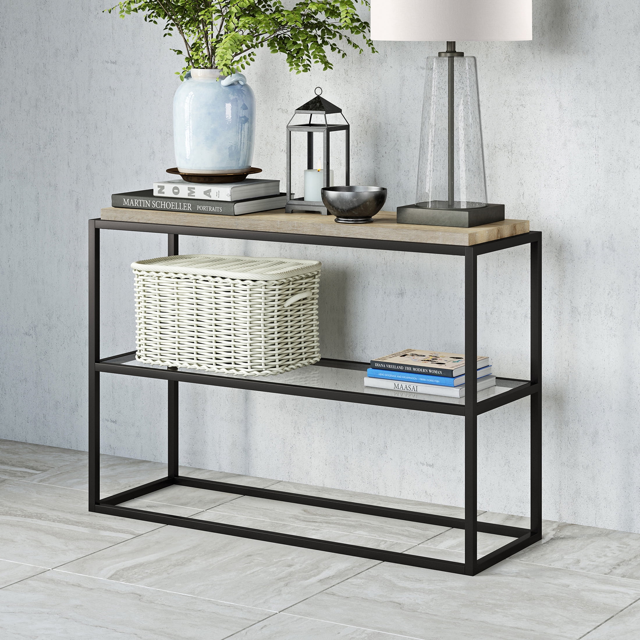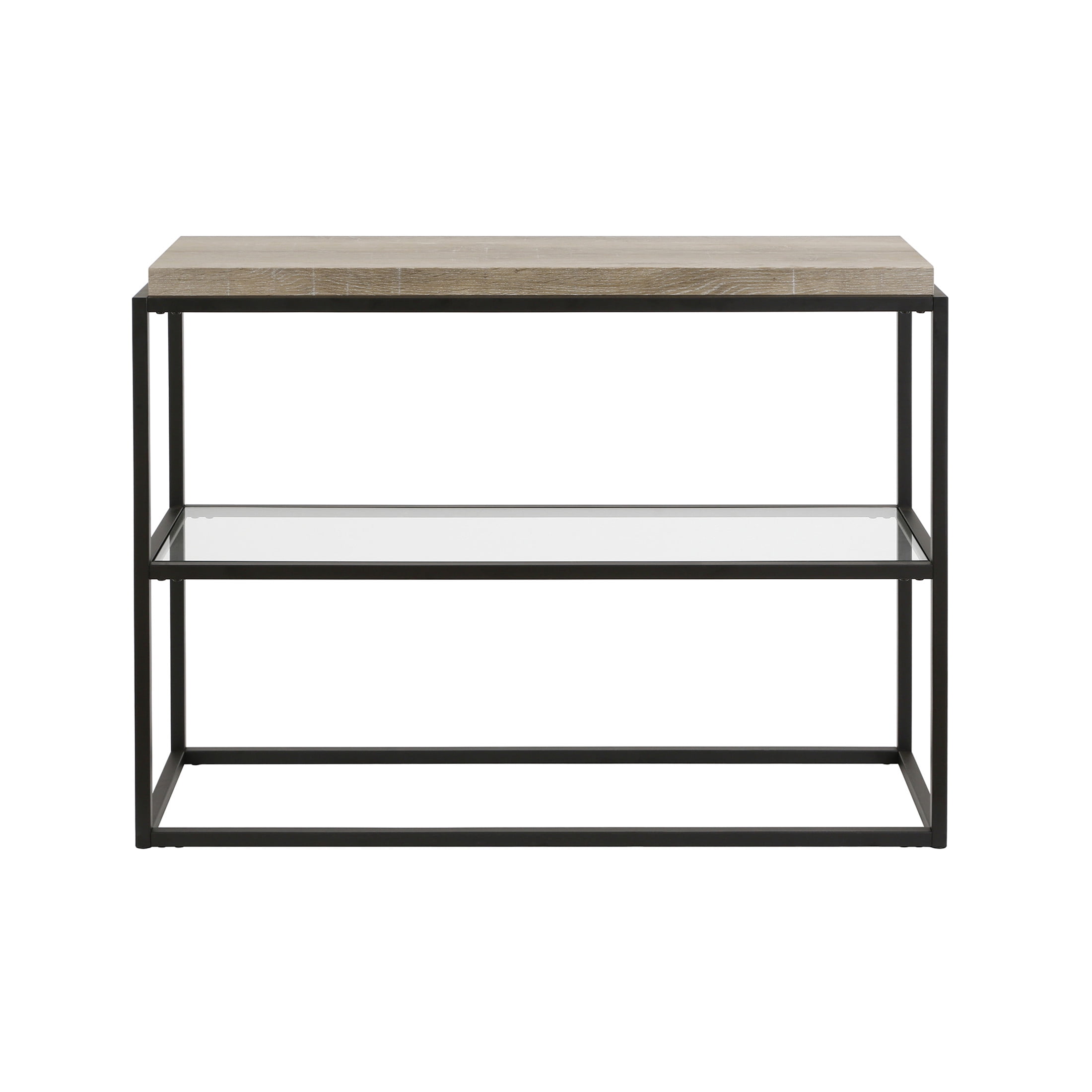 Whether tucked behind the sofa or used as a display for a menagerie of trinkets, this console table is the perfect backdrop to create a center point of visual interest in your space. Create a warm welcome with this clean but consumable console table. Features: Made of MDF, steel, and tempered glass Blackened bronze finish on clean-lined, robust steel frame Burnished, rustic grey oak finish on rectangular top Clear, smooth, rectangular tempered glass middle shelf All tools included with step-by-step instructions Cleans with soft, dry cloth Easy assembly Holds up to 50 lbs. Weighs 37 lbs. Dimensions: 42 inches wide x 14 inches deep x 31 inches tall
