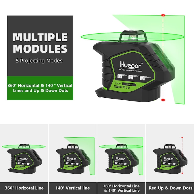 - BRIGHTER GREEN BEAM & OUTDOOR PULSE MODE: Besides brighter green beam, an outdoor pulse mode extends the laser range up to 197ft with Huepar LR-6RG/LR-5RG Line Laser Receiver in bright light or outdoor conditions.