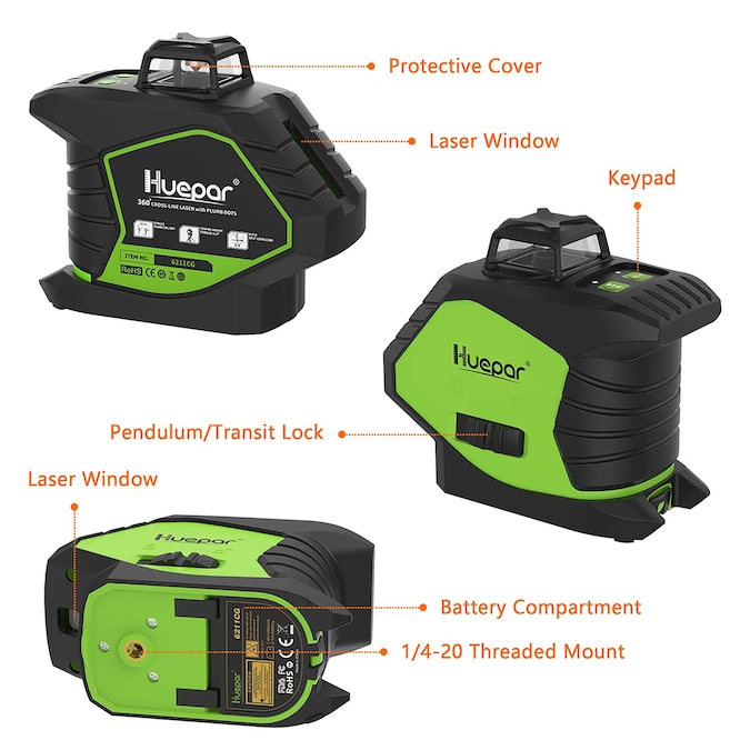 - 360 DEGREE HORIZONTAL LINE AND TWO PLUMB DOTS: With one ultra-bright 360° horizontal line and one 140° vertical green beam, 6211CG Laser Level provides all-around leveling coverage even in big job-site.