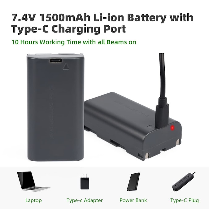- LI-ION BATTERY WITH TYPE-C CHARGING PORT: Huepar 6211CG line laser tool employed a large capacity of 7.4V / 1500mAh Li-ion Battery and provides up to 10 hours of running time.