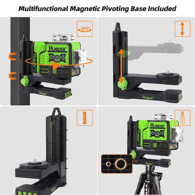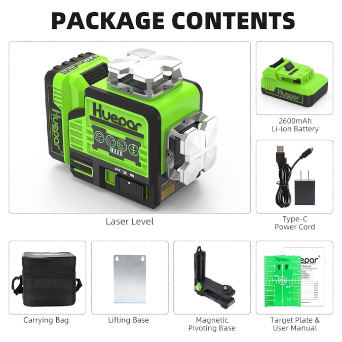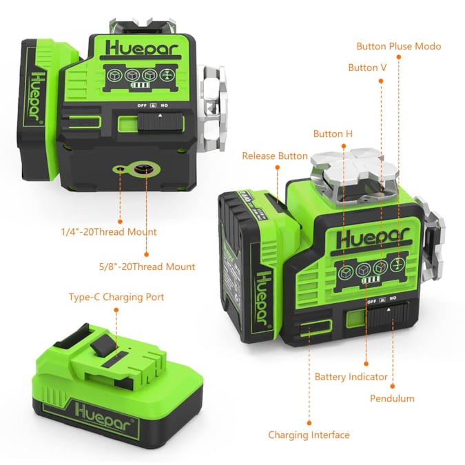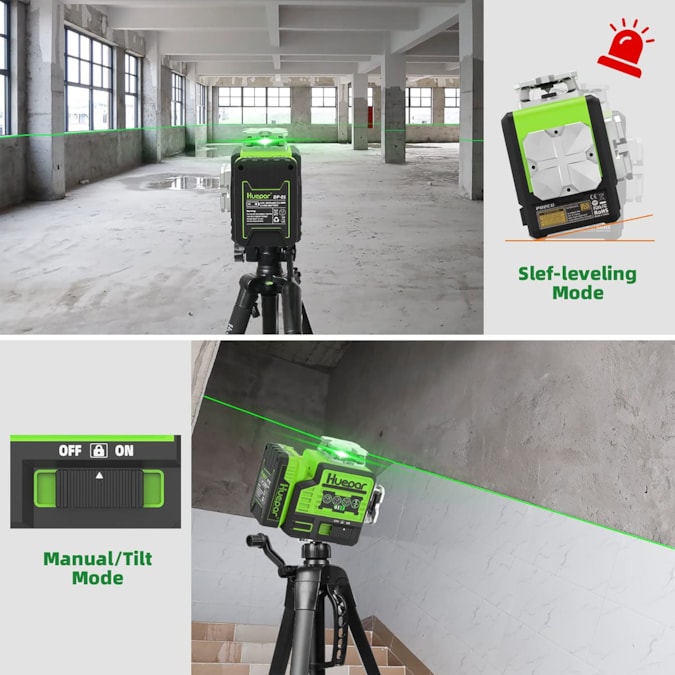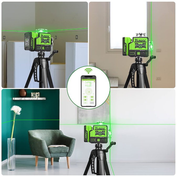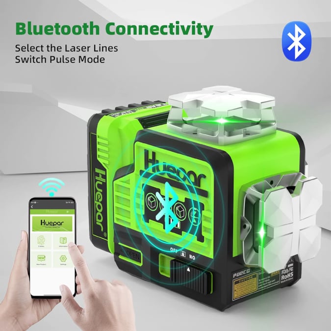 - BLUETOOTH TECH & HIGH VISIBILITY: Bluetooth connectivity enables to control select the laser planes with Huepar App or remote control, This self-leveling laser level adopted the bright Osram’s green laser unit.