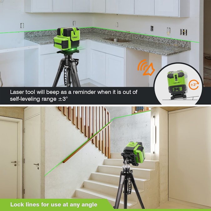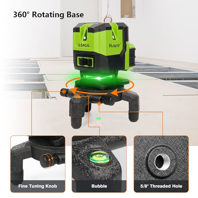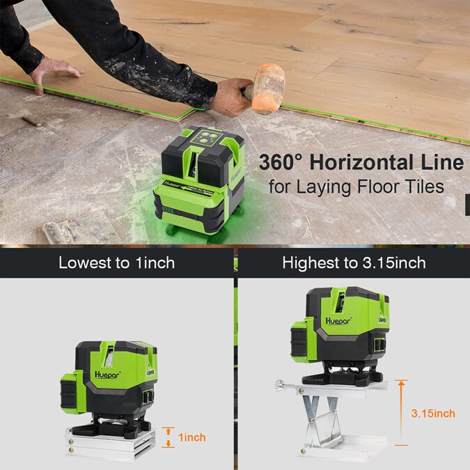 • MULTI-LINE LASER TOOL: Huepar LS41G multi-line laser level delivers 360° floor horizontal line for tiling installation at a 2/5″ distance, Providing all-around leveling coverage for layout of tile, stone, brick, carpet and hardwood flooring.