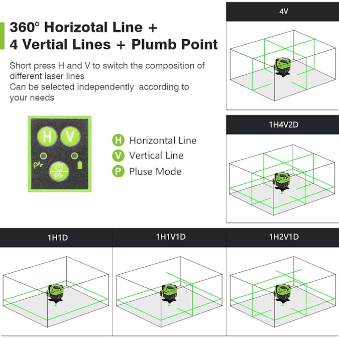 • CONVENIENT AND INTELLIGENT DESIGN: Short press H and V to switch the laser lines, users can select the individual and combined laser lines individually depending different on job site applications.