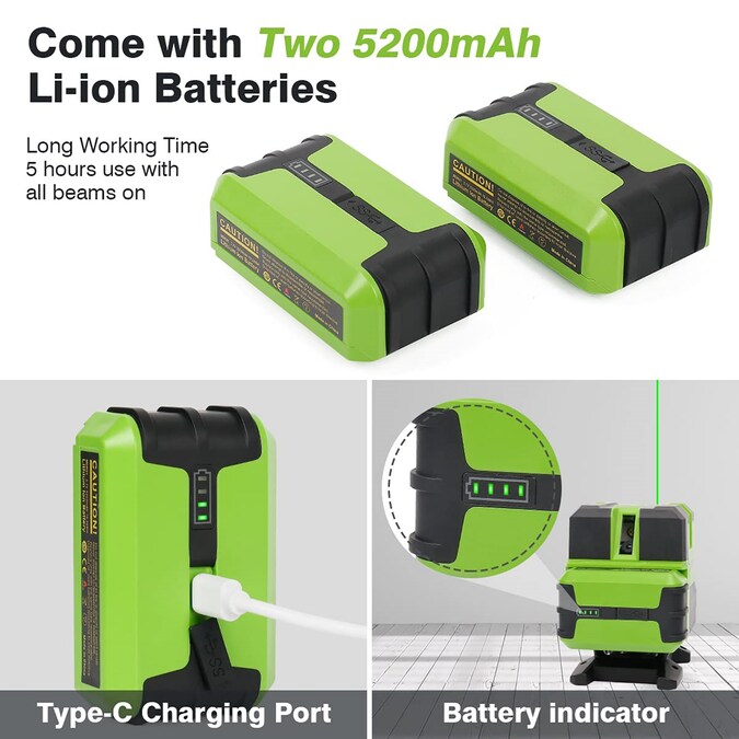 • EXTRA BATTERY & TYPE-C CHARGING PORT: Huepar LS41G laser level comes with 2 5200mAh Li-ion batteries for convenient replacement and continuous use, There is a Type-C charging port on the Li-ion battery pack that can be charged separately.
