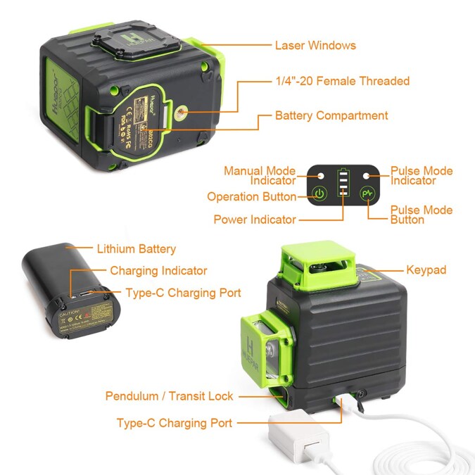 - Dual Power Methods & Type-C Charging Port: The Laser Level employed a large capacity of 3.7V / 5200mAh lithium battery and provides up to 8 hours of running time, can be plugged in and utilized on the job site after the battery is removed.