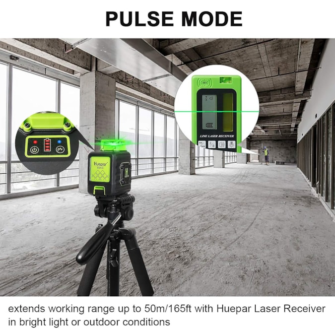 - Brighter Green Laser & Outdoor Pulse Mode: This cross line laser adopts the bright Osram’s green laser unit, With the Huepar line laser detector, the laser range can be extended up to 200 feet by pressing the pulse mode button.