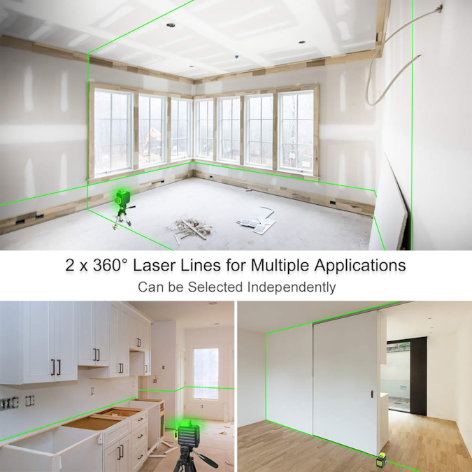 - 2 x 360° Line Lasers: The laser level B02CG projects two 360° laser lines cover the floor, wall, ceiling around the room, The horizontal line, vertical line and combined laser lines can be selected individually depends on job site applications.