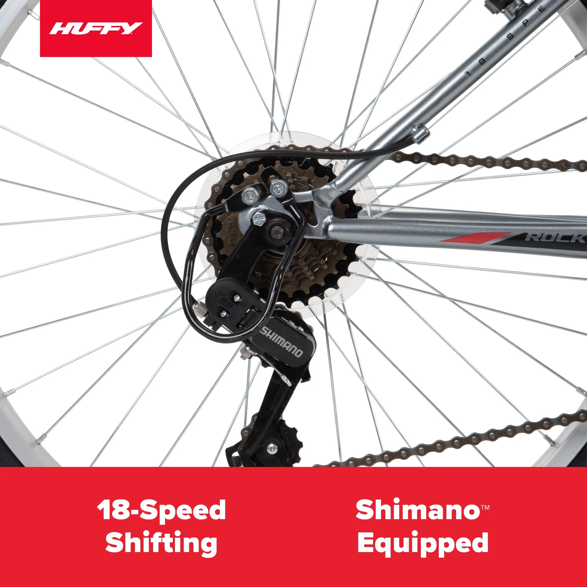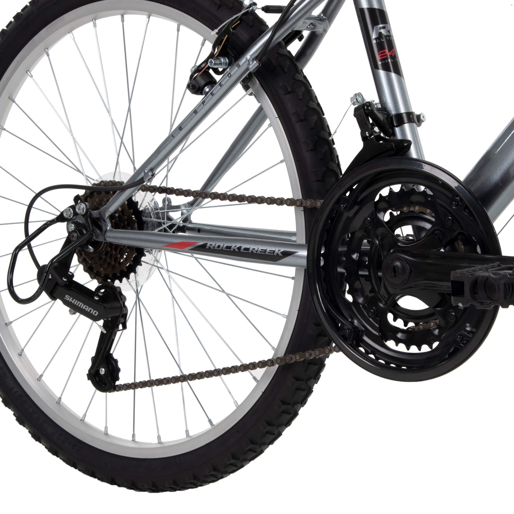 Huffy Rock Creek Mountain Bike, 24″ Wheels, Adult Ages 13+, 18-Speeds, Grey The Huffy Rock Creek 24-inch Mountain Bike in silver combines a hardtail frame, great style and the right specs to have a blast over bumps on paved trails or rides around the neighborhood. Smooth 18-speed index shifting system with a Shimano rear indexed derailleur consistently shifts between gears for quick adjustments venturing uphill or accelerating on level ground. Plus, the front suspension fork responds as you ride for better control over curbs, potholes, and branches. The slim ATB saddle includes an alloy quick-release seat binder for easy adjustments to the right height, or to simply remove when needed. Lightweight aluminum rims and 3-piece steel crank improve performance for a solid ride. Kraton MTB grips add comfort for a great hold while you enjoy the great ride of the Huffy Rock Creek. From Huffy, We Make Fun!