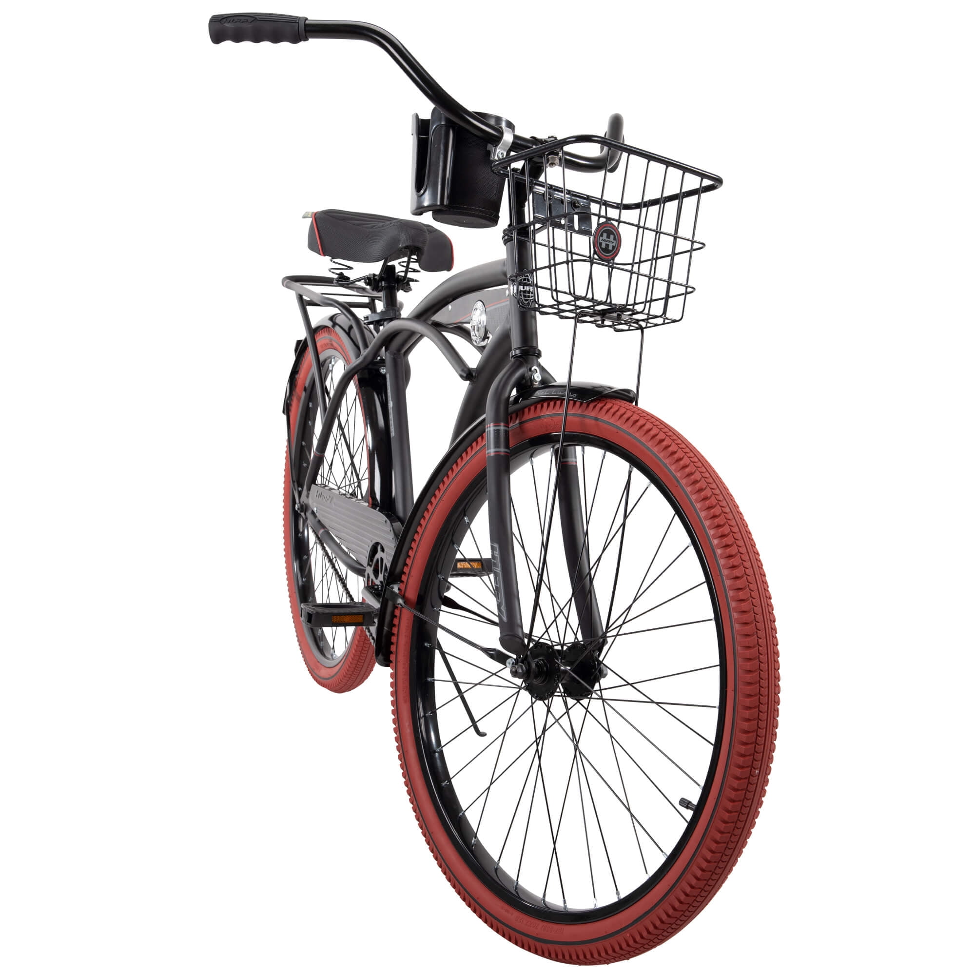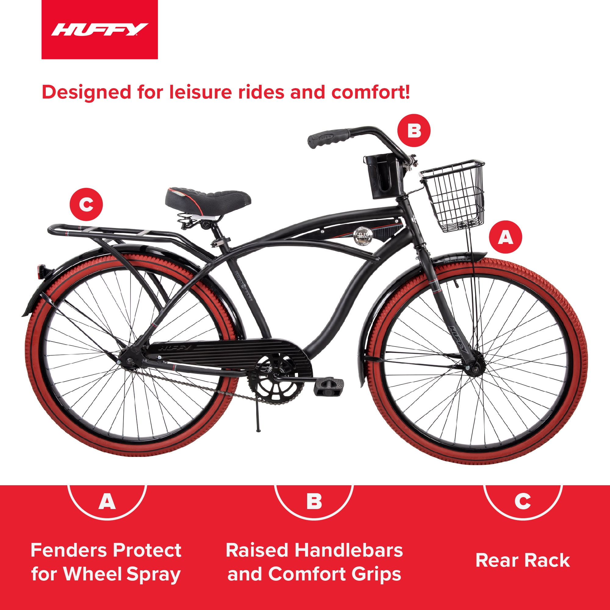 Comfortable: Padded spring saddle offers a smooth, enjoyable ride. Stylish: Matte black frame with classic cruiser style for timeless charm. Durable: Steel frame ensures lasting performance on flat terrain. Smooth: Coaster brakes provide easy and reliable stopping power. Relaxed: Upright riding position promotes comfort on leisurely rides. Grippy: Wide cruiser tires enhance stability and balance on any surface. Convenient: Handlebar basket, storage rack, & cup holder for small essentials. Age Group: Ages 13 years or older. Character Group: Cruiser Bike
