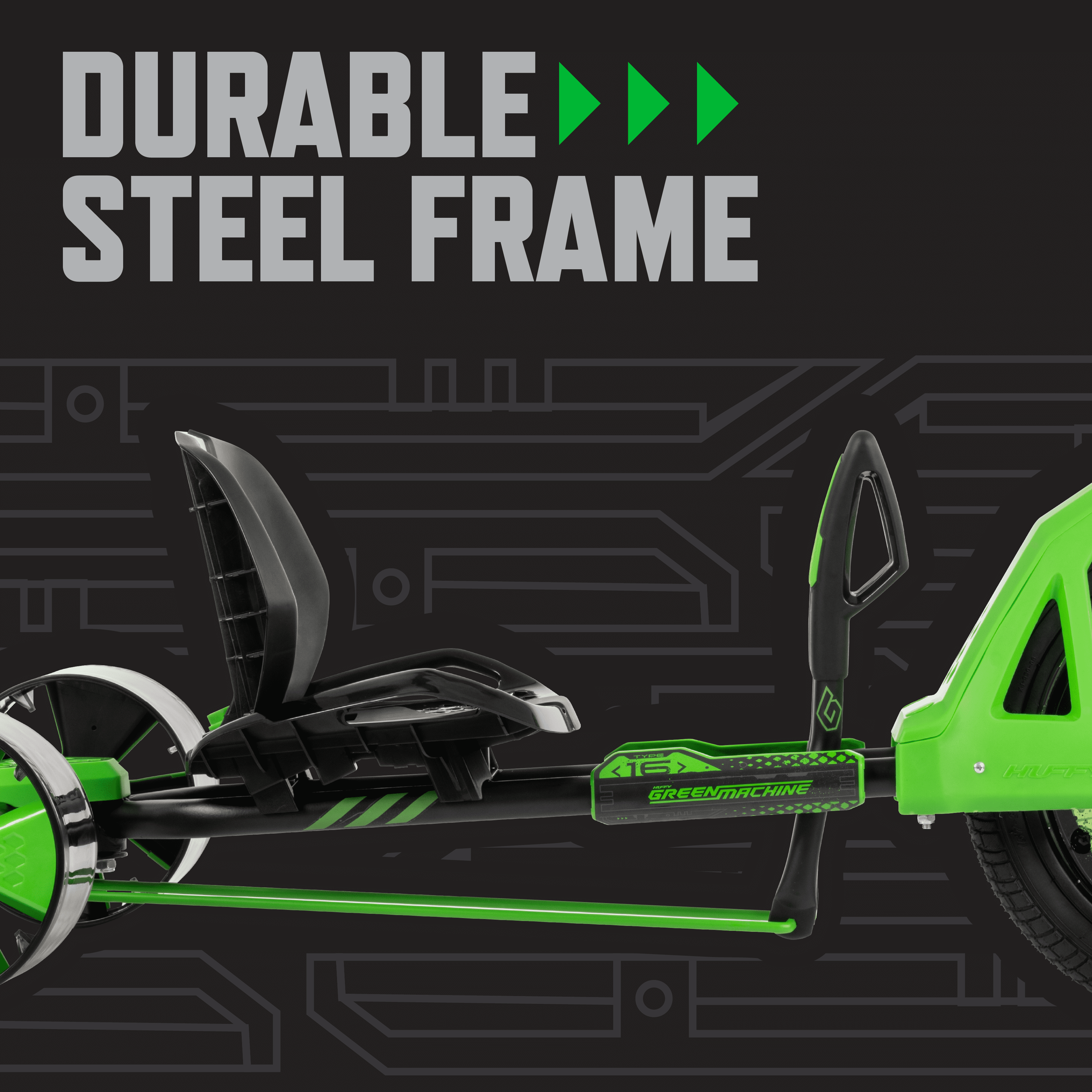 Huffy Adjustable Seat Unisex Kids Drift Trike, Green, 16″ This 16-inch Green Machine allows everyone to join in on the fun Ergonomic hi-tensile steel frame in black for durability and style Tool-free adjustable seat with 2 positions for the perfect fit Injection-molded rear wheels provide supreme drifting potential Dual steering levers make it easy to engage drifting power Coaster brakes ensure the rider remains in control Designed for riders ages 5-8 years old