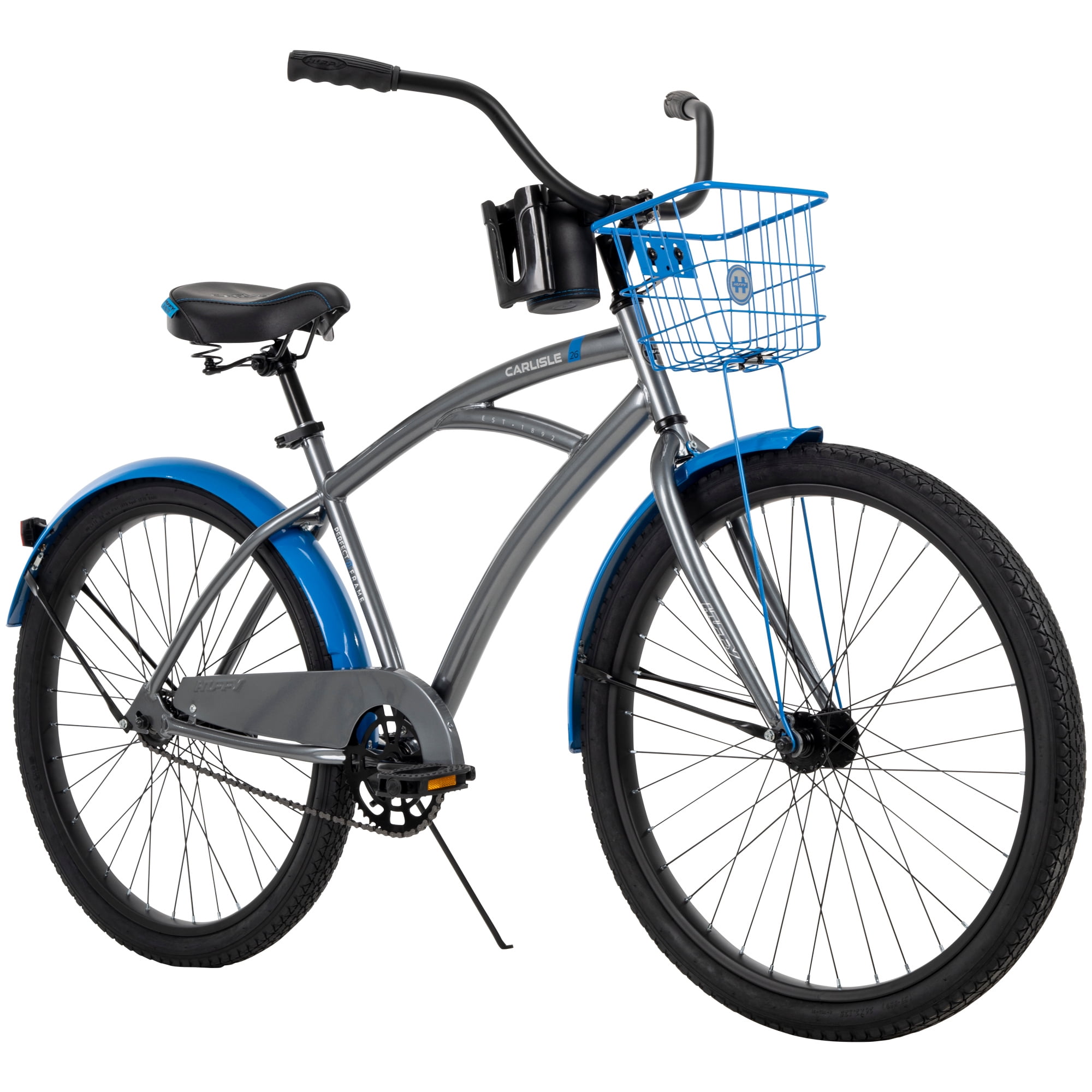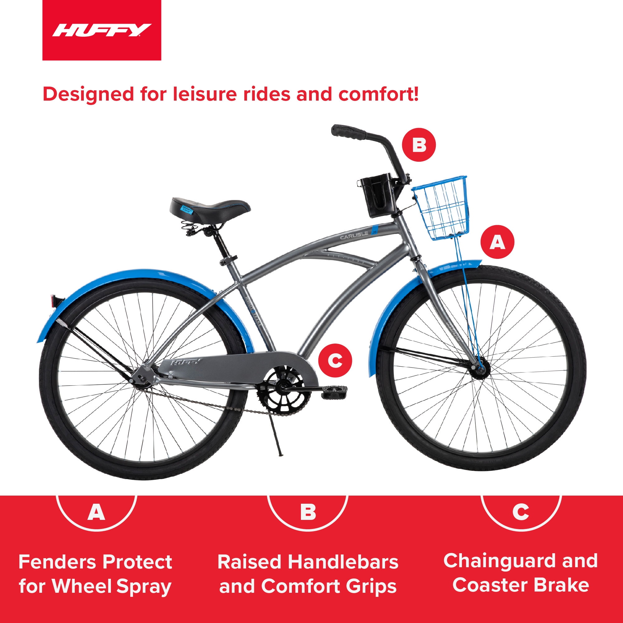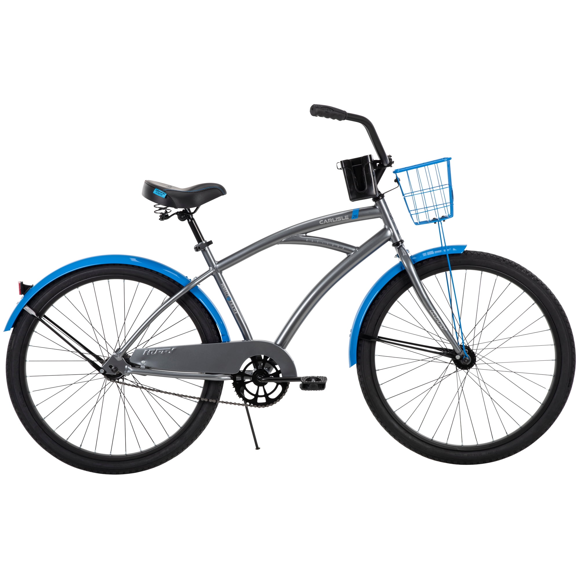 Huffy Carlisle Men’s Cruiser Bike, 26″ Wheels, Basket, Coaster Brake, Gray Huffy combines a sleek design with comfort features in the Carlisle men’s cruiser bike. This men’s bike comes equipped with great specs and a unique look. If you’re looking for a way to get outside for more leisurely exercise or exploring the neighborhood, this is the bike for you. The grey men’s bike with blue accents is designed with Huffy’s Perfect Fit frame, ensuring that every rider is comfortable throughout their adventure – the quick-release seat binder also makes it easy to adjust the saddle to the perfect height. This cruiser is a single-speed bike with an easy-to-use coaster brake, making every ride relaxing and enjoyable. Not to mention, the comfortably padded saddle and dual-density grips and pedals make every ride pleasant. Fun adventures are up ahead with the family or on your own thanks to the Huffy Carlisle Cruiser. From Huffy, We Make Fun!