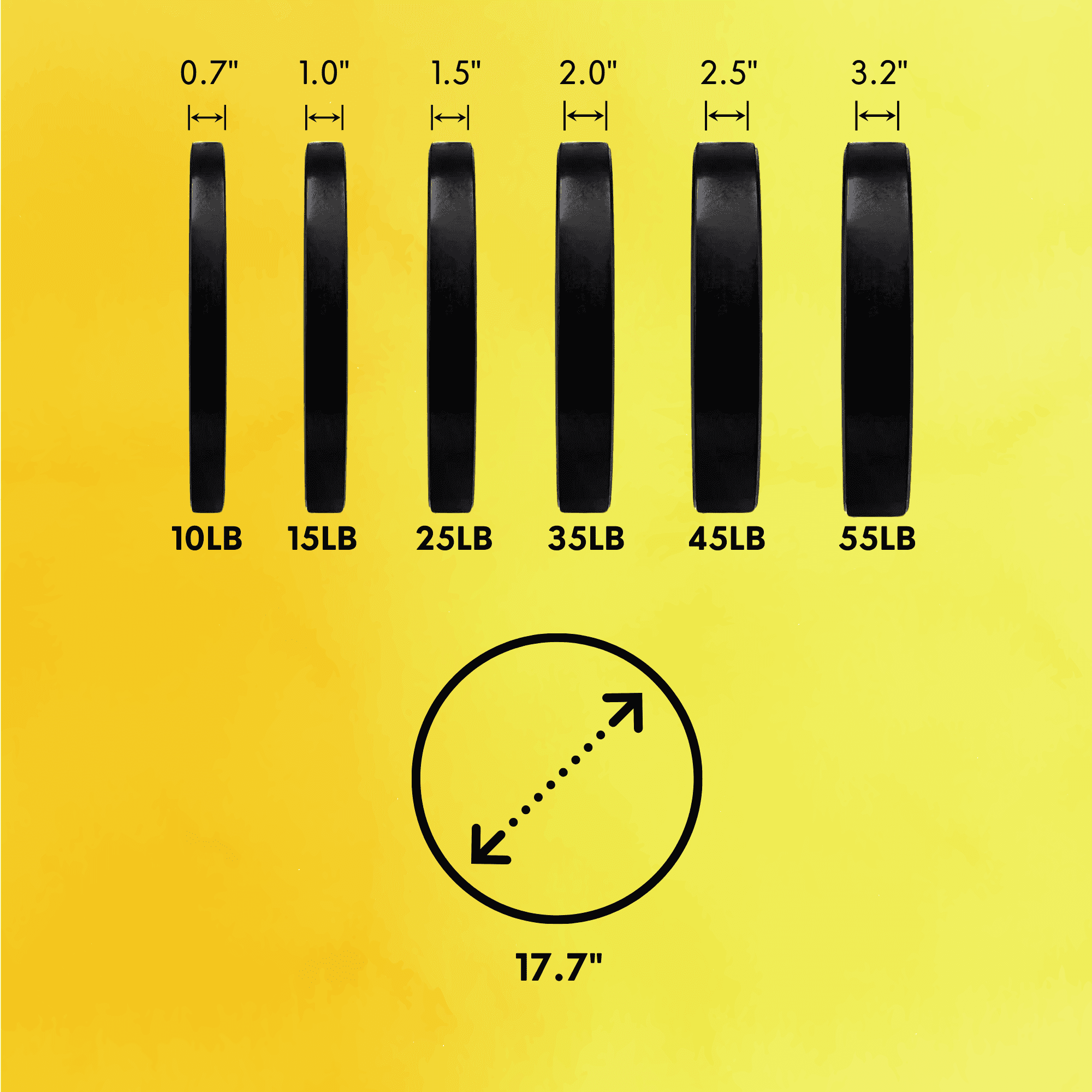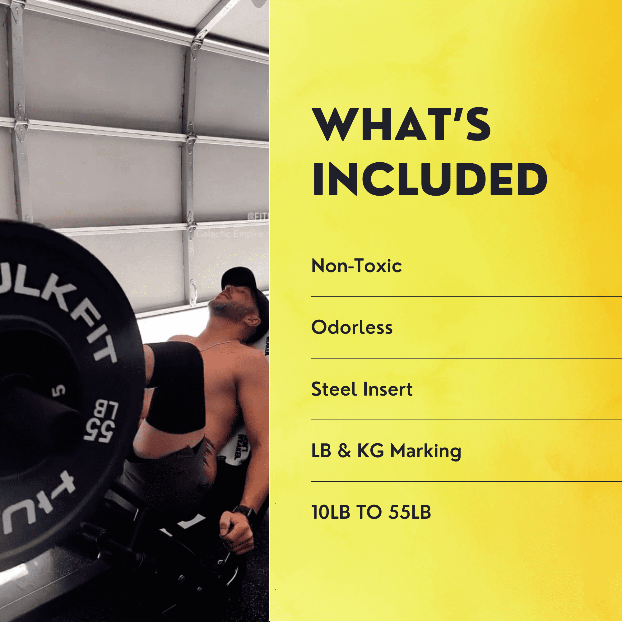 Elevate your home gym, garage gym, or athletic training with the HulkFit 2-Inch Sport Series Olympic Bumper Plates. These versatile weight plates are built for serious strength training, offering durability, protection, and versatility.Key Features:Eco-Friendly Construction: Made with a blend of virgin and recycled high-density rubber, these bumper plates are gentle on floors and the environment.Universal Compatibility: Designed with a 2-inch diameter stainless steel insert, the HulkFit plates fit seamlessly on all Olympic barbells (2-inch diameter or less). The bumper plates set (each sold separately) feature 17.75-inch diameter.Clear Weight Identification: Dual weight markings in pounds (lbs) and kilograms (kg) ensure you can easily select the right weight for your workout.Enhanced Grip: The raised edge design provides a secure hold for weight plate exercises (without barbells).Reduced Bounce: The high-density rubber construction minimizes bounce after drops, protecting your equipment and minimizing noise.Perfect for a Variety of Exercises:Strength Training: Bench press, squats, lunges, deadlifts, and more.Olympic Weightlifting: Cleans, snatches, jerks.Bodybuilding: Build muscle mass and definition.Martial Arts: Enhance power and explosiveness.Pair Up for a Complete Workout:These HulkFit bumper plates are compatible with a wide range of HulkFit equipment, including barbells, dumbbells, kettlebells, and weight storage racks (all sold separately).Invest in your health and fitness with the HulkFit 2-Inch Sport Series Olympic Bumper Plates!SpecificationsCollar diameter – 2”Weight Plate diameter – 17.75″*** NOTE – 10 lb plates and 15 lb plates are NOT designed to be used ALONE. The 10 lb and 15 lb weight plates are thinner and are meant to be used in conjunction with the larger weight plates to prevent bending on the 10 and 15 lb plates. Otherwise, you may incur damage if used alone. ***