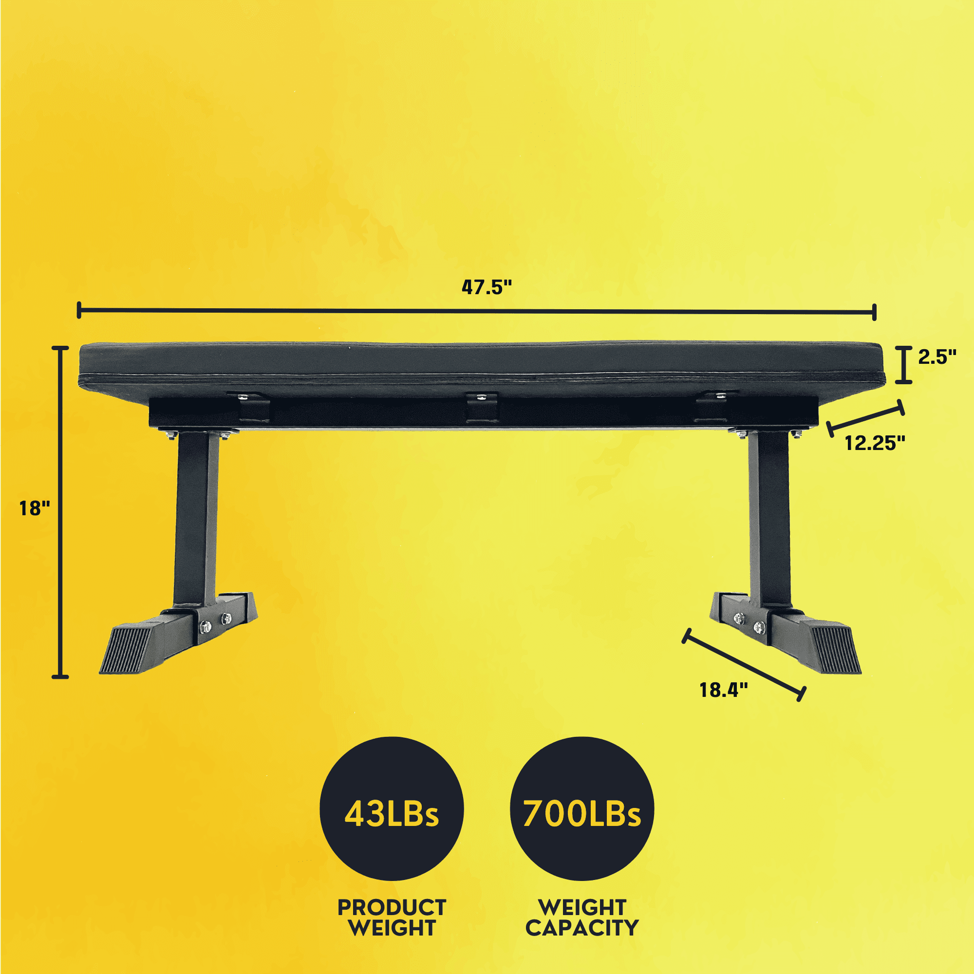 Purpose – Add our standard weight training bench for your home or garage gym to complete your fitness equipment set up. The purpose of our bench is to increase the comfort of your workouts and exercise routine. Features shock absorbing, anti-slip padded feet and high density foam top (most are 1” to 2” thick and our’s is 2.5” thick). Usage – Develop upper body strength with bench presses, rows, and add new exercise routines to improve your overall fitness regimen. It is lightweight and easy to move around your space. Like all fitness equipment, we recommend using it on a protected surface to avoid damage to your floor. Materials – Heavy-duty, solid steel frame with a powder coated finish. Foam padding with a faux leather top. Rubber feet. What’s Inside – (1) Flat Bench. Includes Hardware and Instructions. Product Specifications – Total Dimensions 47.5” x 18.4” x 18.25”. Padded Bench Top Dimensions 47.5” x 12.1” x 2.5”. Shock Absorbing Feet Dimensions 18.4” x 1.9”. Total Product Weight 43 lbs. Total Weight Capacity 700 lbs.