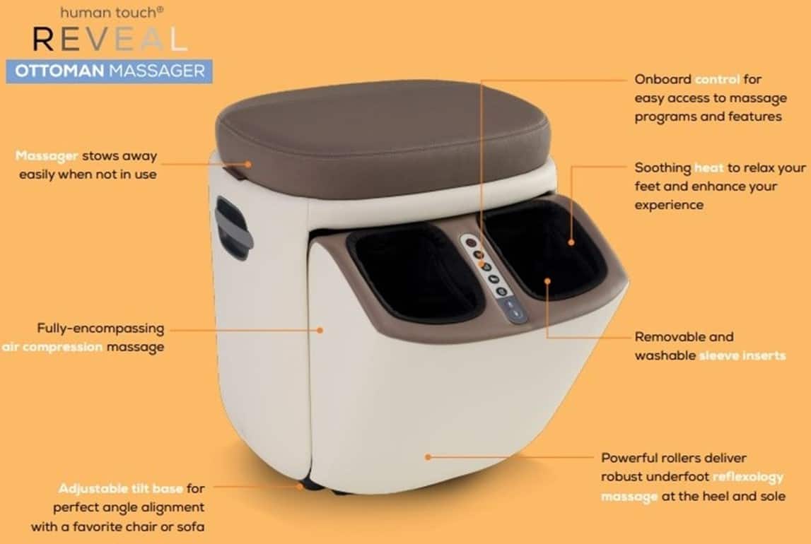 The Reveal Ottoman Massager provides the ultimate relaxation experience. Immerse yourself in the fully-encompassing air compression massage that revitalizes tired feet, expertly guiding blood towards the core for improved circulation. Reveal goes beyond ordinary massagers, offering soothing benefits enhanced by holistic reflexology massage. This innovative massager seamlessly transforms from a stylish ottoman into a powerful massager, ready to elevate your recovery routine. Transform your moments of rest into a celebration of well-being, where style meets soothing massage perfection—because you deserve Your best. Every day.