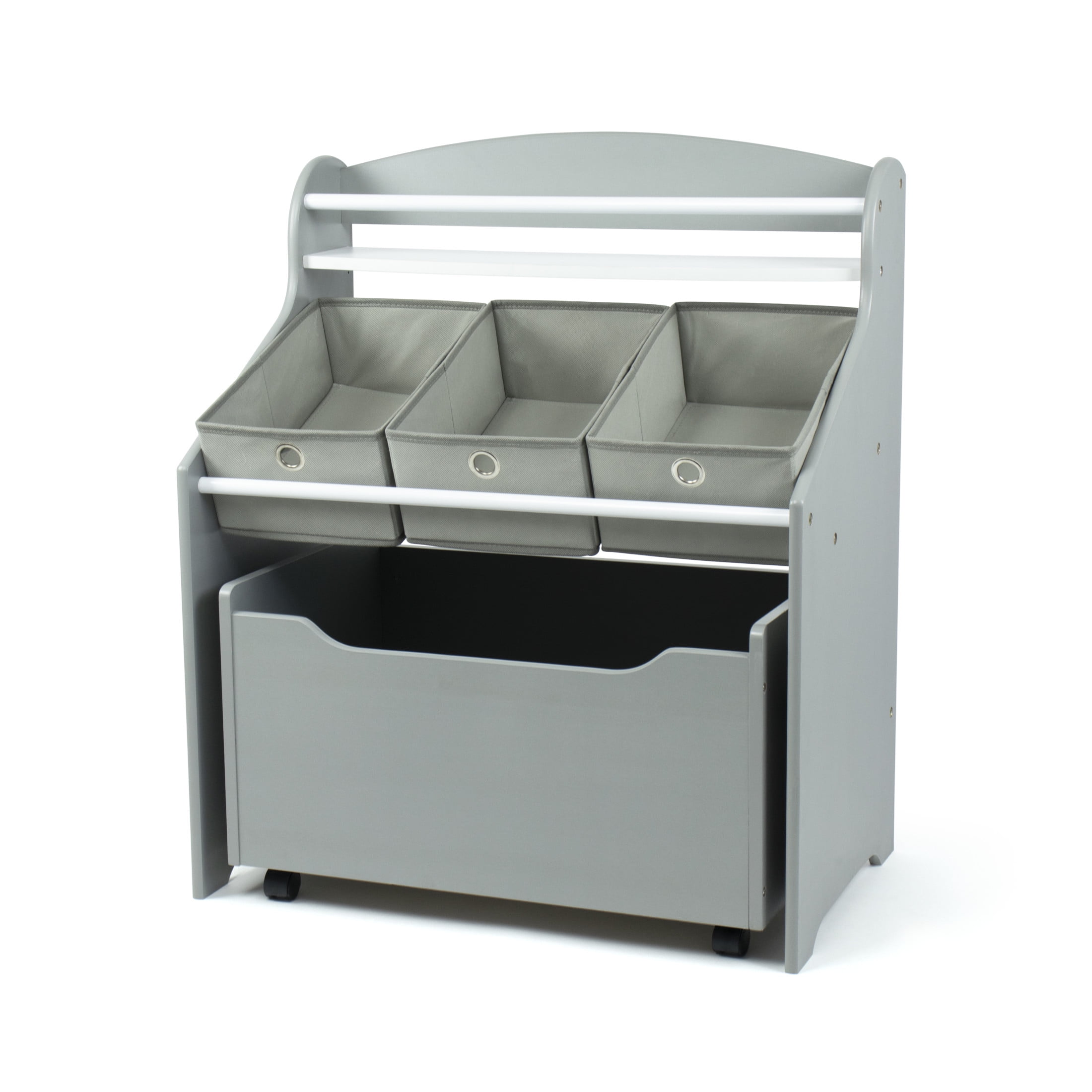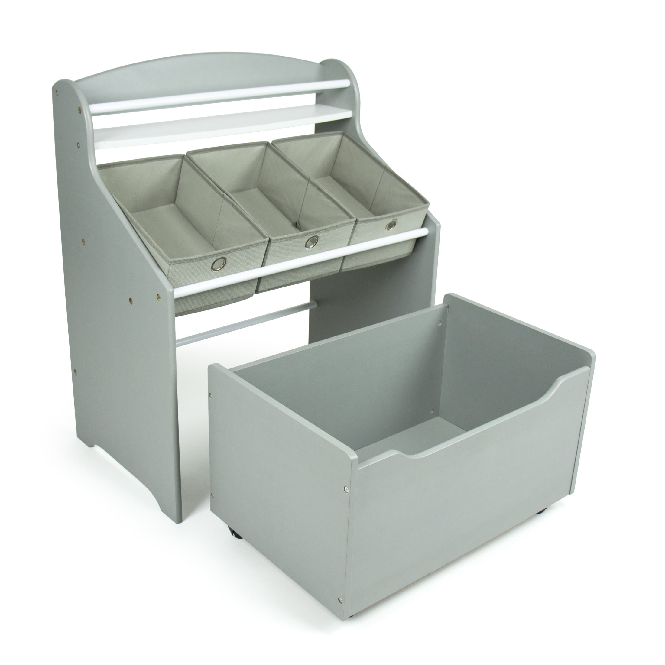Features top ledge for small books, 3 collapsible fabric toy storage bins and a large rolling toy box. Removable toy storage bins for playtime make clean up easy too. Sized just right for toddlers and preschool aged children. Product dimensions Overall: 25″W x 15″D x 30″H, Rolling toy box: 22″W x 14″D x 13″ H, Fabric Bins 8″W x 12″D x 5″H, Top shelf: 5″D Sturdy construction: steel dowels support fabric toy bins and engineered wood in modern grey finish is durable and easy to clean. Stylish multifunctional use, suitable for the playroom, kids room, nursery, living room, doctor offices and more. Easy to assemble. Includes all hardware.