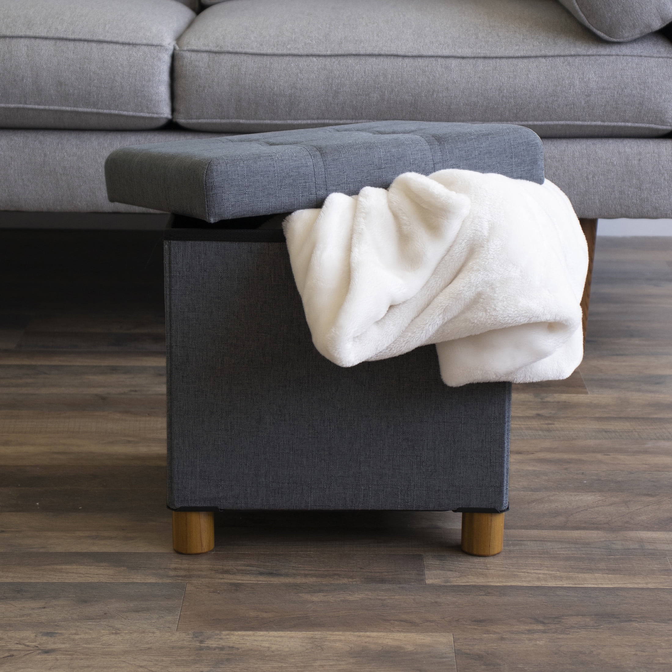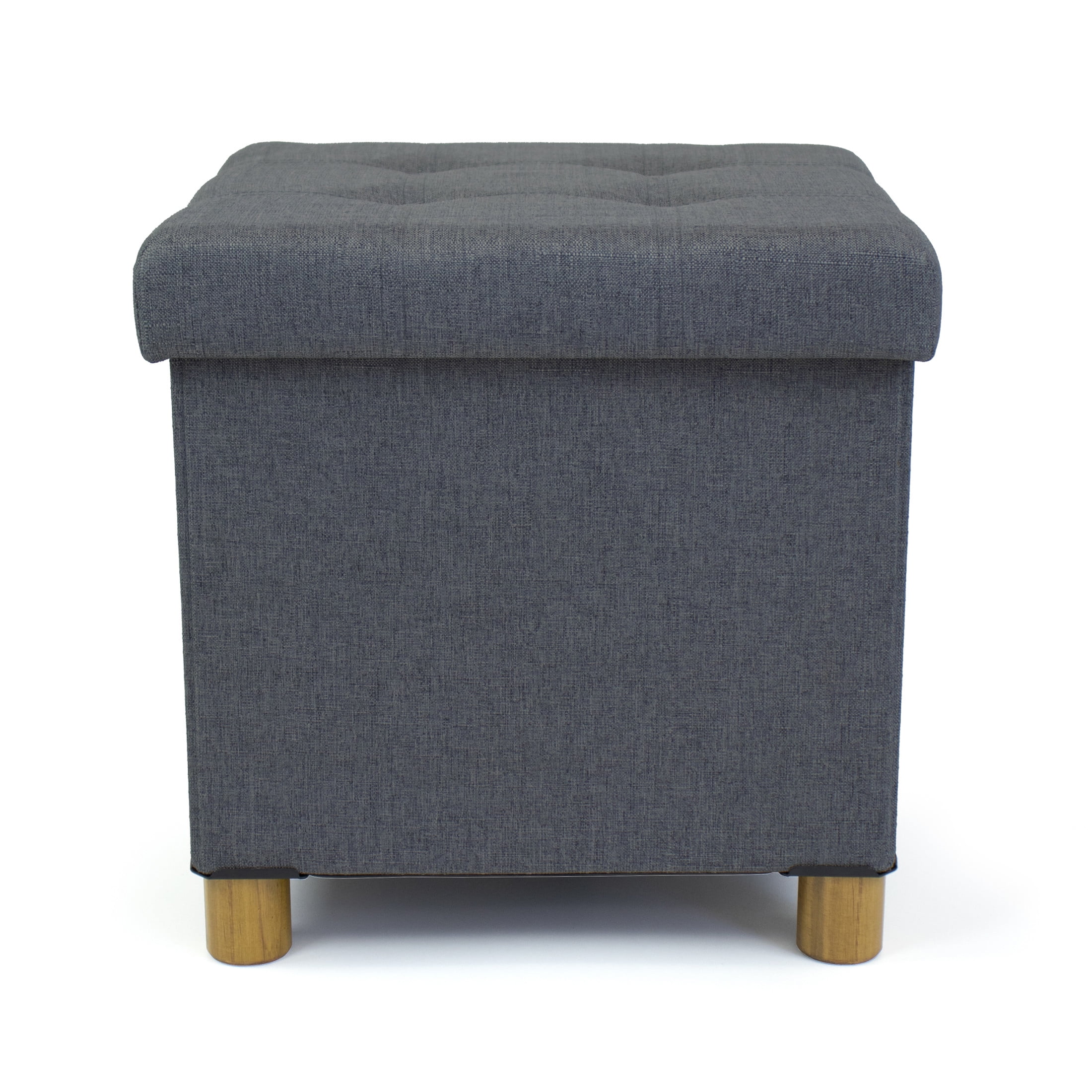 Collapsible dark grey upholstered ottoman folds away flat for storage in closets or under beds, sets up in seconds. 2-in-1 removable double-sided lid features a tufted foam padded cushion side to provide comfort and support when used for additional seating; flip it over to the flat wood surface and it becomes an end table. Spacious interior storage compartment ideal for blankets, linens, magazines, books, remote controls, electronics, toys and much more. Perfect for dorms, living rooms, bedrooms and small apartments. Ideal size for use as a stool or comfy padded footrest while adding storage space. Product dimensions: 15″W x 15″D x 15″H Durable MDF structure and solid rubber wood legs support up to 180lbs. Easy assembly. All hardware included.