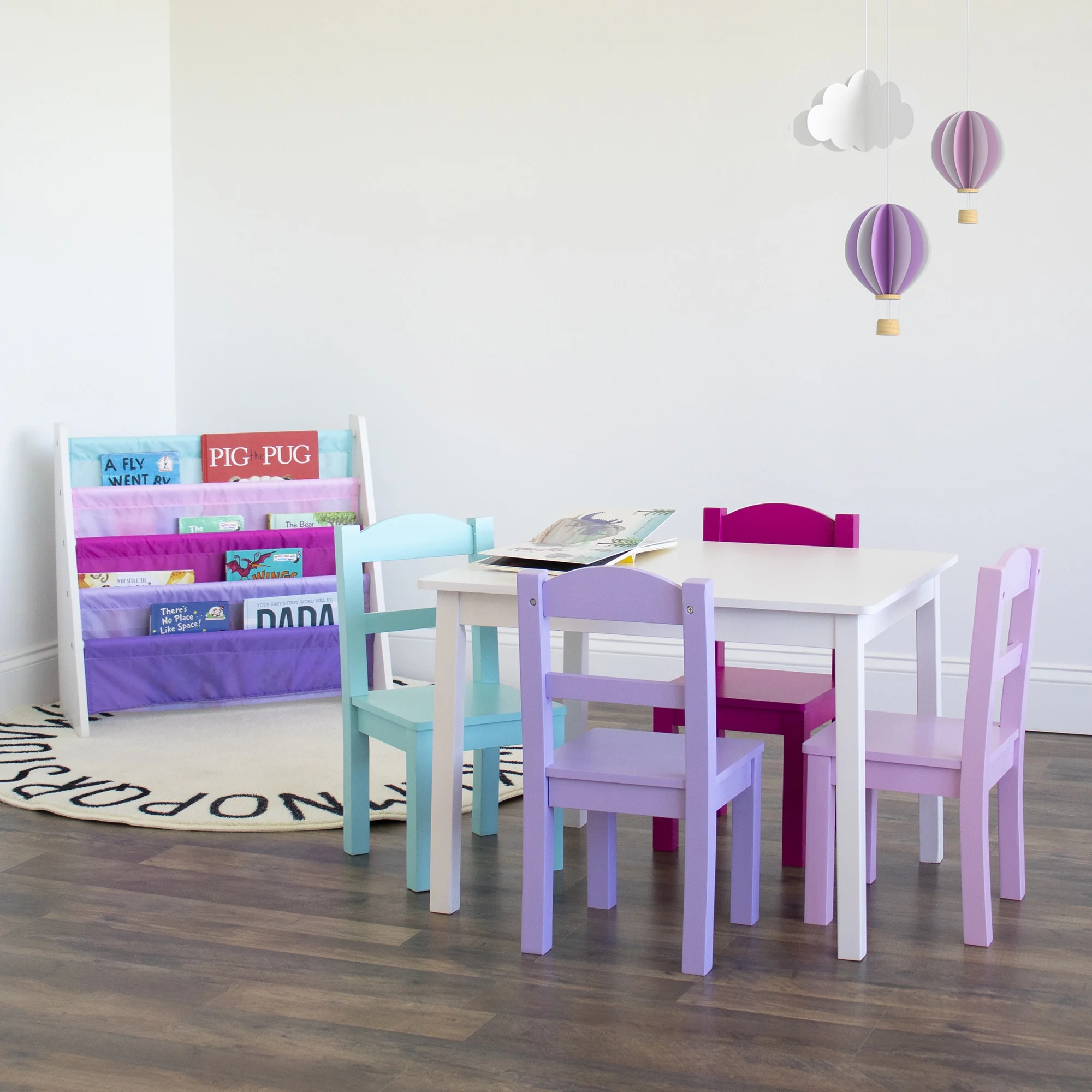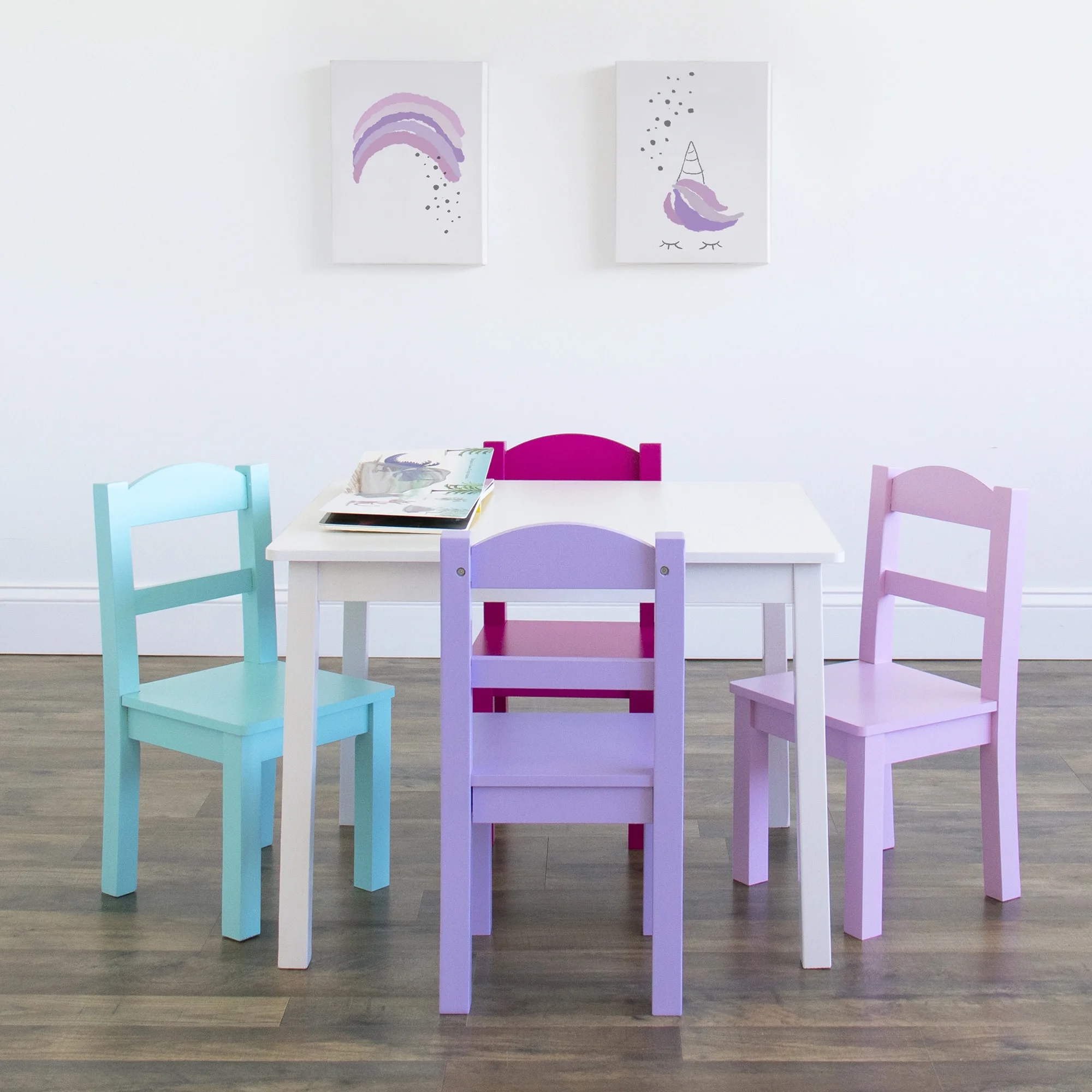 Perfectly sized to meet your growing childs needs, the Humble Crew 5-Piece Toddler Wood Table and 4 Chair Set is sturdy, stylish and simple to clean. This set can be used as a homework study desk, an arts and crafts activity center, or a board game table to encourage screen free play. It is also a great homeschooling solution for students doing remote learning or online school from home. Create a dedicated quiet space for young learners to store their school supplies and tablet chargers within reach so they can do homework or schoolwork without distractions. The height of this furniture is just right for toddlers and preschool-aged children; giving your little one a kid’s table and chair set at their size gives them a sense of control and helps them learn independence. From snack time to playtime this set will quickly become your little one’s very own favorite spot in the house to draw and color, read, do puzzles, host tea parties, play cars and trucks, and more. The set includes a rectangular table and four chairs in a stylish colorway sure to complement your home’s existing furniture whether it be in your toddler’s bedroom, kids’ playroom, kids’ rooms, or the living room. This kid’s furniture set is easy to assemble with all hardware included. The sturdy table and chairs feature solid wood legs for additional support and long-lasting durability, ideal for boys and girls aged 3-6 years. Product Sizing Table Height: 19″ Table Top: 22″W x 26″D Chair: 10″W x 10″D x 20″H Chair Seat Height: 10″ Each chair holds up to 50 lbs.