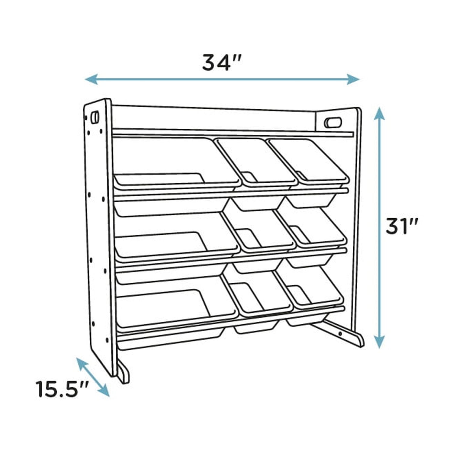 Playtime is more fun when your kids can easily take out their toys, books and games and then quickly clean up afterwards. The space-saving Humble Crew Toy Storage Organizer with Shelf and 9 Storage Bins stows your children’s toys in easy-to-see, easy-to-access BPA and phthalate free plastic storage bins. 6 standard and 3 large storage containers are easy to remove, replace and reposition along the 3 tiered shelvessized just right within the toy organizer for toddlers and preschool-aged children. The top ledge on this kid’s storage unit is the perfect space to display books, dolls or other favorite small toys, pictures and other decorative items, providing an additional level of easy-to-see and easy-to-access open storage for your convenience. It makes a great toy box storage alternative, helping keep your little ones room clean and organized while at the same time teaching sorting and cognitive skills. The stylish all white wood finish with pink, purple and turquoise storage bins make this the perfect organizational solution for bedrooms, nurseries, playrooms and classrooms. Made with a sturdy engineered wood construction frame and steel shelving rods, each level can hold up to 20 pounds. Some assembly is required and all hardware is included. Product sizing 34″W x 15.5″D x 31″H Standard bin sizing: 12″L x 9″W x 6″H Large bin sizing: 16″L x 12″W x 6″H Additional plastic storage toy bins are also sold separately.