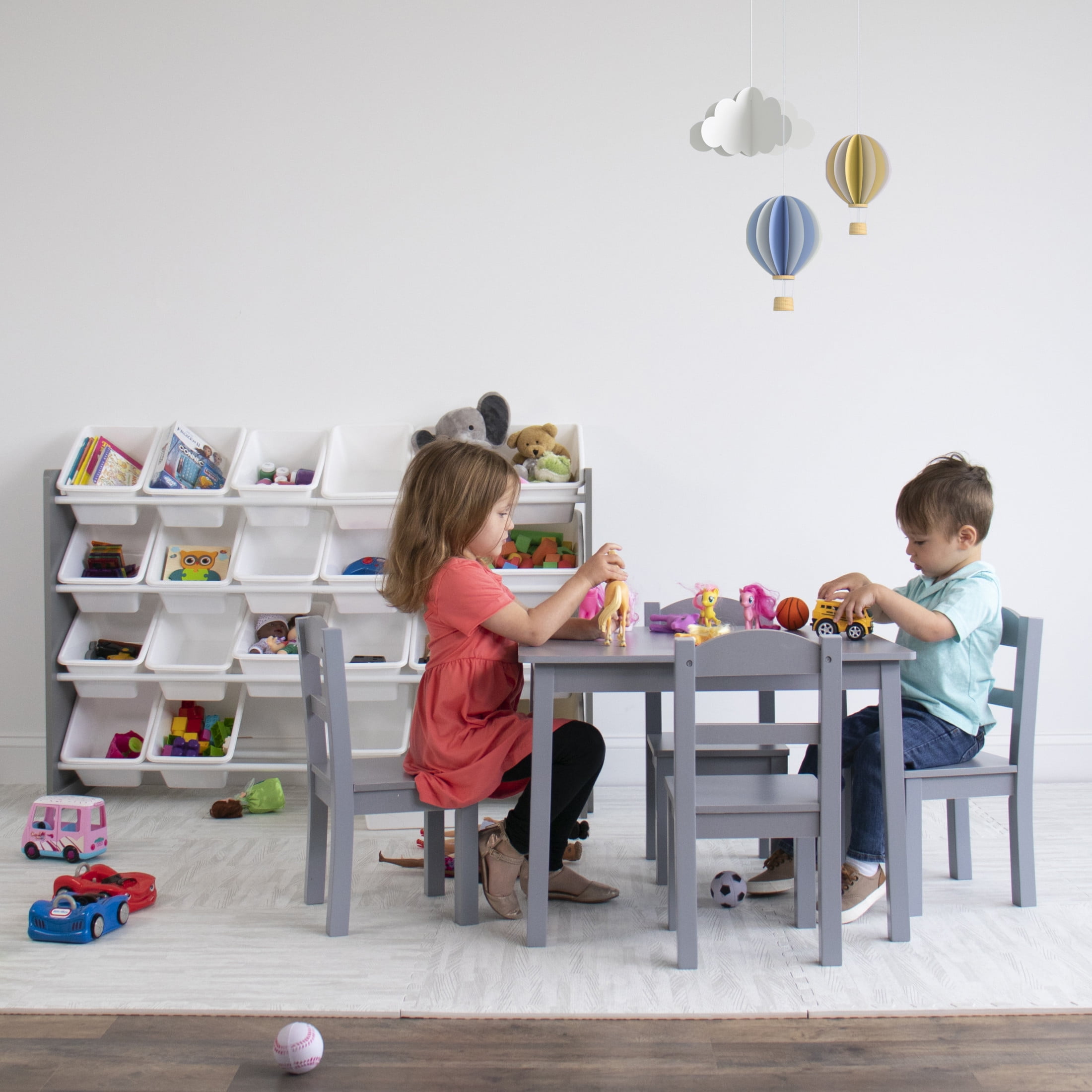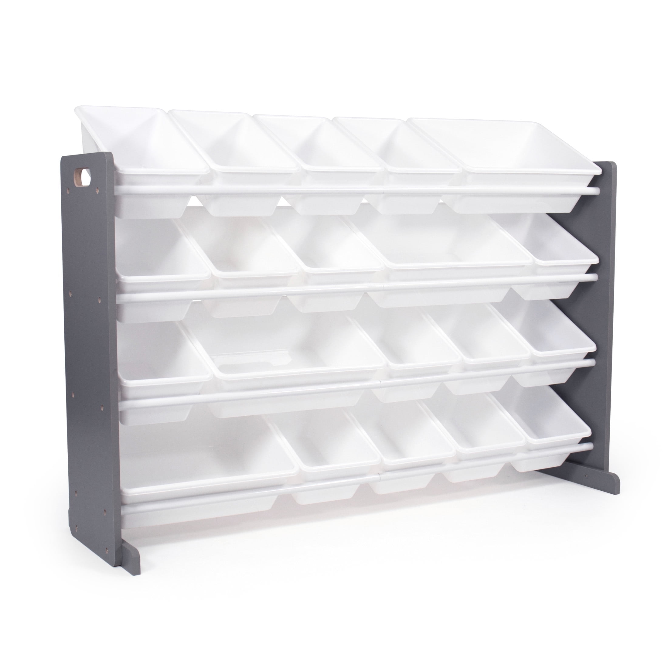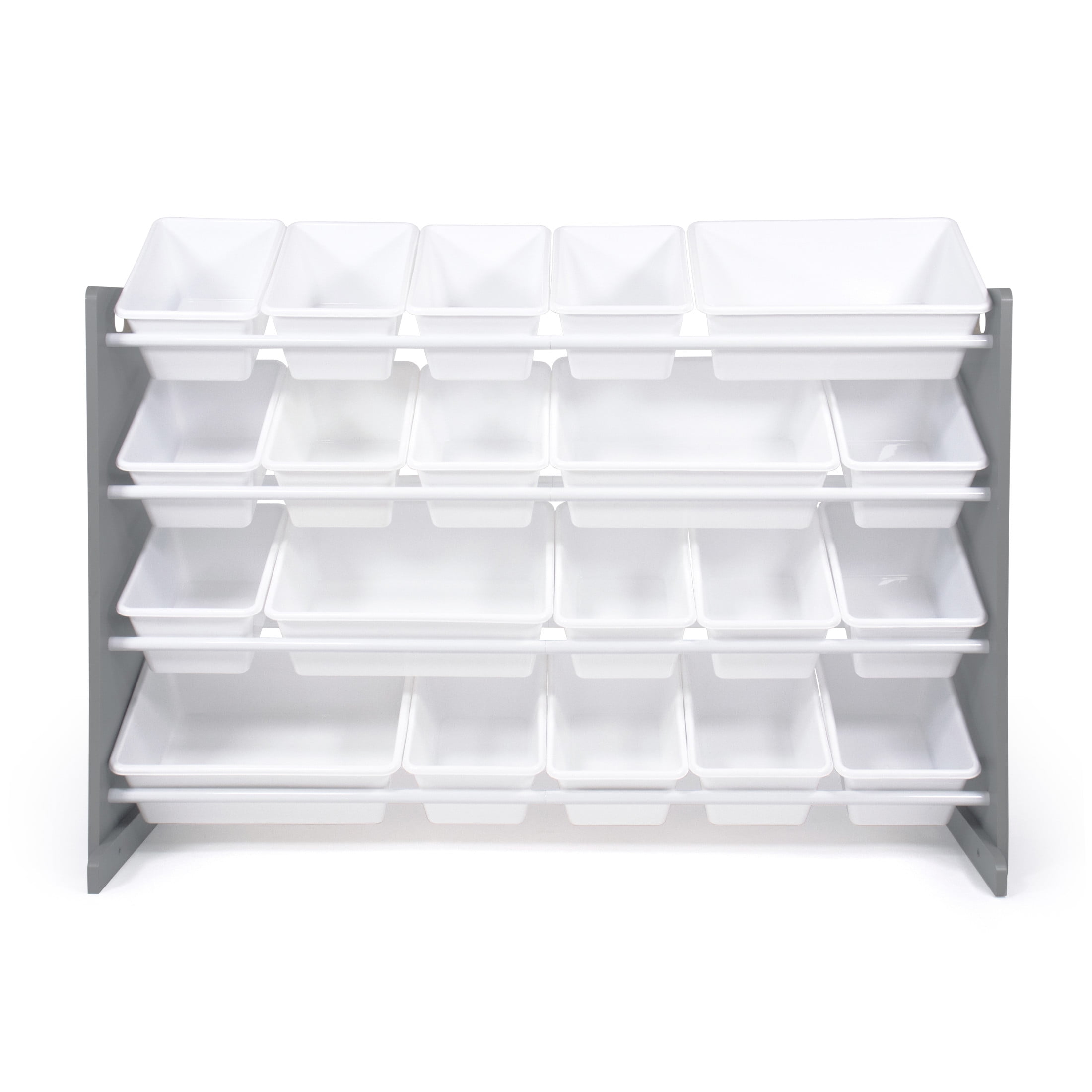 Playtime is more fun when your kids can easily take out their toys, books and games and then quickly clean up afterwards. The space-saving Humble Crew Extra Large Toy Storage Organizer with 20 Storage Bins offers 40% more storage than the leading organizer and is ideal for organizing your closet, play space, pantry, office, mudroom, child’s bedroom, playroom, nursery, living room and more. The 16 standard and 4 large colorful storage containers are BPA and phthalate free and easy to remove, replace and reposition along the 4 tiered shelves. These storage bins are sized just right within the toy organizer for toddlers and preschool aged children but are versatile enough for use by adults as well. This organizer is a great toy storage box alternative and the stylish grey and white colorway makes it the perfect organizational solution for any room in the home. Made with sturdy engineered wood construction frame with stabilizing braces and steel shelving rods, each level can hold up to 20 pounds. Some assembly is required and all hardware is included. Product sizing- 50″W x 11″D (15.5″D with stabilizing braces) x 31″H Standard bin sizing: 12″L x 9″W x 6″H Large bin sizing: 16″L x 12″W x 6″H Additional plastic storage toy bins are sold separately.