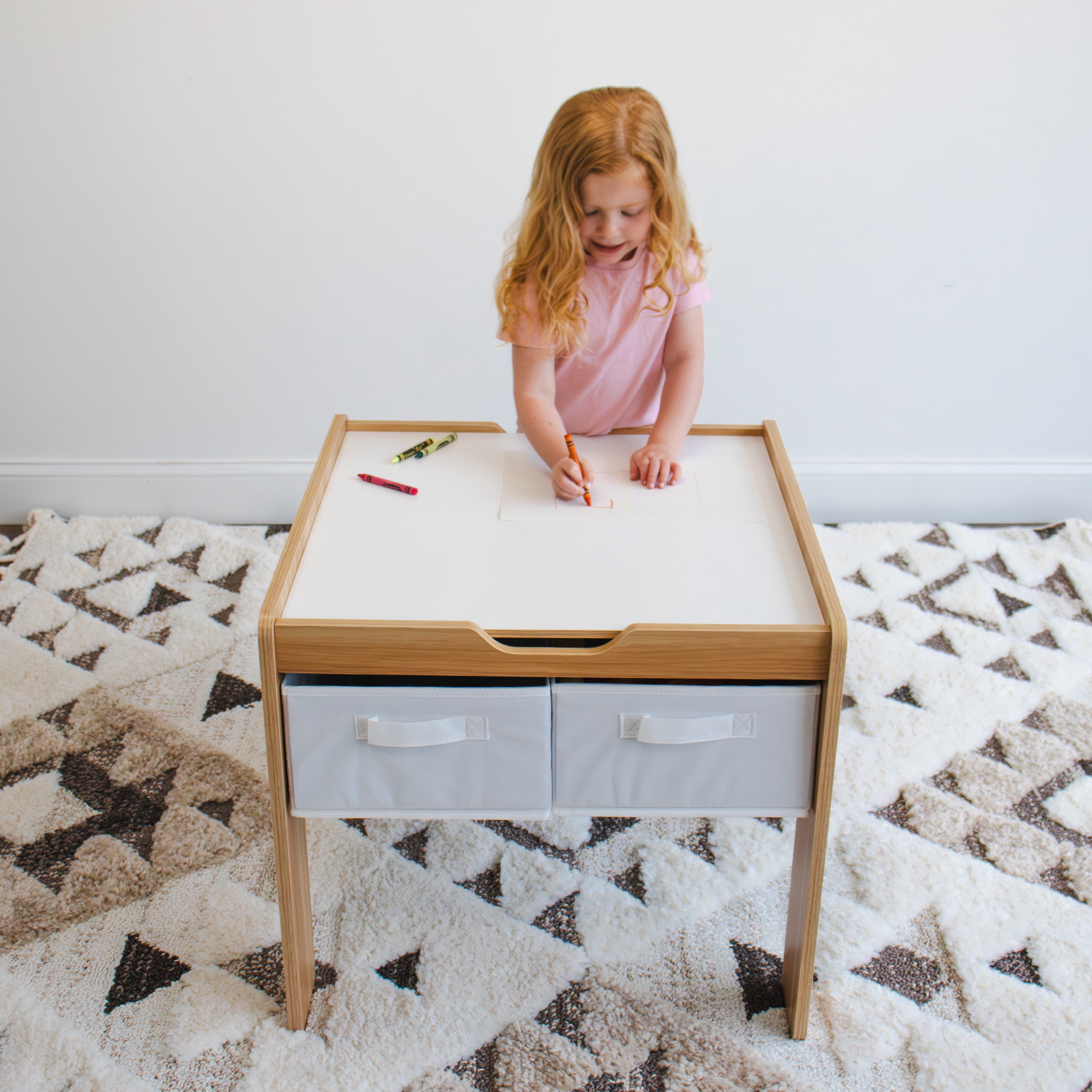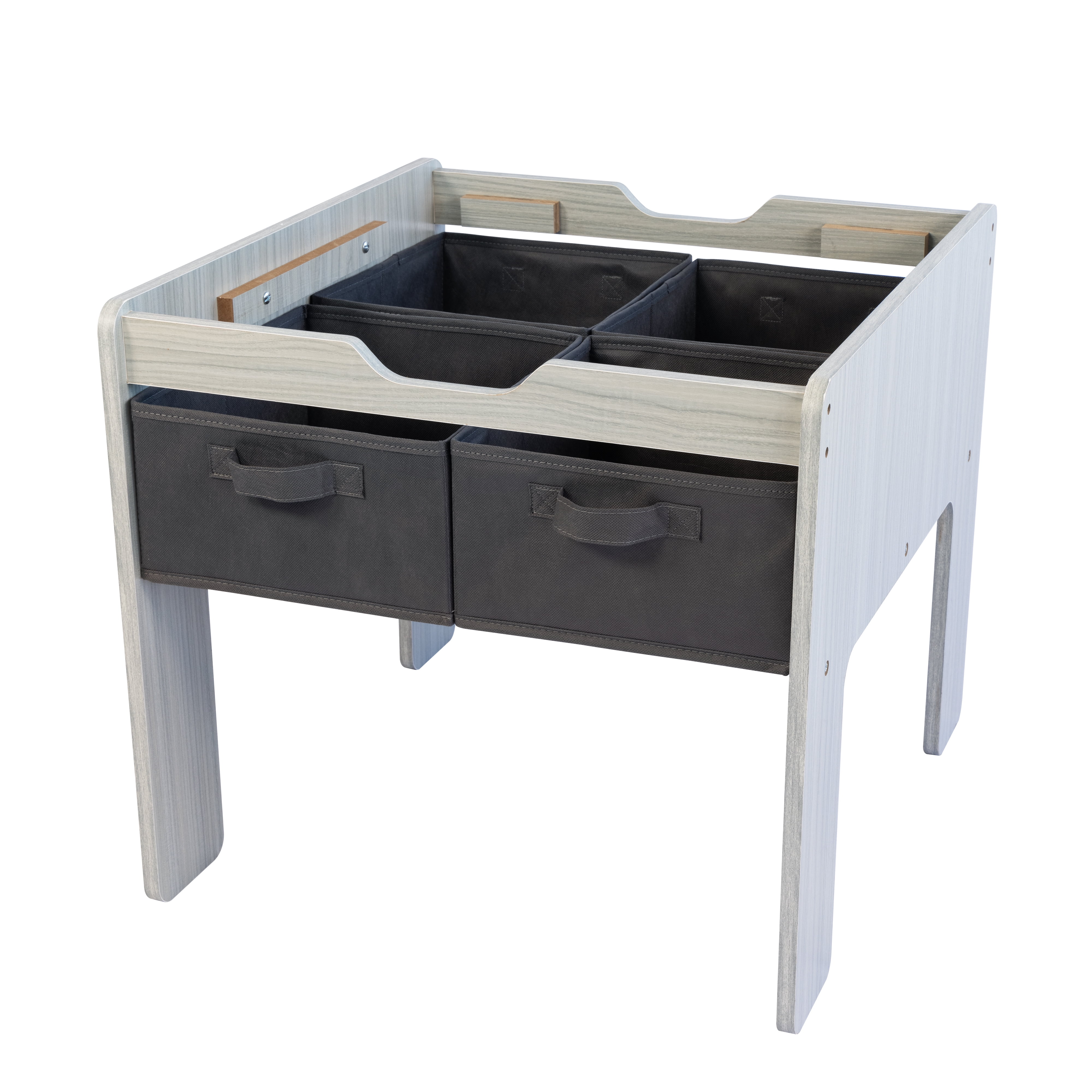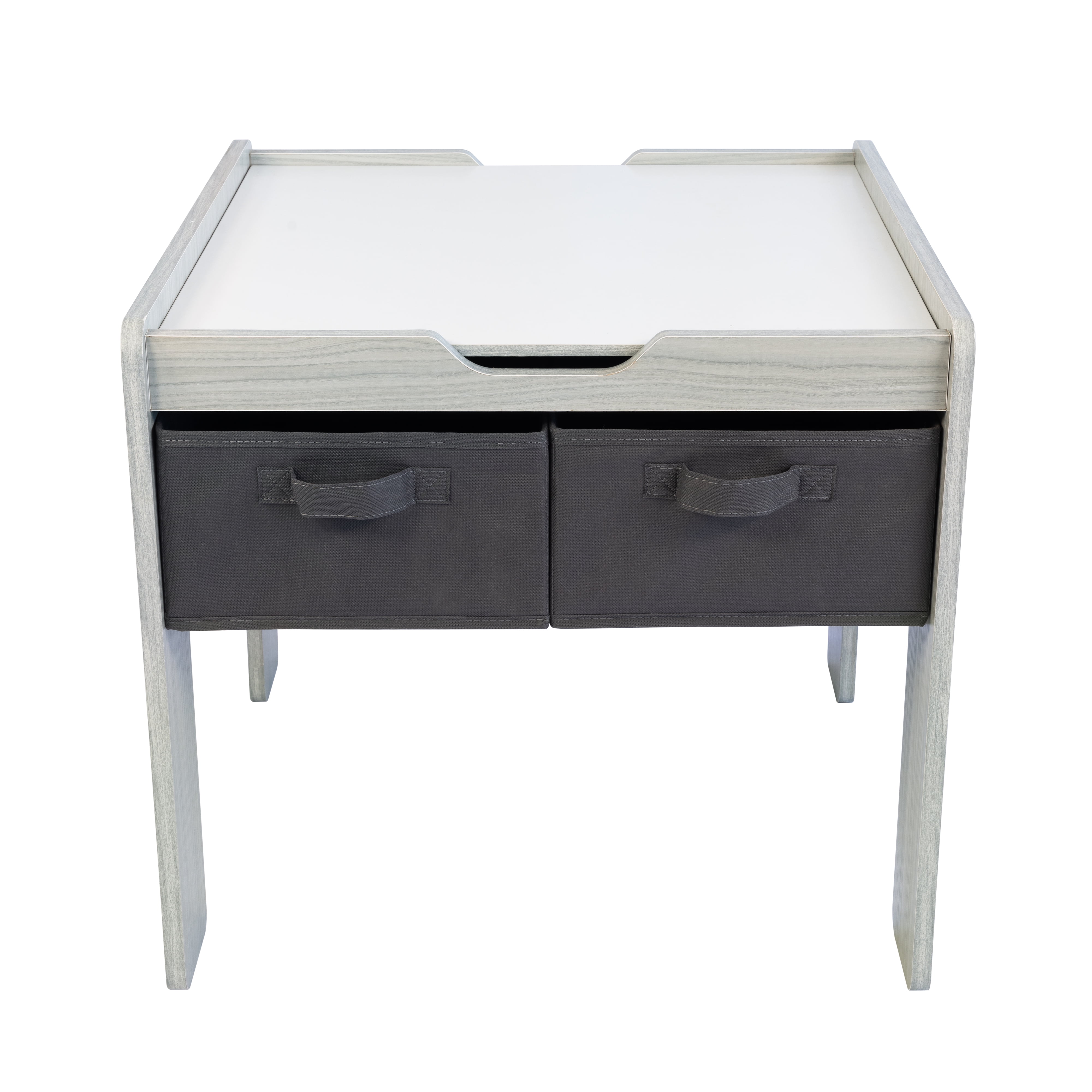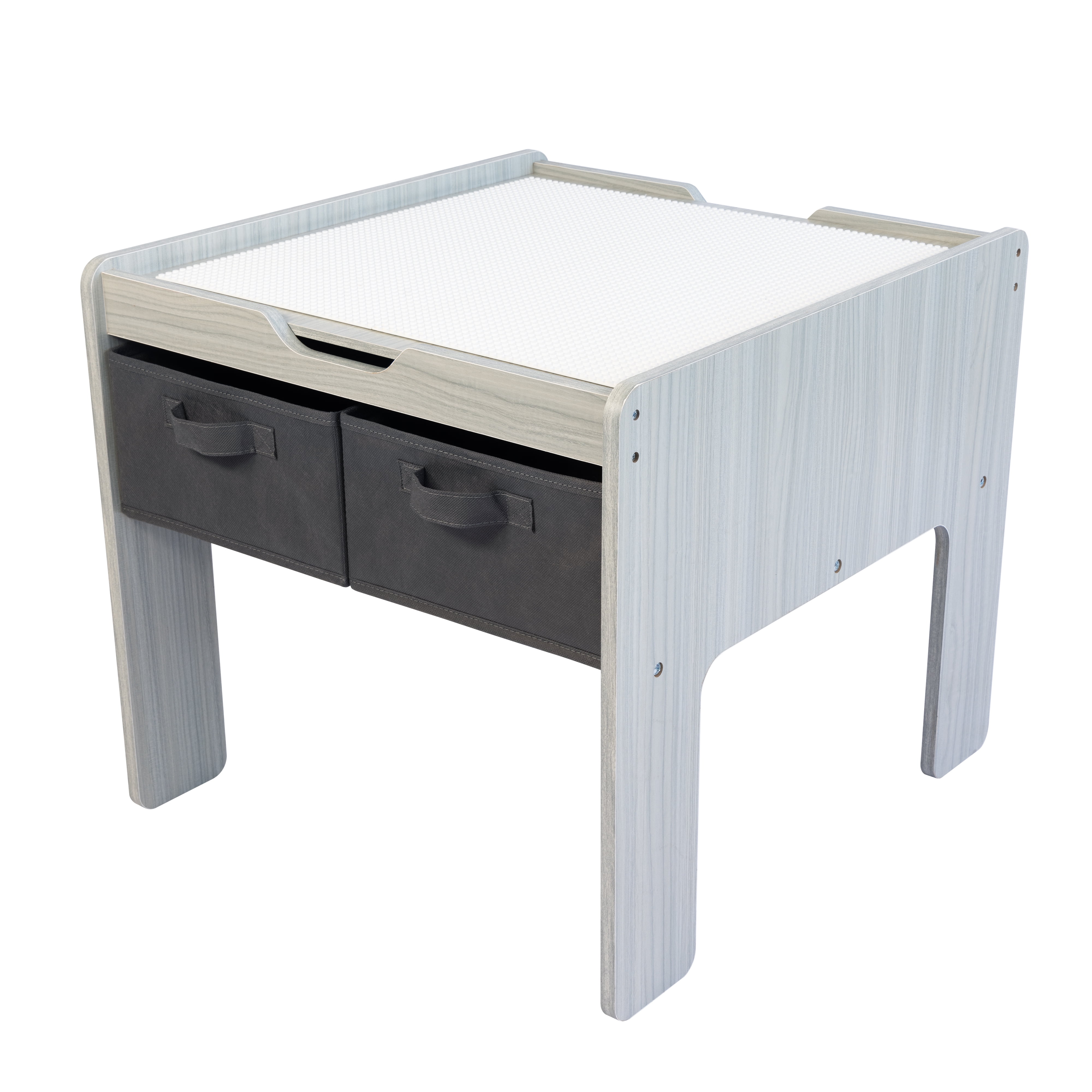 Encourage creativity and imagination with the Humble Crew Journey Toddler 2-in-1 Building Blocks-Compatible Wooden Activity Table with 4 Storage Bins,. This versatile toddler table features a two-sided plastic table surface, allowing you to transform from a flat tabletop to the ultimate construction surface in just moments. Use the flat side of the tabletop for coloring, arts and crafts, slime, board games and whatever else your little one can dream up. Then, flip the surface over to reveal a block construction surface, compatible for use with most plastic building blocks. This kid’s table also features 4 convenient and collapsible fabric storage bins to store blocks, other toys, and books in for immediate play and simple clean-up. Encourage screen free play and give your little one a sense of control, all while helping them learn independence with kid’s furniture at their own height. Perfect for use in kids’ rooms, kids’ playroom, living rooms, and more. This multifunctional wood activity table with storage bins features rounded edges for added safety during playtime. The rectangular table is perfectly sized for children ages 3-6 years. This set is easy to assemble and wipe clean with a wet washcloth. Product Sizing Assembled table dimensions: 25″W x 23″D x 21″H. Removable tabletop weighs 5 lbs. Adult assistance recommended to lift and flip.