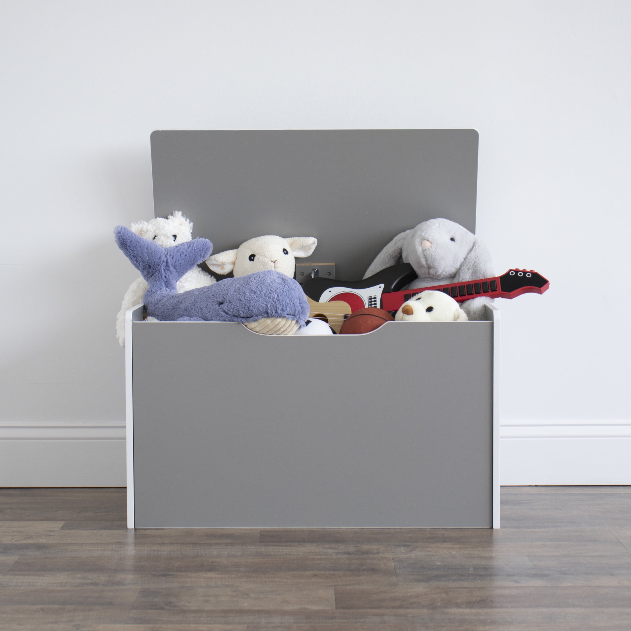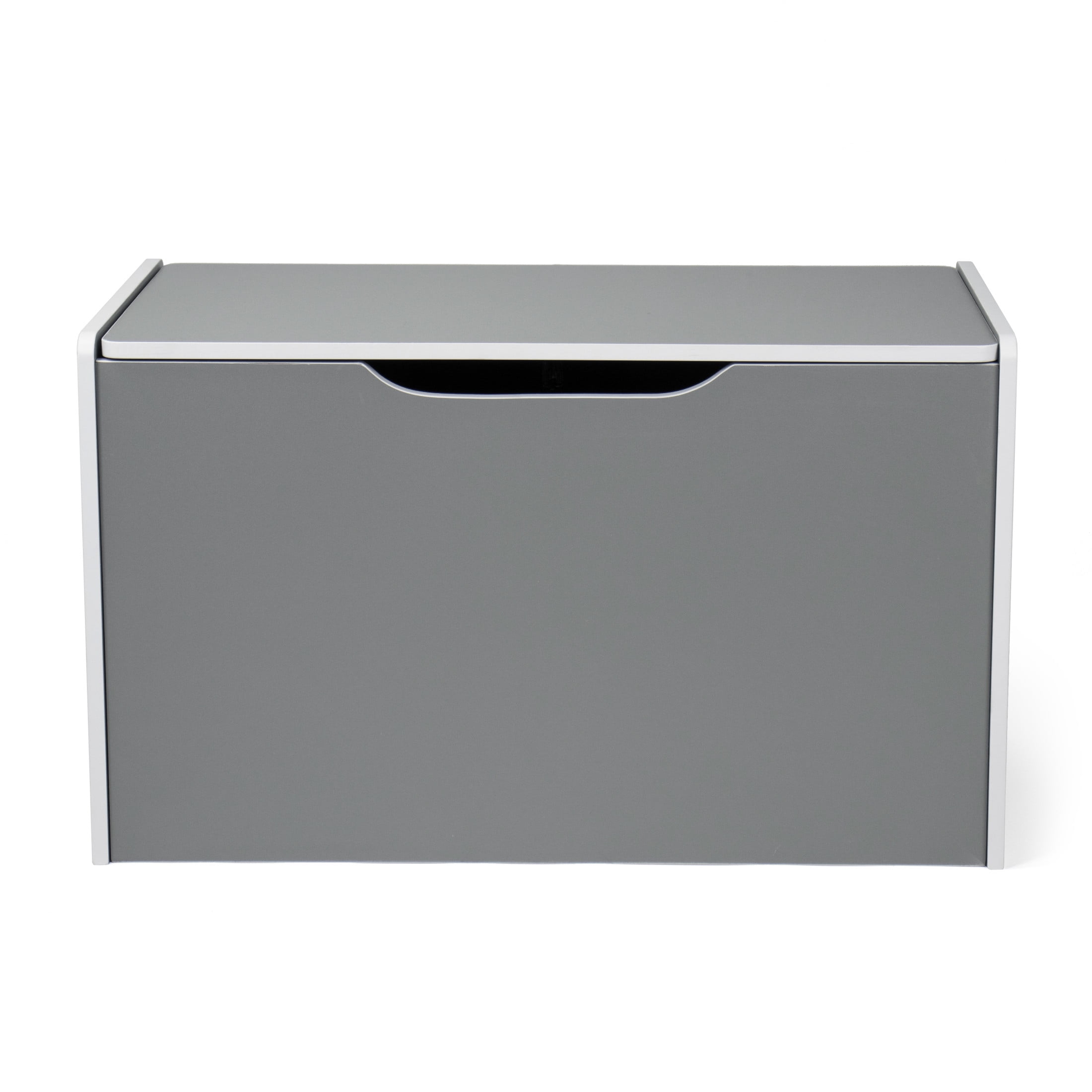 Large toy box features a deep, easy-to-access storage compartment with hinged lid equipped with safety-close engineering. Sturdy wood engineered construction is durable and easy to clean. Safe kid-friendly rounded corners Sized just right for toddlers and preschool-aged children. Product dimensions: 31″ W x 15″ D x 17″ H. Versatile grey finish paired with a grey tone lid and white trim for a contemporary look that matches perfectly with Humble Crew’s Inspire collection. Easy to assemble. Includes all hardware.