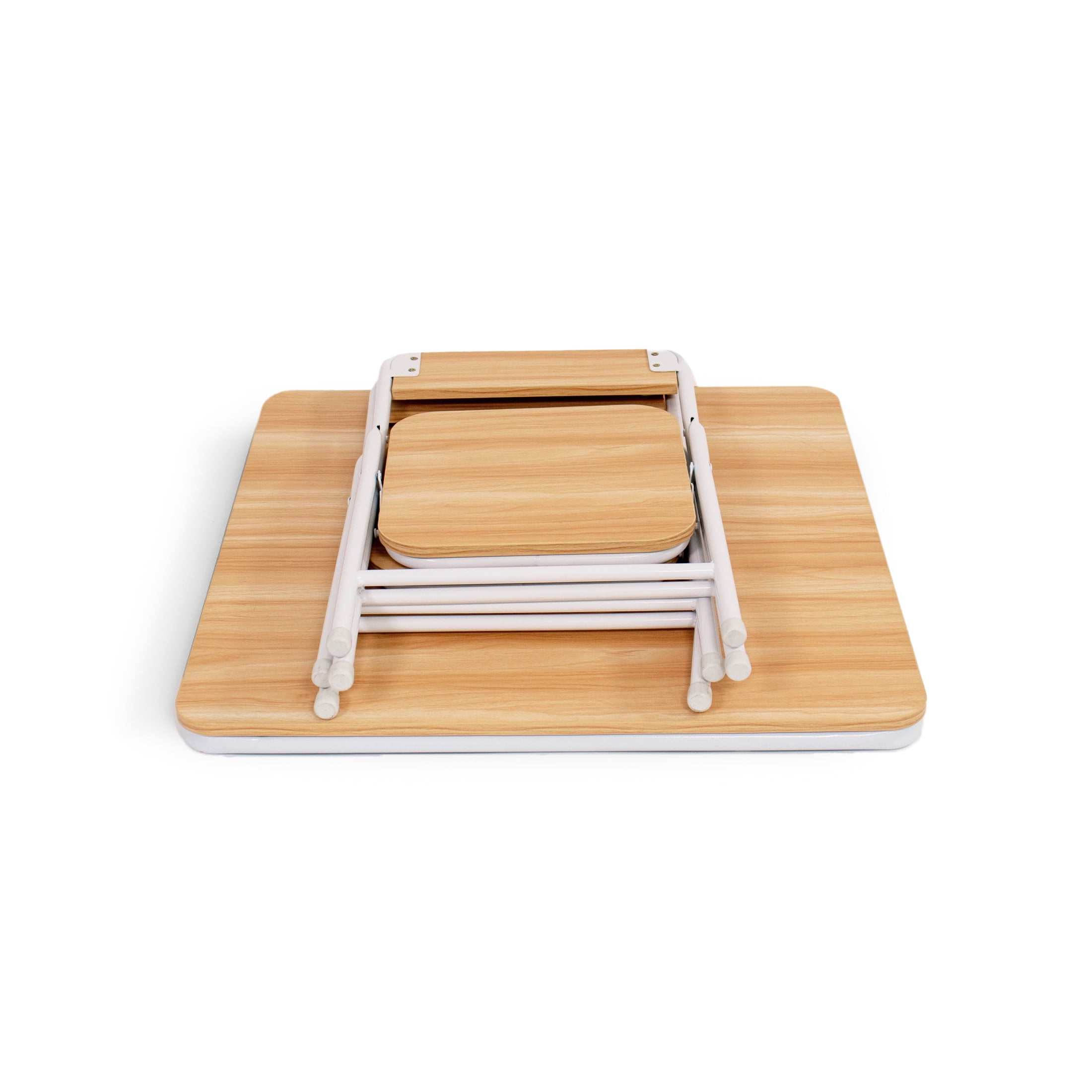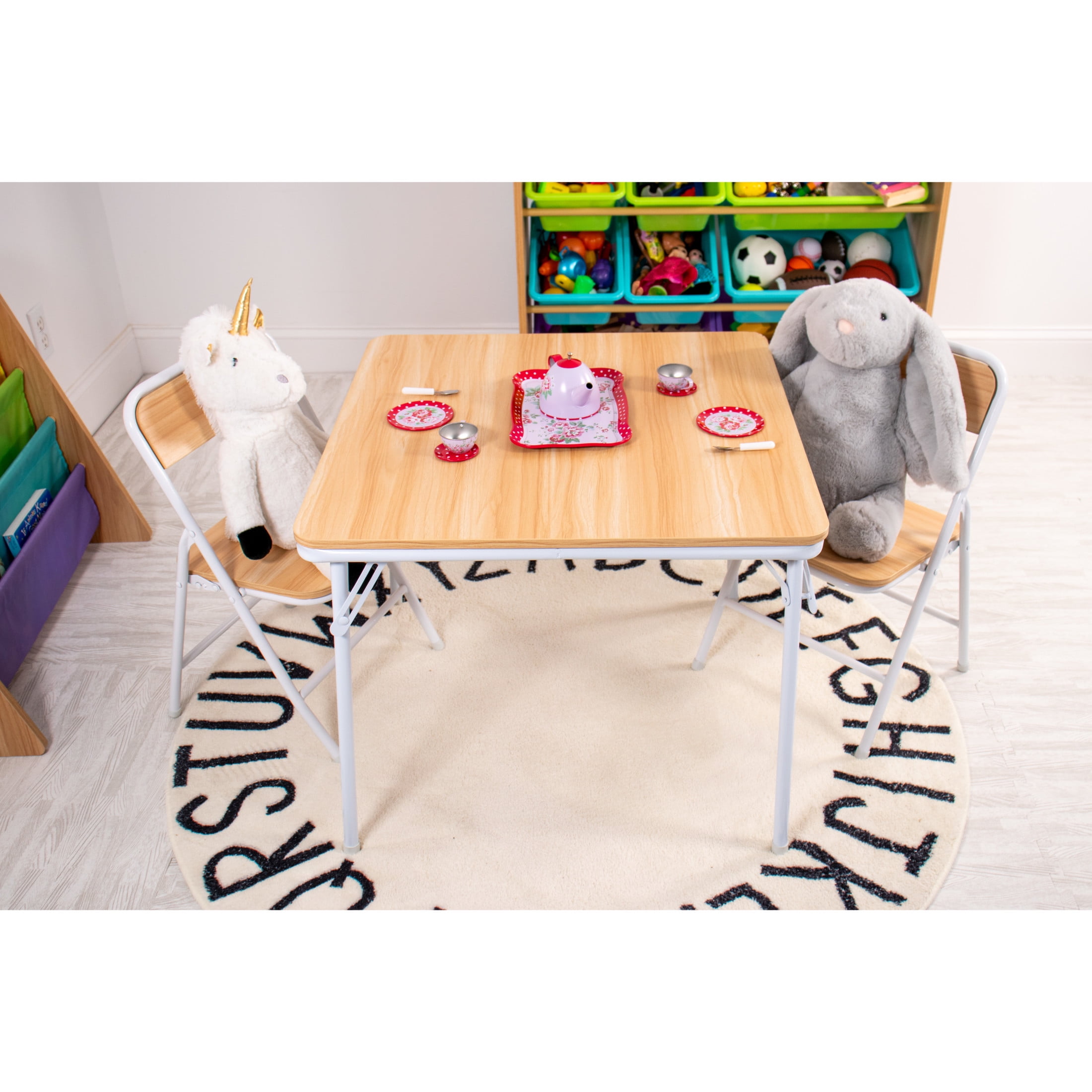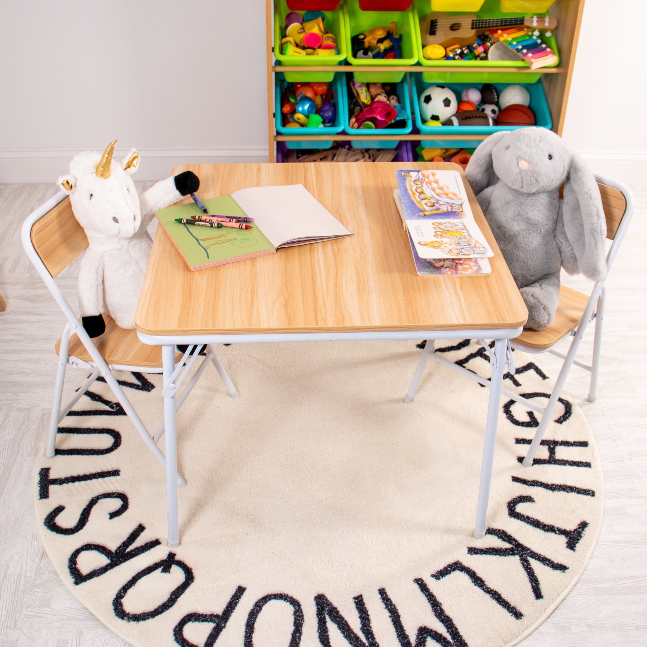 Humble Crew Kids 3-Piece Lightweight Activity Table and Chair Set, Natural Wood and White 3-piece set includes 1 kid’s table and 2 chairs, designed for durability and stability Constructed with sturdy engineered wood surfaces and metal folding legs for added support Easy to assemble, clean, and fold away for convenient storage; all necessary hardware is included Perfectly sized for kids aged 3-6 years, with a weight capacity of 50 lbs per chair Versatile design suitable for various activities such as homework, arts and crafts, and board games