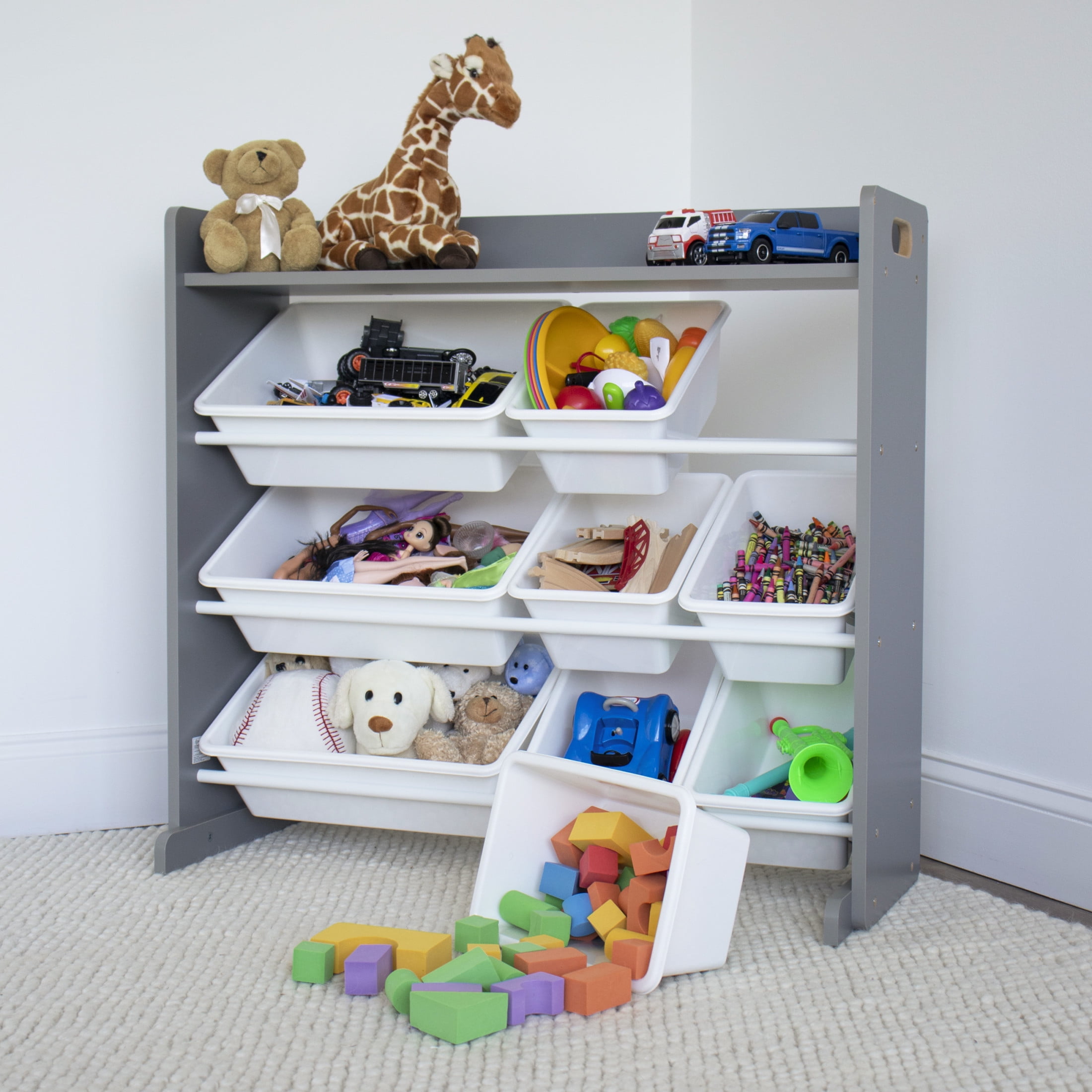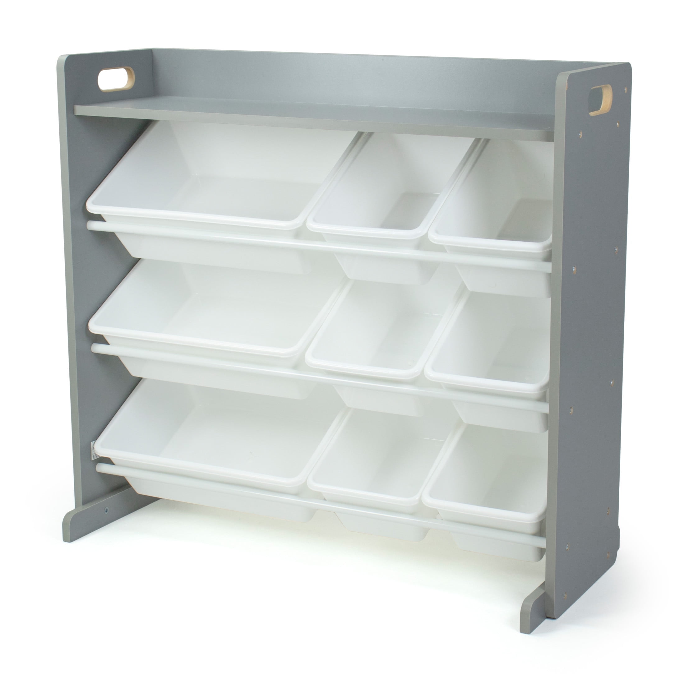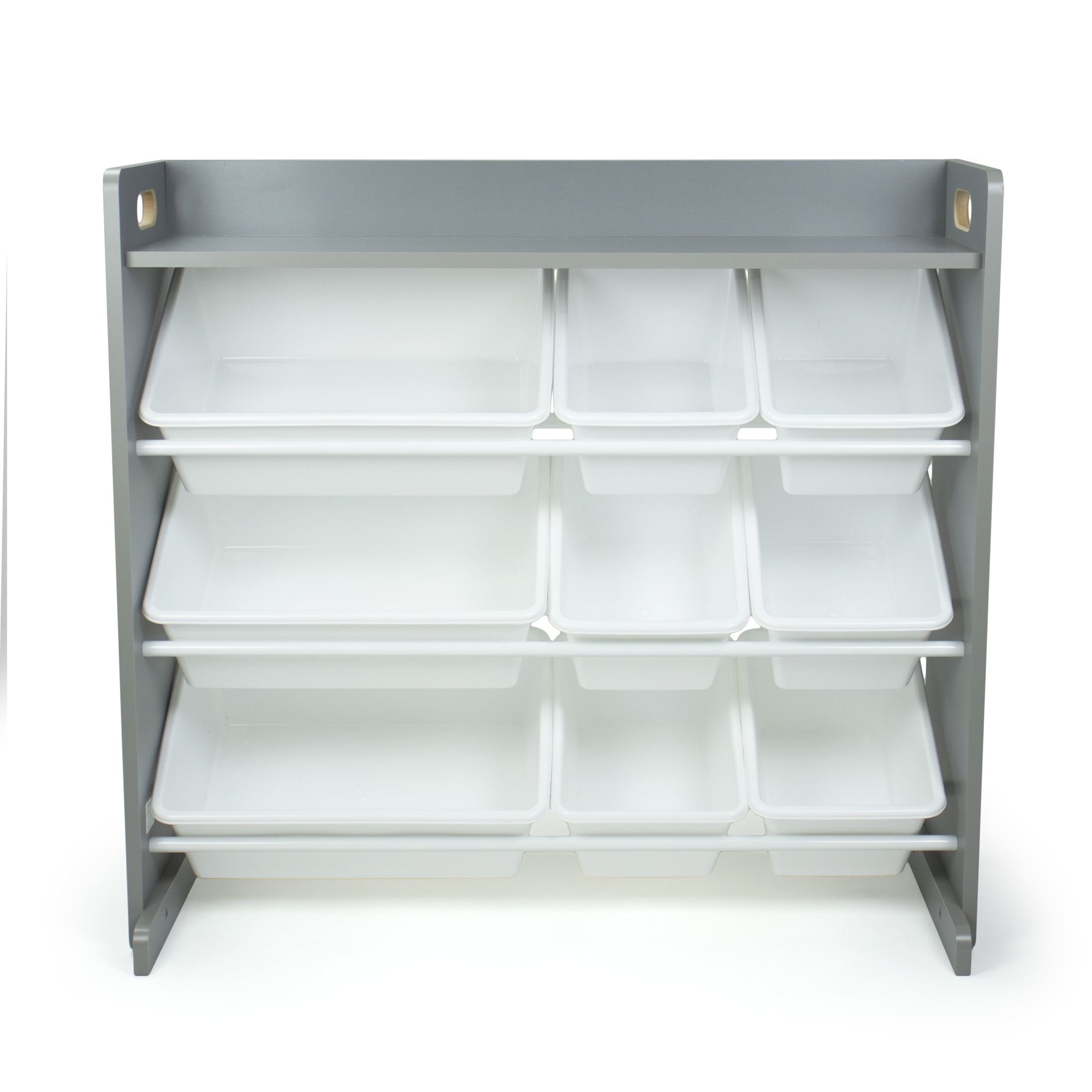 Removable toy storage bins for playtime and easy clean up. Sturdy engineered wood construction frame reinforced with steel dowels, 20 pound weight capacity per level. 9 durable and interchangeable plastic storage bins, 6 standard and 3 large sized. BPA and phthalate free. Neutral grey wooden finish with white toy bins and top storage shelf. Stabilizing braces provide additional safety support. Assembly required. Includes all hardware.