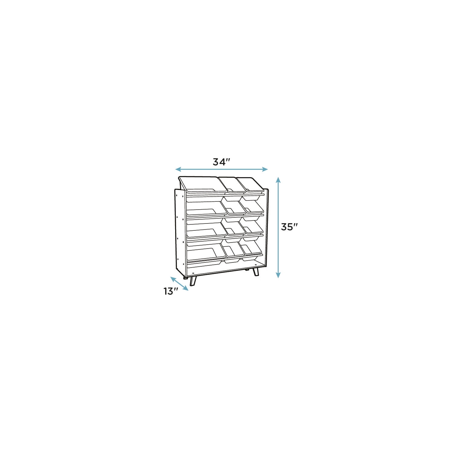Product sizing – Organizer: 34W x 13D x 35H Bins: Standard 12L x 9W x 6H, Large 16L x 12W x 6H 12 bin toy storage organizer 4 large plastic bins and 8 small plastic bins Bins are removable and customizable Easy access for kids to remove toys and clean up Sleek mid-century design for any modern space 4 angled modern wood legs Anti-tip kit anchors organizer to wall for safety Easy to assemble. All hardware