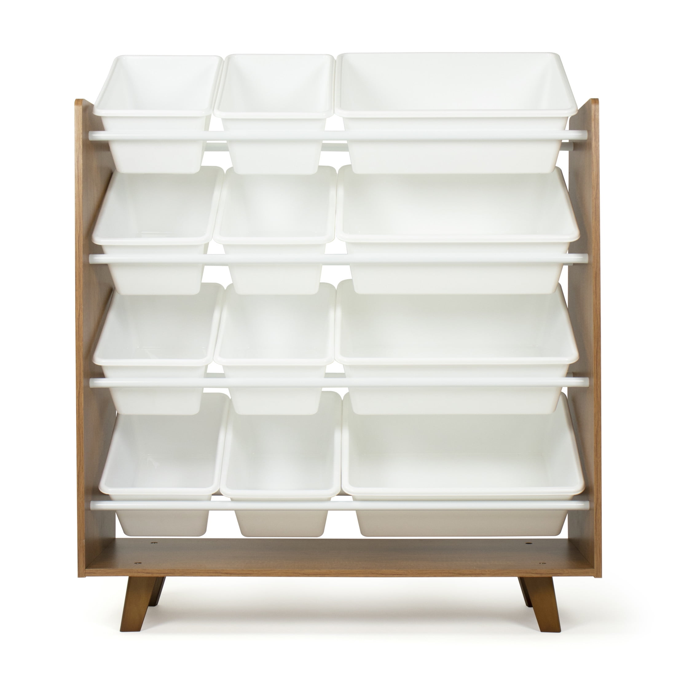 Playtime is more fun when your kids can easily take out their toys, books and games and then quickly clean up afterwards. The space-saving Humble Crew Morgan 12-Bin Toy Storage Mid-Century Organizer, Wood/White stows your children’s toys in easy-to-see, easy-to-access BPA and phthalate free plastic storage bins. 8 standard and 4 large storage containers are easy to remove, replace and reposition along the 4 tiered shelves—sized just right within the toy organizer for toddlers and preschool-aged children. It makes a great toy box storage alternative, helping keep your little one’s room clean and organized while at the same time teaching sorting and cognitive skills. The stylish mid-century modern inspired design makes this the perfect organizational solution for bedrooms, playrooms and more. Made with a sturdy engineered wood construction frame and steel shelving rods, each level can hold up to 20 pounds. Some assembly is required and all hardware is included. Product sizing – 34W x 13D x 35H Standard bin sizing: 12L x 9W x 6H Large bin sizing: 16L x 12W x 6H Additional plastic storage toy bins are also sold separately