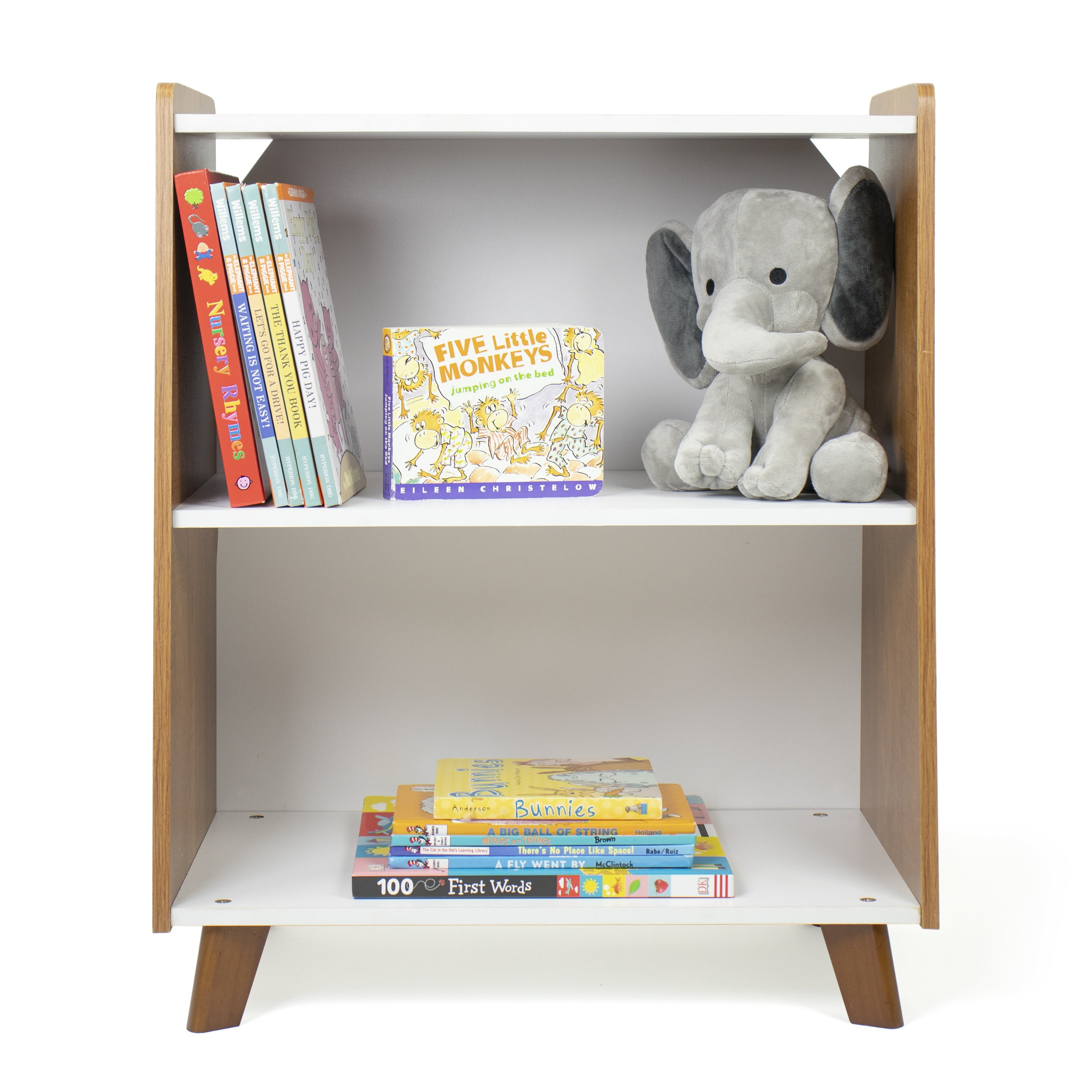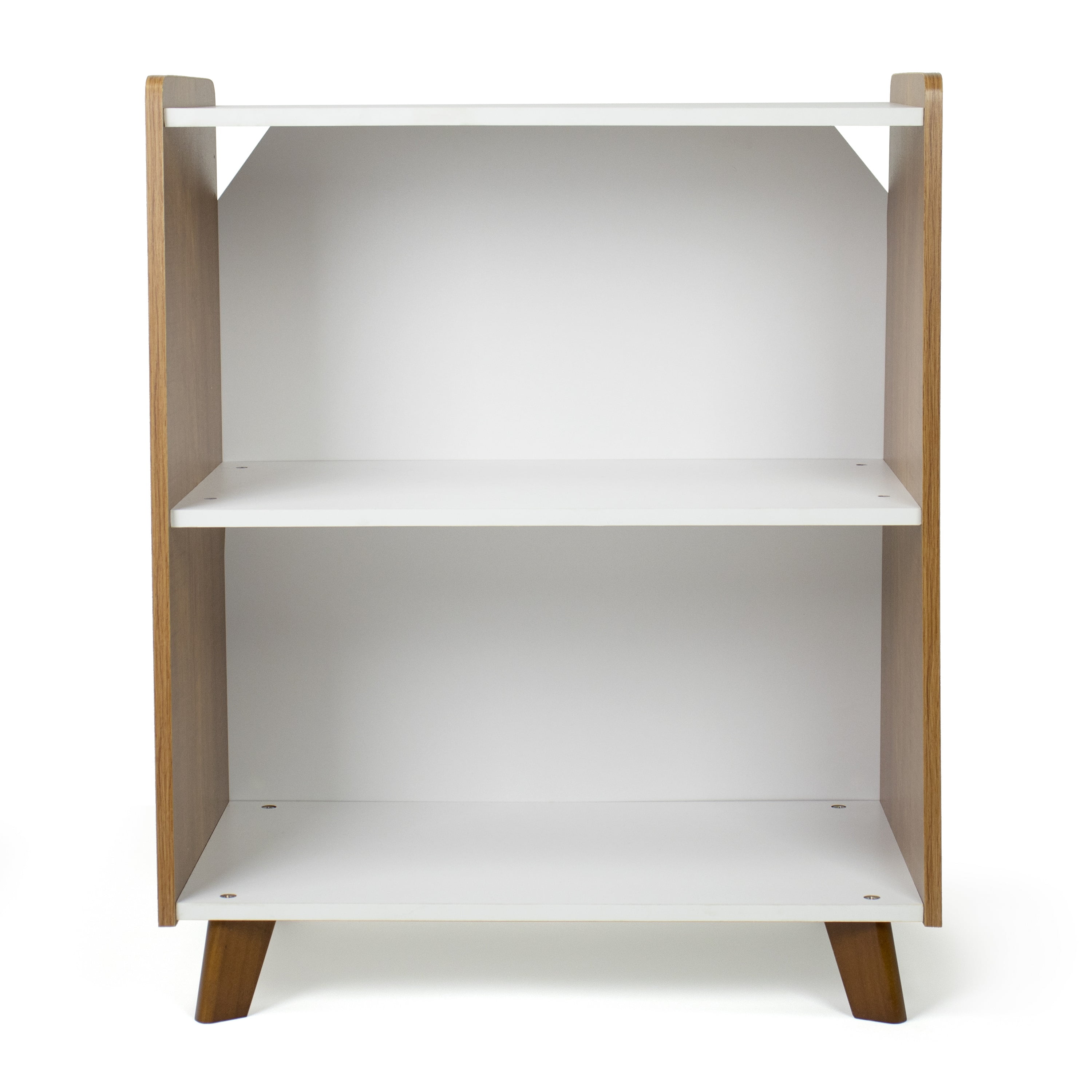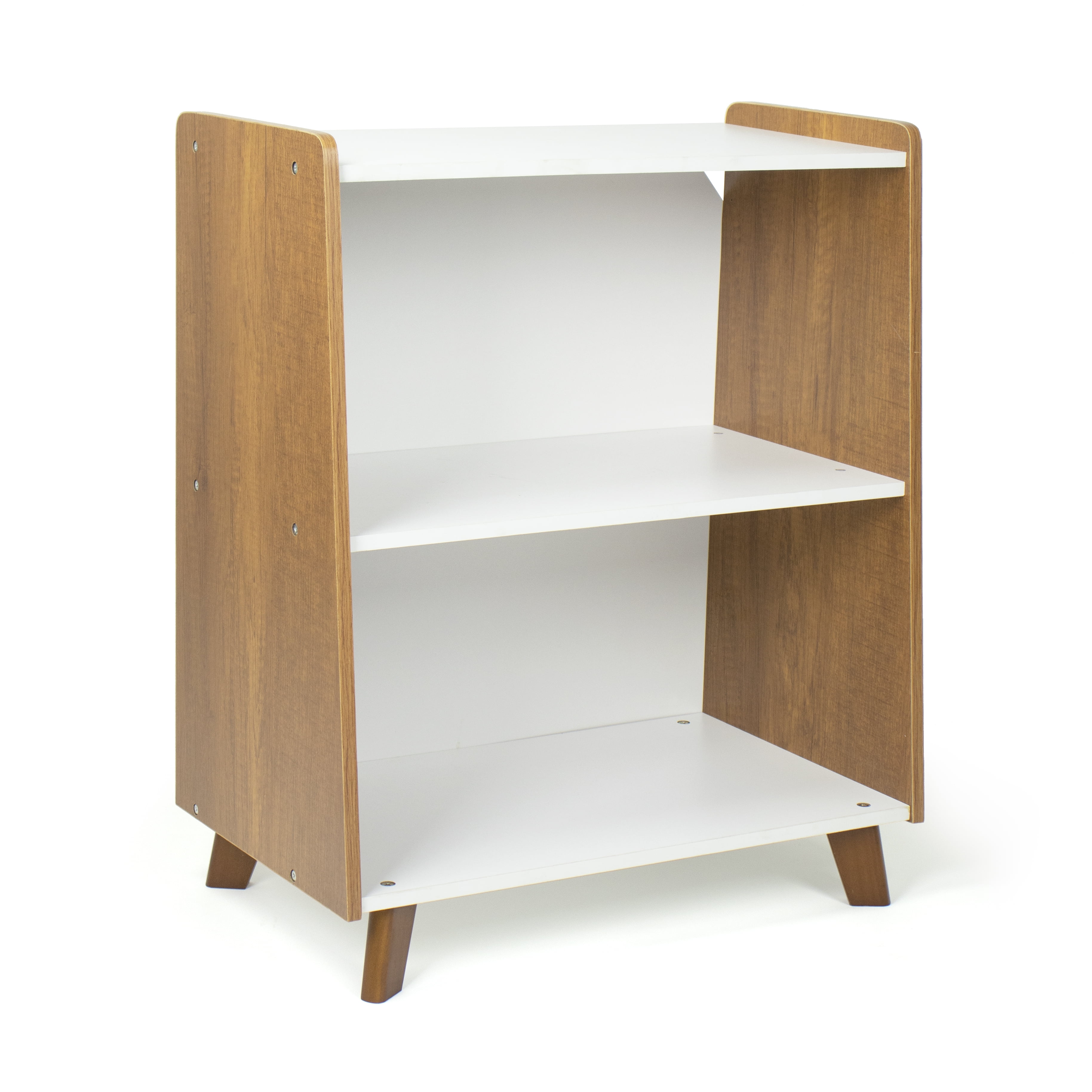 Help your little ones organize their books, toys and more all on their own and in style with Humble Crew’s sturdy 2-Tier Mid-Century Modern Bookshelf. At only 27 high, this shelved storage unit is the perfect height to teach kids a bit of independence and organizational skills at a young age. Easily organize books, toys or arts and crafts supplies, or display decorations, pictures, stuffed animals and more. Open and accessible storage makes it a breeze for kids to retrieve and replace their favorite items. This fixed shelf bookcase offers spacious and stylish storage for kids rooms, playrooms, living rooms, dens, offices and more. With angled side panels and 4 tapered legs in a modern wood finish with white shelving, this bookshelf will seamlessly match existing furniture in any room. The colorway also perfectly matches any of Humble Crew’s Morgan collection for a cohesive aesthetic. Easy assembly and durable construction means this storage unit truly makes clean up and organization simple for you and your little one alike! Product Sizing— 22W x 13D x 27H