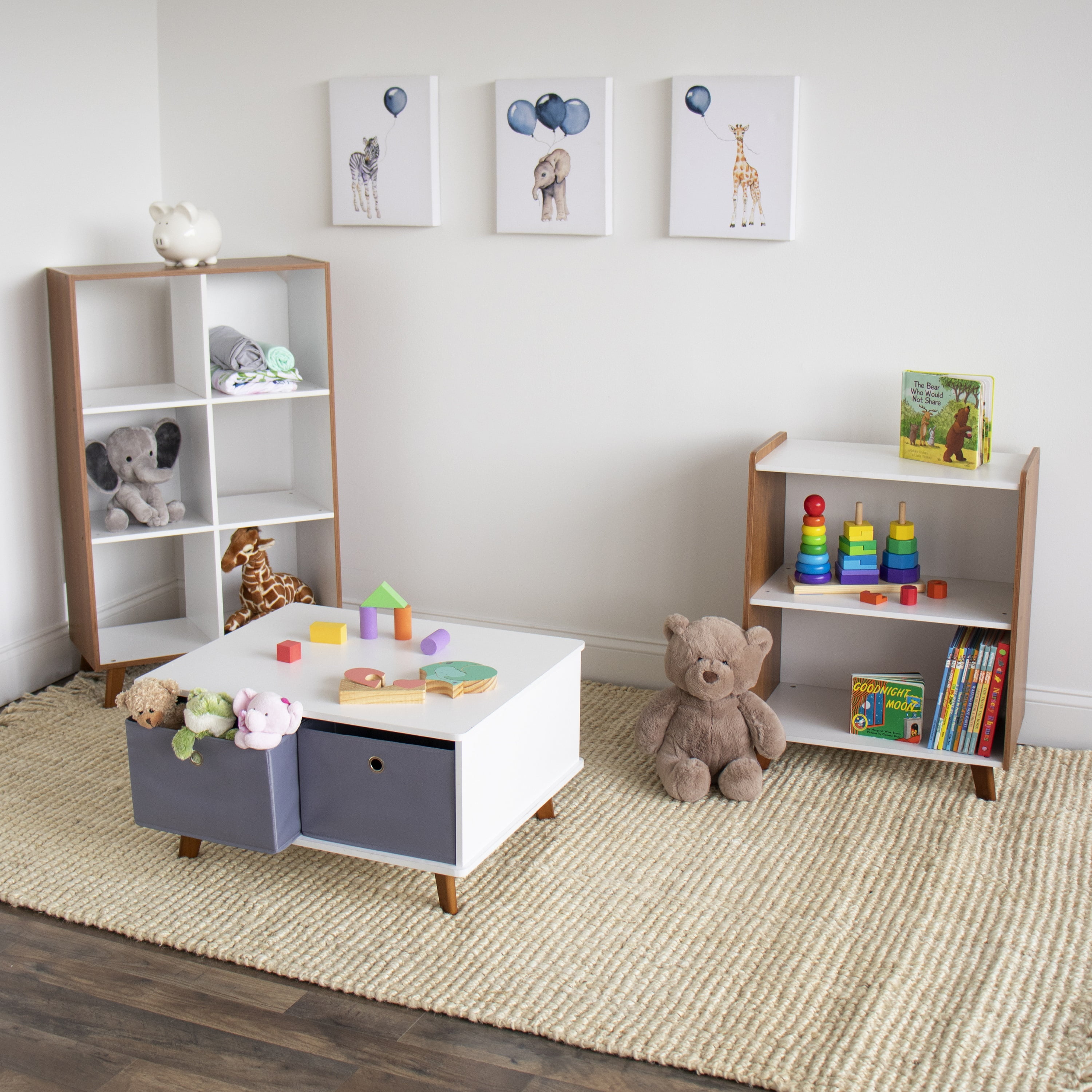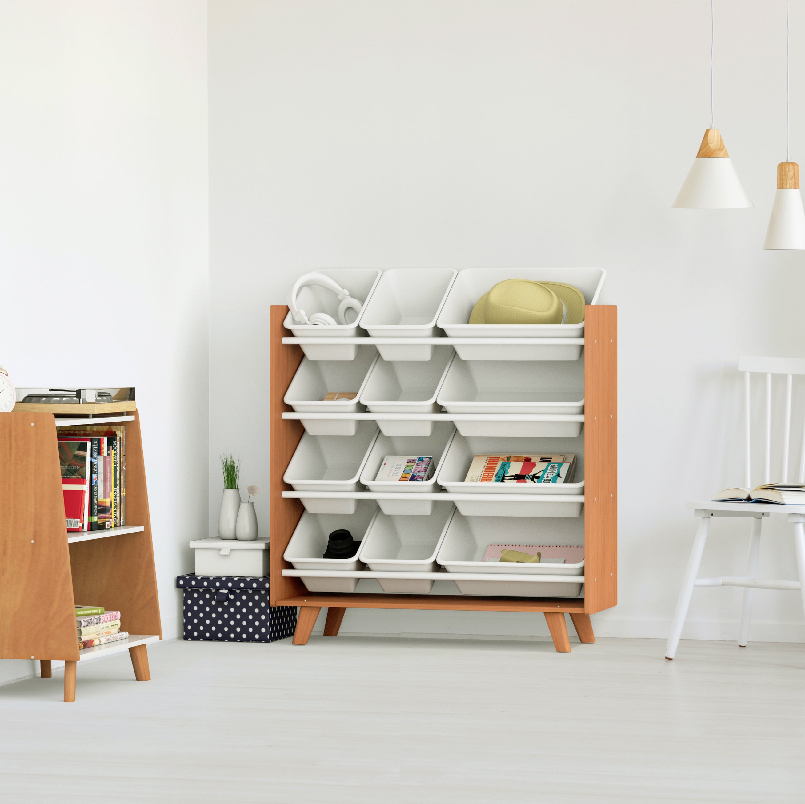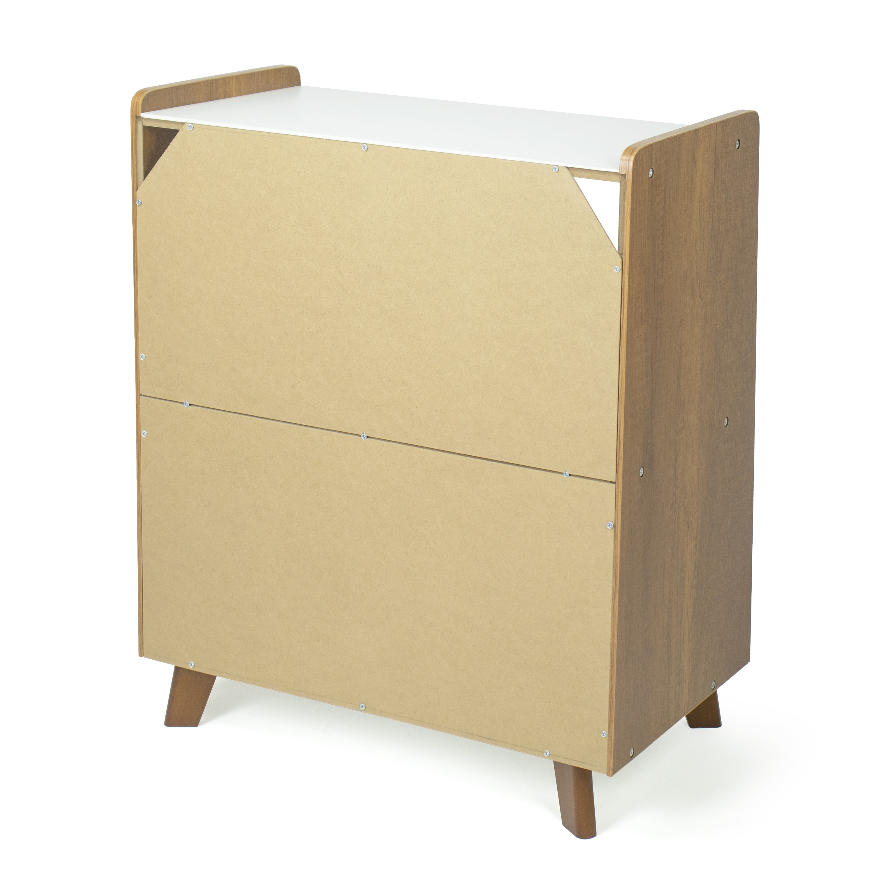 Help your little ones organize their books, toys and more all on their own and in style with Humble Crew’s sturdy 2-Tier Mid-Century Modern Bookshelf. At only 27 high, this shelved storage unit is the perfect height to teach kids a bit of independence and organizational skills at a young age. Easily organize books, toys or arts and crafts supplies, or display decorations, pictures, stuffed animals and more. Open and accessible storage makes it a breeze for kids to retrieve and replace their favorite items. This fixed shelf bookcase offers spacious and stylish storage for kids rooms, playrooms, living rooms, dens, offices and more. With angled side panels and 4 tapered legs in a modern wood finish with white shelving, this bookshelf will seamlessly match existing furniture in any room. The colorway also perfectly matches any of Humble Crew’s Morgan collection for a cohesive aesthetic. Easy assembly and durable construction means this storage unit truly makes clean up and organization simple for you and your little one alike! Product Sizing— 22W x 13D x 27H
