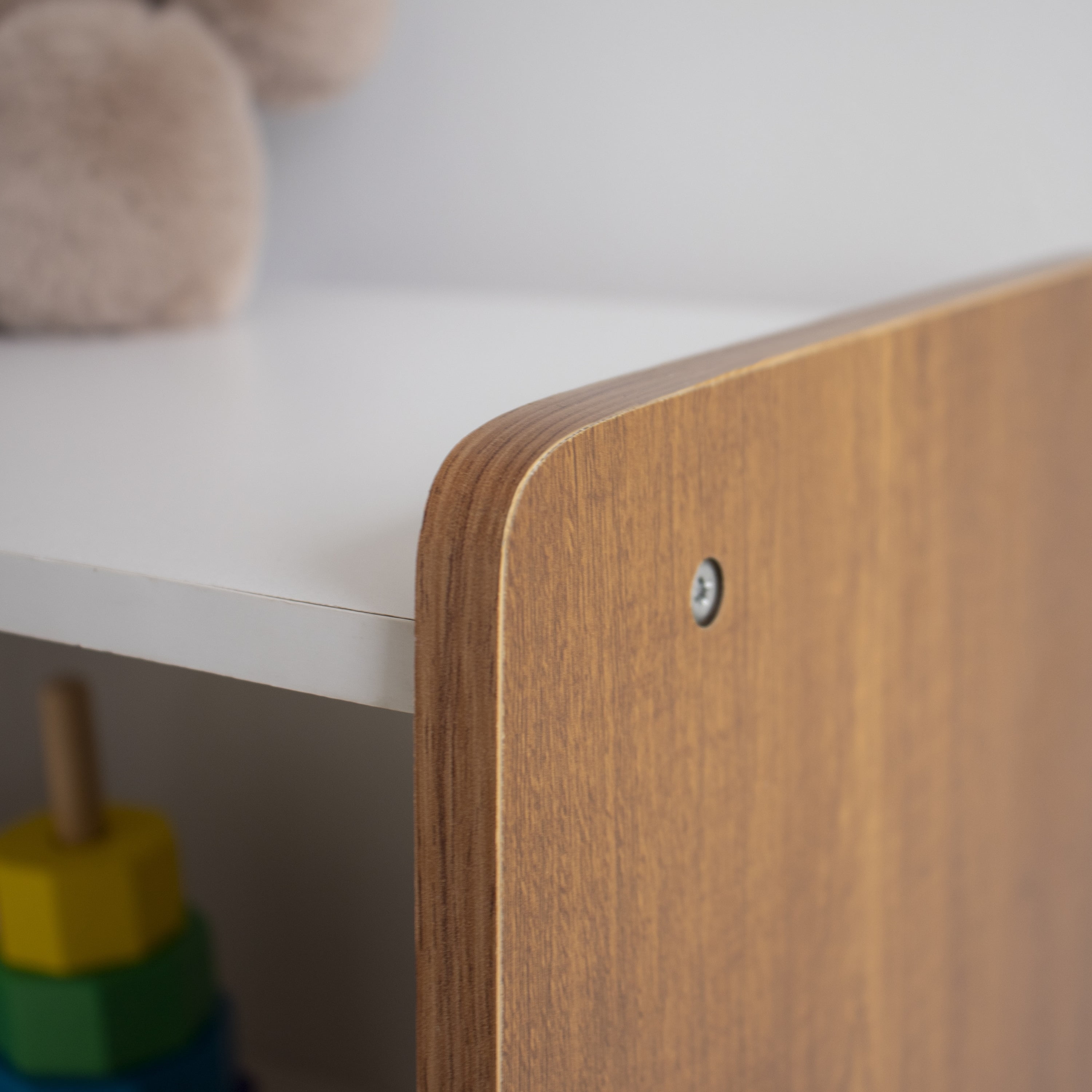 Product Sizing— 22W x 13D x 27H Stylish white and cherry wood finish Ideal size for kids aged 3-8 Space saving design for compact spaces Allows kids to reach their favorite books and toys Coordinates with many room décor styles Sturdy and durable engineered wood construction. Easy to assemble and clean, all hardware included