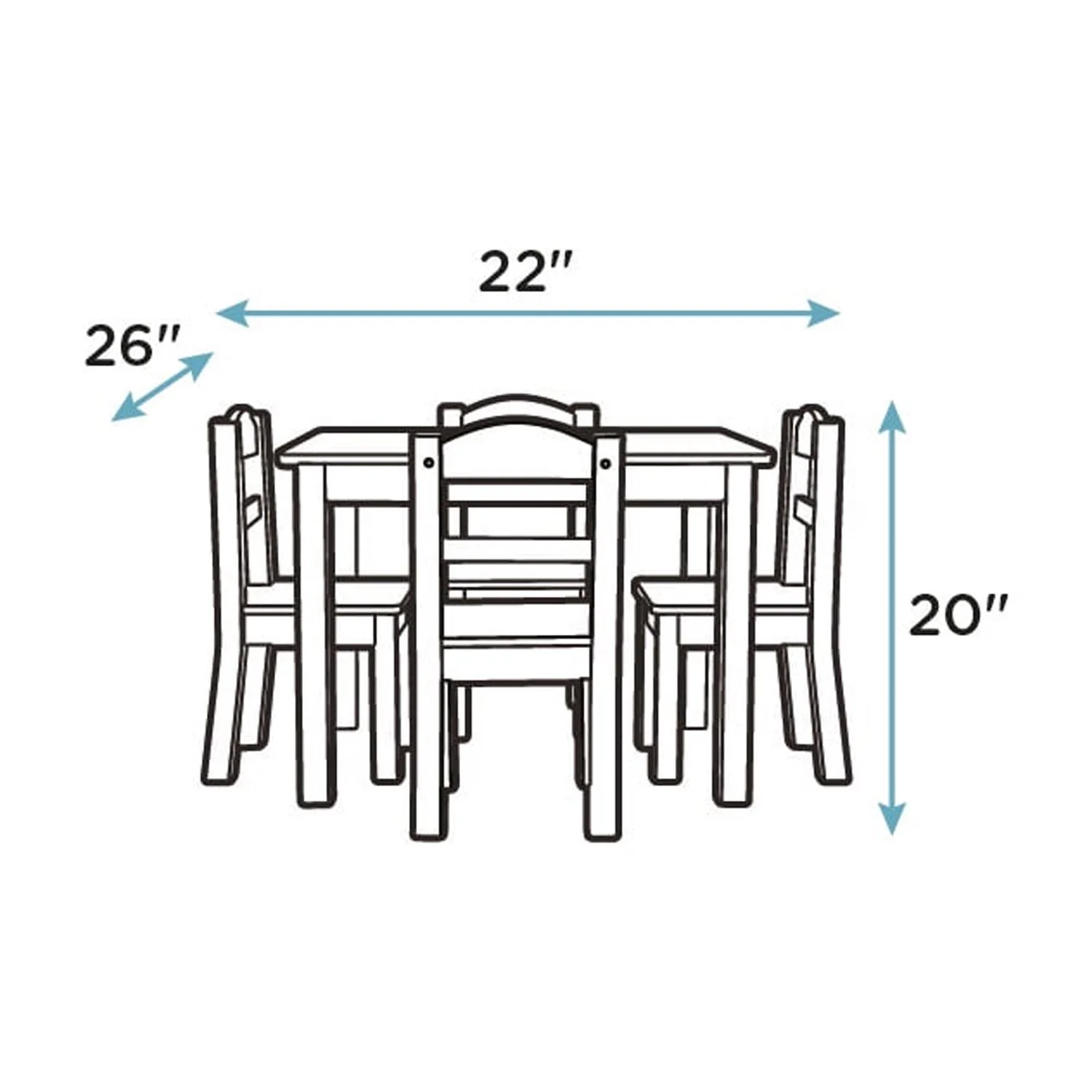 Sturdy engineered wood 5-piece set, 1 kid’s table and 4 chairs. Great table set for kids ages 3-6 years. Perfect for homeschooling, meals, crafts, reading and more. Dimensions Table: 22″W x 26″D x 19″H, Chairs: 10″W x 10″D x 20″H, Seat Height: 10″ Stylish colorway coordinates with most furniture. Durable, easy to clean and to assemble. All hardware is included. 49 lbs. weight capacity per chair.