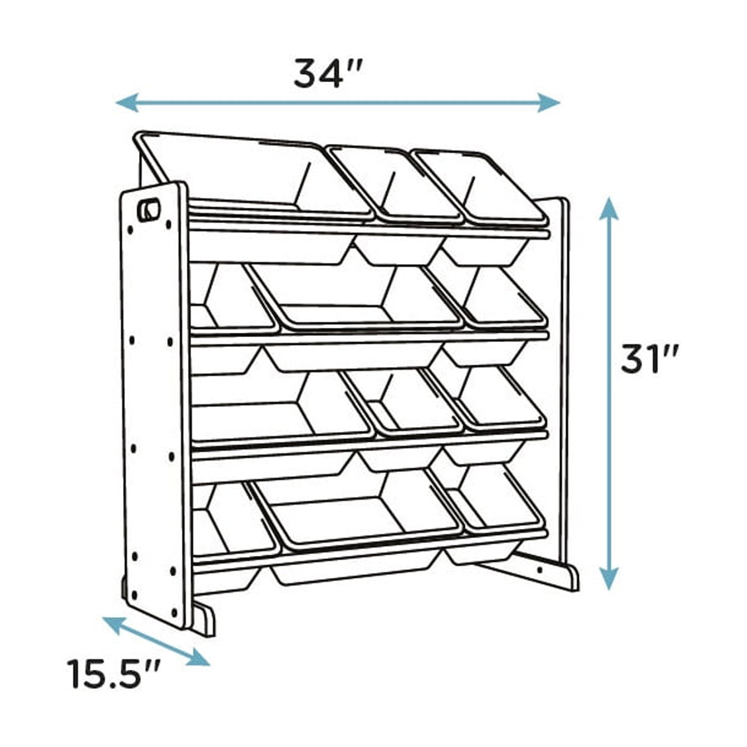 Sturdy engineered wood construction frame reinforced with steel dowels, 20 pound weight capacity per level. 11 durable plastic storage bins, 8 standard and 4 large interchangeable storage bins. BPA and phthalate free. Product sizing Organizer: 34W x 11D (15.5D with stabilizing braces) x 31H, Standard Size Bins: 12L x 9W x 6H, Large Size Bins: 16L x 12W x 6H Stabilizing braces and anti-tip kit provide additional safety support. Anchors to wall for safety. Easy to assemble. Includes all hardware.