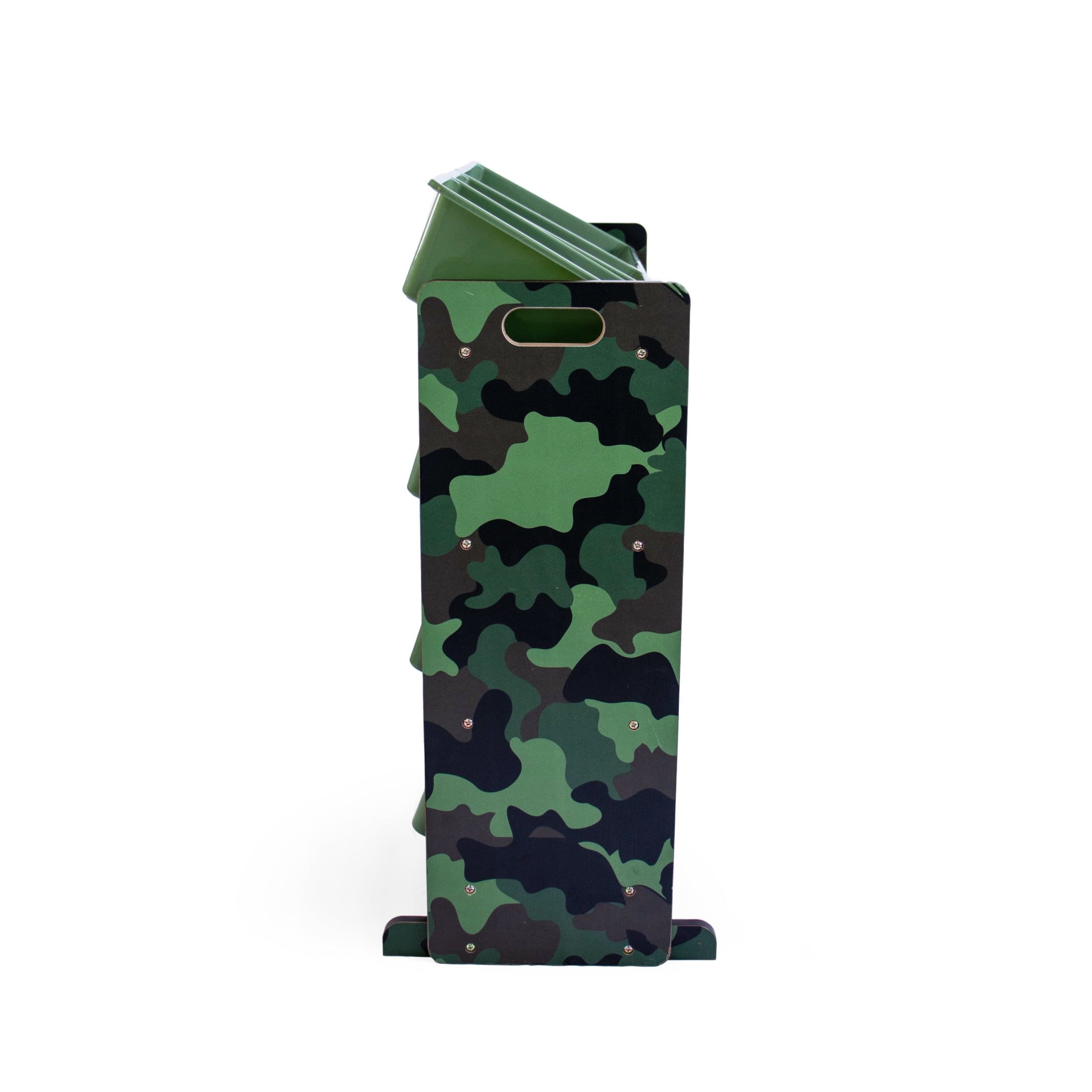 Removable toy storage bins for playtime and easy clean up. Army green camouflage wooden finish with green colored toy bins. Sturdy engineered wood construction frame reinforced with steel dowels, 20 pound weight capacity per level. 12 durable plastic storage bins, 8 standard and 4 large interchangeable storage bins. BPA and phthalate free. Product sizing Organizer: 34W x 11D (16D with stabilizing braces) x 32H, Standard Size Bins: 12L x 9W x 6H, Large Size Bins: 16L x 12W x 6H Stabilizing braces and anti-tip kit provide additional safety support. Anchors to wall for safety. Easy to assemble. Includes all hardware.