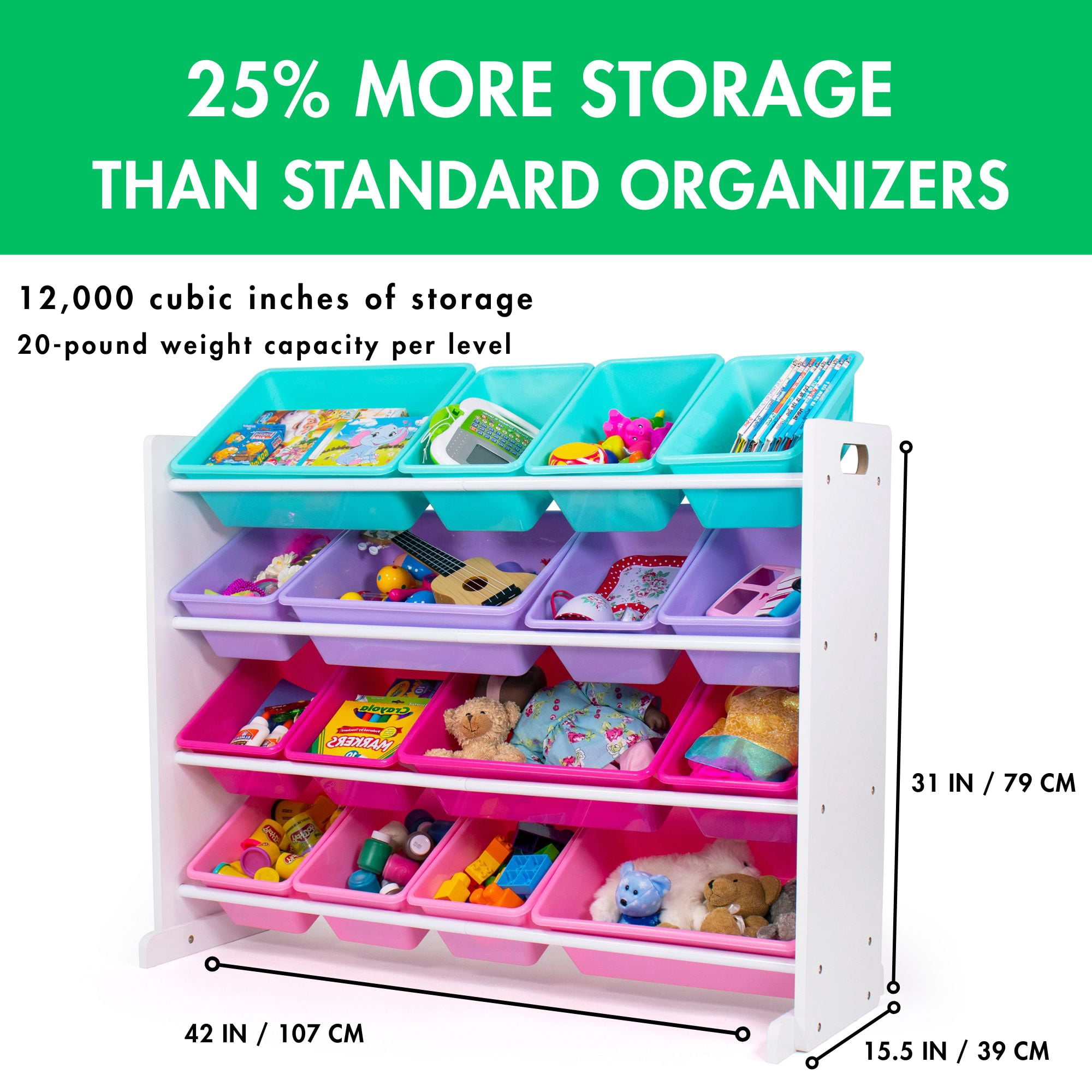 Super-sized stores 25% more than other toy organizers. Removable toy storage bins for playtime and easy clean up. White wooden finish with pink, purple and turquoise colored toy bins. Sturdy engineered wood construction frame reinforced with steel dowels, 20 pound weight capacity per level. 16 durable plastic storage bins, 12 standard and 4 large (equivalent to 8 standard bins) interchangeable storage bins. BPA and phthalate free. Product sizing Organizer: 42W x 15.5″D x 31H, Standard Size Bins: 12L x 9W x 6H, Large Size Bins: 16L x 12W x 6H Stabilizing braces and anti-tip kit provide additional safety support.