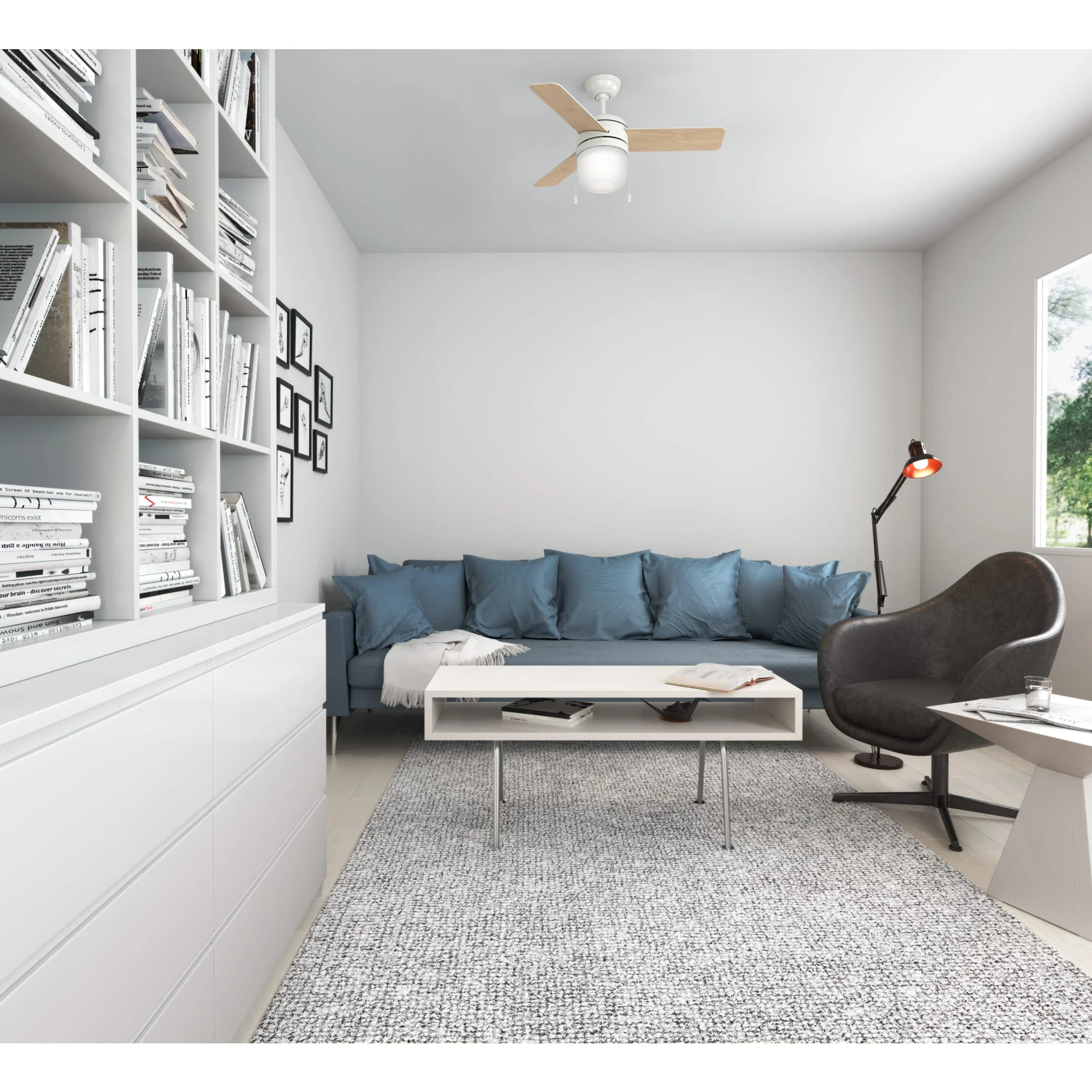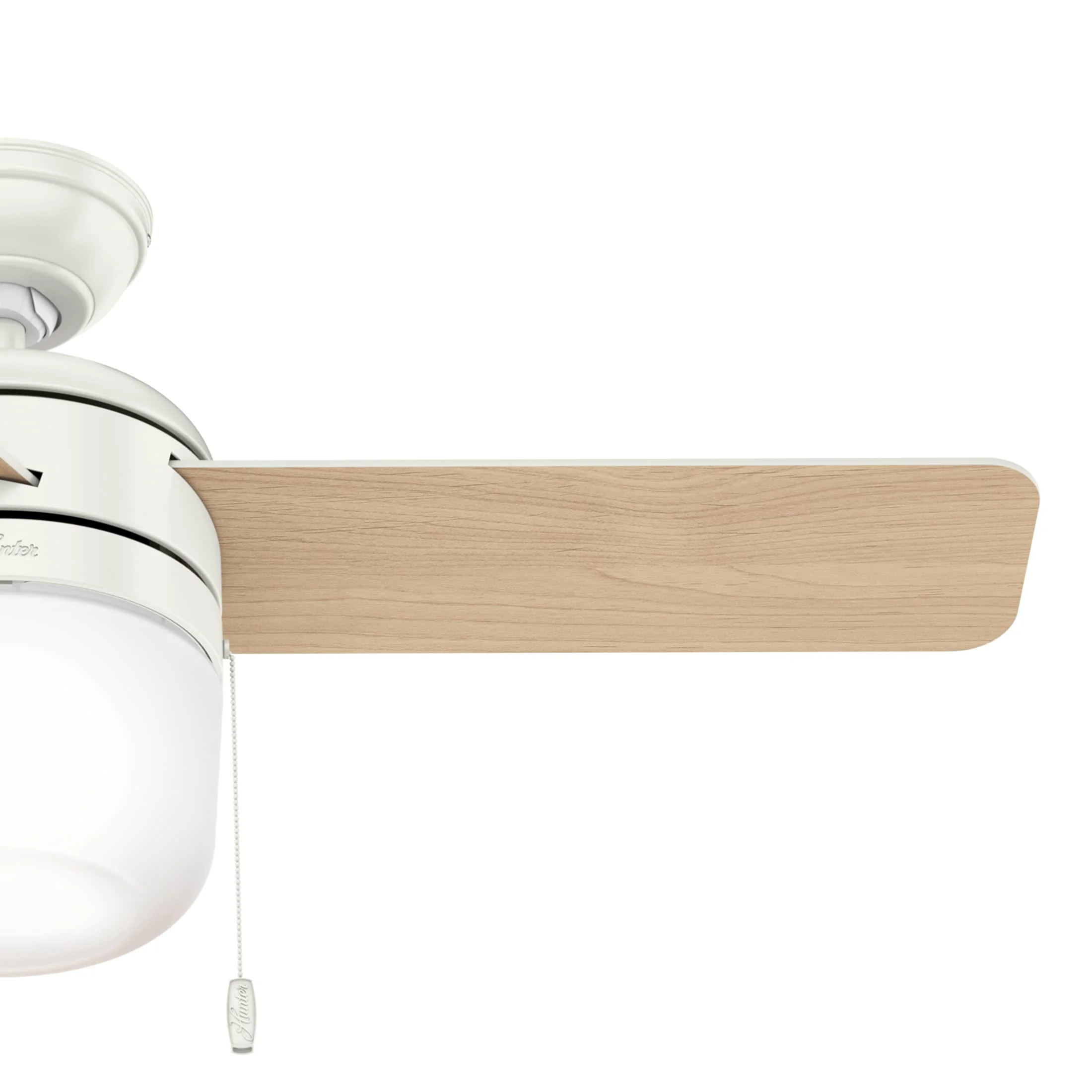 THE ACUMEN: A smaller-sized, modern ceiling fan perfect for your foyer / entry way, child’s bedroom, craft / hobby room, dining room, mudroom / utility room, fitness room, bonus room / game room, guest bedroom, kitchen, office, laundry room, bedroom CLEARLY BRIGHTER: TrueLight™ products are designed for modern bulbs that provide illumination and efficiency so you get the perfect brightness, every time PULL CHAINS: Includes pull chains for quick and easy on/off and speed adjustments PULL CHAINS: Includes pull chains for quick and easy on/off and speed adjustments AIRFLOW: Strong airflow up to 3788 cubic feet per minute (CFM) on high speed INDOOR ONLY: This ceiling fan is ETL rated for indoor use only, making it ideal for spaces like living rooms, bedrooms, home offices, and kitchens BULBS INCLUDED: Includes one, 9-Watt energy-efficient, long-lasting, dimmable LED bulb LONGEVITY: Hunter performs twice the agency recommended testing to ensure their ceiling fans – from the finishes to the fan motor your Hunter will stand the test of time WARRANTY: Limited Lifetime Motor Warranty is backed by the only company with over 135 years in the fan business PREMIUM GLASS SHADING: The light kit includes premium frosted glass shading FLIP THE BLADE: This fan features 3 reversible Fresh White and Natural Wood blades to help match your room’s design DOWNROD: Includes a single 2-inch downrod to ensure proper distance from the ceiling and optimize air movement WINTER AND SUMMER: Reversible motor allows you to change the direction of your fan from downdraft mode during the summer which helps cool the room to updraft mode during the winter to help circulate trapped warm air near the ceiling BLADE PITCH: 13-degree blade pitch optimized to ensure ideal air movement and peak performance