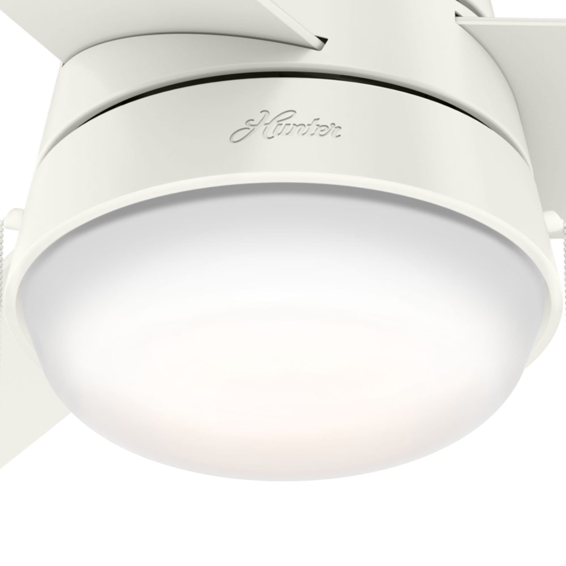 THE AKER: A smaller-sized, modern ceiling fan perfect for your foyer / entry way, craft / hobby room, mudroom / utility room, fitness room, kitchen, office, laundry room, bedroom DIGITAL MANUAL: Installation made easy with Hunter’s 3D InterActive Guide—just scan the QR code for quick setup CLEARLY BRIGHTER: TrueLight™ products are designed for modern bulbs that provide illumination and efficiency so you get the perfect brightness, every time SURESPEED AND WHISPERWIND: The 3-speed WhisperWind reversible motor and exclusive SureSpeed Technology deliver ultra-powerful airflow for high-speed cooling with quiet performance PULL CHAINS: Includes pull chains for quick and easy on/off and speed adjustments PULL CHAINS: Includes pull chains for quick and easy on/off and speed adjustments AIRFLOW: Strong airflow up to 3006 cubic feet per minute (CFM) on high speed INDOOR ONLY: This ceiling fan is ETL rated for indoor use only, making it ideal for spaces like living rooms, bedrooms, home offices, and kitchens BULBS INCLUDED: Includes two, 9-Watt energy-efficient, long-lasting, dimmable LED bulbs LONGEVITY: Hunter performs twice the agency recommended testing to ensure their ceiling fans – from the finishes to the fan motor your Hunter will stand the test of time WARRANTY: Limited Lifetime Motor Warranty is backed by the only company with over 135 years in the fan business PREMIUM GLASS SHADING: The light kit includes premium painted cased white glass shading FLIP THE BLADE: This fan features 3 reversible Fresh White and Natural Wood blades to help match your room’s design DOWNROD: Includes a single 4-inch downrod to ensure proper distance from the ceiling and optimize air movement WINTER AND SUMMER: Reversible motor allows you to change the direction of your fan from downdraft mode during the summer which helps cool the room to updraft mode during the winter to help circulate trapped warm air near the ceiling BLADE PITCH: 15-degree blade pitch optimized to ensure ideal air movement and peak performance
