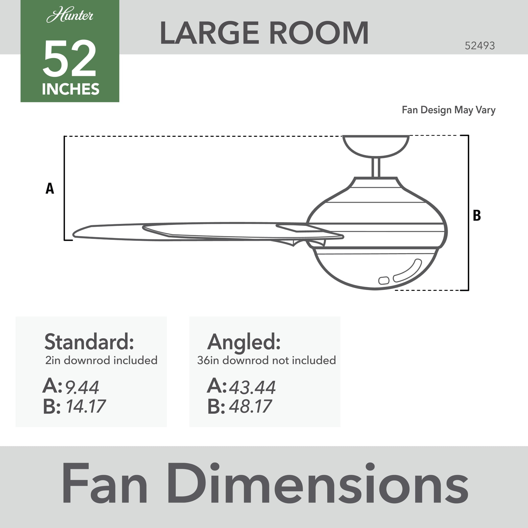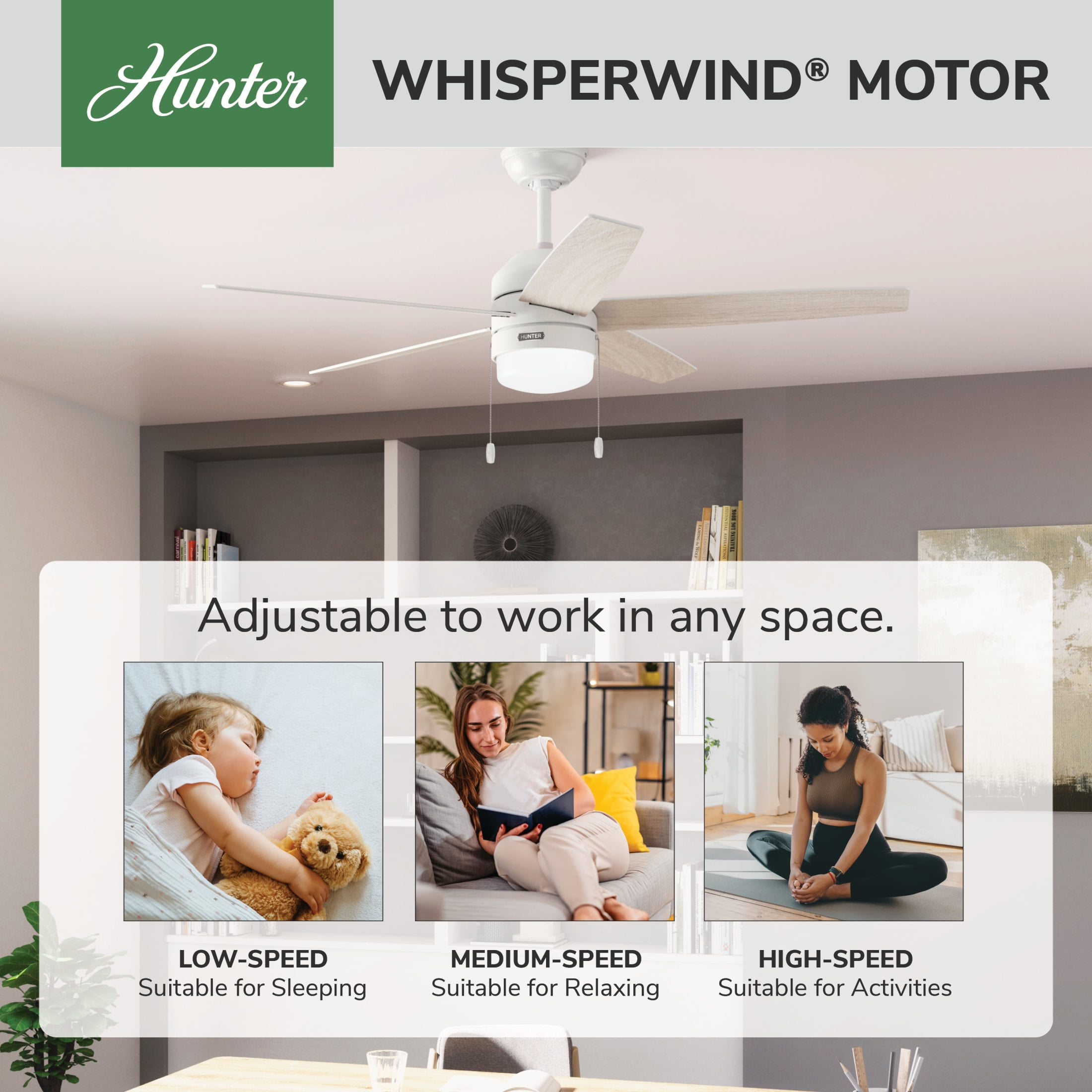 THE BARDOT: A medium-sized, modern ceiling fan perfect for your bedroom CLEARLY BRIGHTER: TrueLight™ products are designed for modern bulbs that provide illumination and efficiency so you get the perfect brightness, every time PULL CHAINS: Includes pull chains for quick and easy on/off and speed adjustments PULL CHAINS: Includes pull chains for quick and easy on/off and speed adjustments AIRFLOW: Strong airflow up to 3852 cubic feet per minute (CFM) on high speed INDOOR ONLY: This ceiling fan is ETL rated for indoor use only, making it ideal for spaces like living rooms, bedrooms, home offices, and kitchens BULBS INCLUDED: Includes two, 7-Watt energy-efficient, long-lasting, dimmable LED bulbs LONGEVITY: Hunter performs twice the agency recommended testing to ensure their ceiling fans – from the finishes to the fan motor your Hunter will stand the test of time WARRANTY: Limited Lifetime Motor Warranty is backed by the only company with over 135 years in the fan business PREMIUM GLASS SHADING: The light kit includes premium white lens glass shading FLIP THE BLADE: This fan features 5 reversible Fresh White and Light Oak blades to help match your room’s design DOWNROD: Includes a single 3-inch downrod to ensure proper distance from the ceiling and optimize air movement WINTER AND SUMMER: Reversible motor allows you to change the direction of your fan from downdraft mode during the summer which helps cool the room to updraft mode during the winter to help circulate trapped warm air near the ceiling BLADE PITCH: 13-degree blade pitch optimized to ensure ideal air movement and peak performance