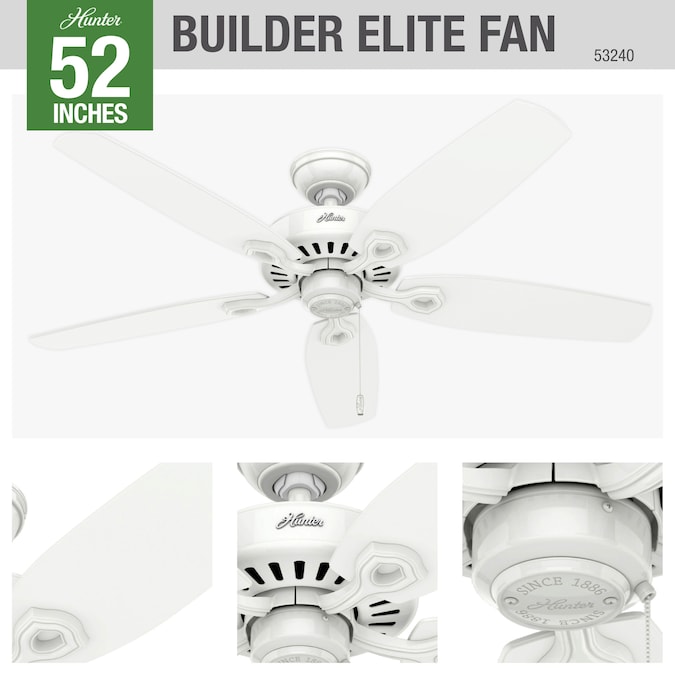 With a 52-inch blade span and four finishes to choose from, the casual, traditional style of the Builder Elite will complement standard or large rooms in your home without overpowering them. A mainstay in the Hunter® product line, these ceiling fans without lights feature three-speed WhisperWind® motor technology to deliver quiet and ultra-powerful performance.