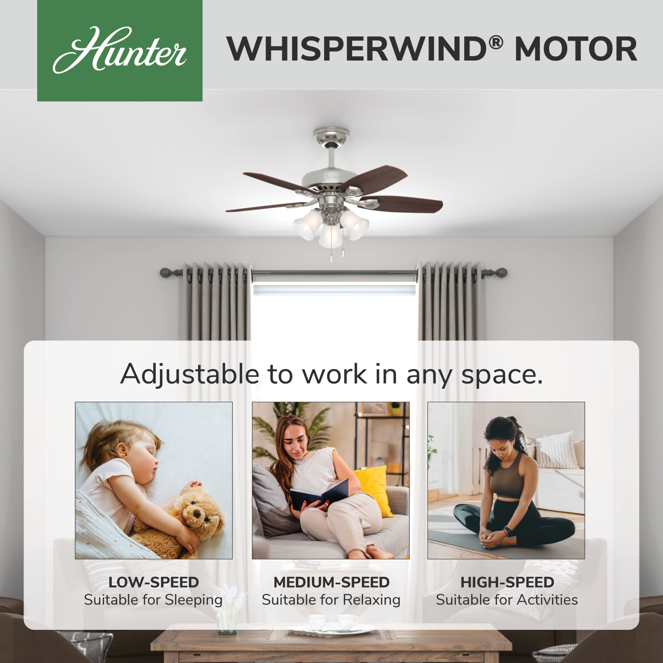 With a 42-inch blade span, the casual, traditional style of the Builder fan will complement the small rooms in your home without overpowering them. A mainstay in the Hunter® product line, these small ceiling fans with lights feature three-speed WhisperWind® motor technology to deliver quiet and ultra-powerful performance.