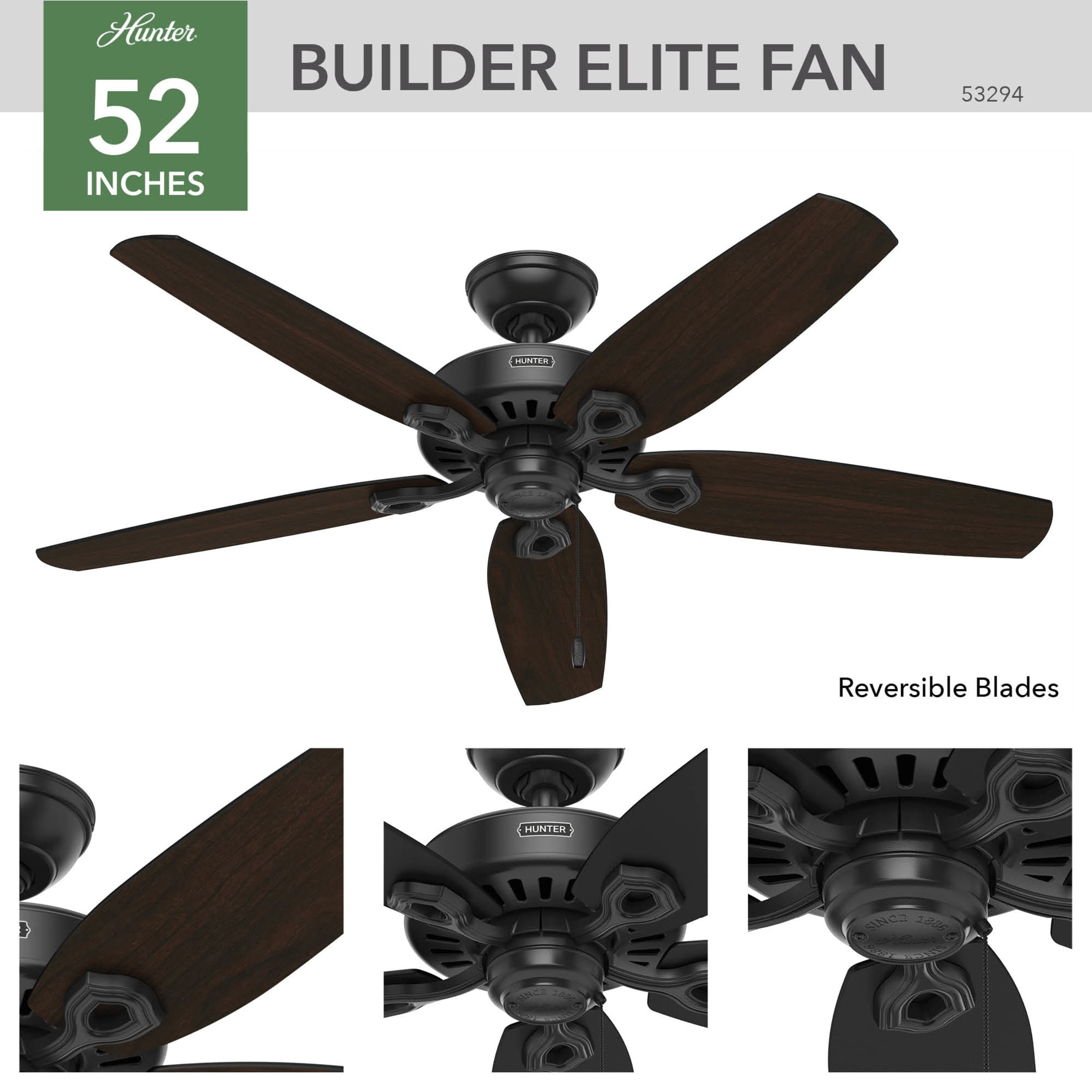 Hunter 52 inch Outdoor or Indoor Ceiling Fan No Light with Pull Chain – Black Ceiling Fan without Light, Standard Mount, 5 Blades, For Patio, Porch, Living Room – Builder Elite 53294, Matte Black