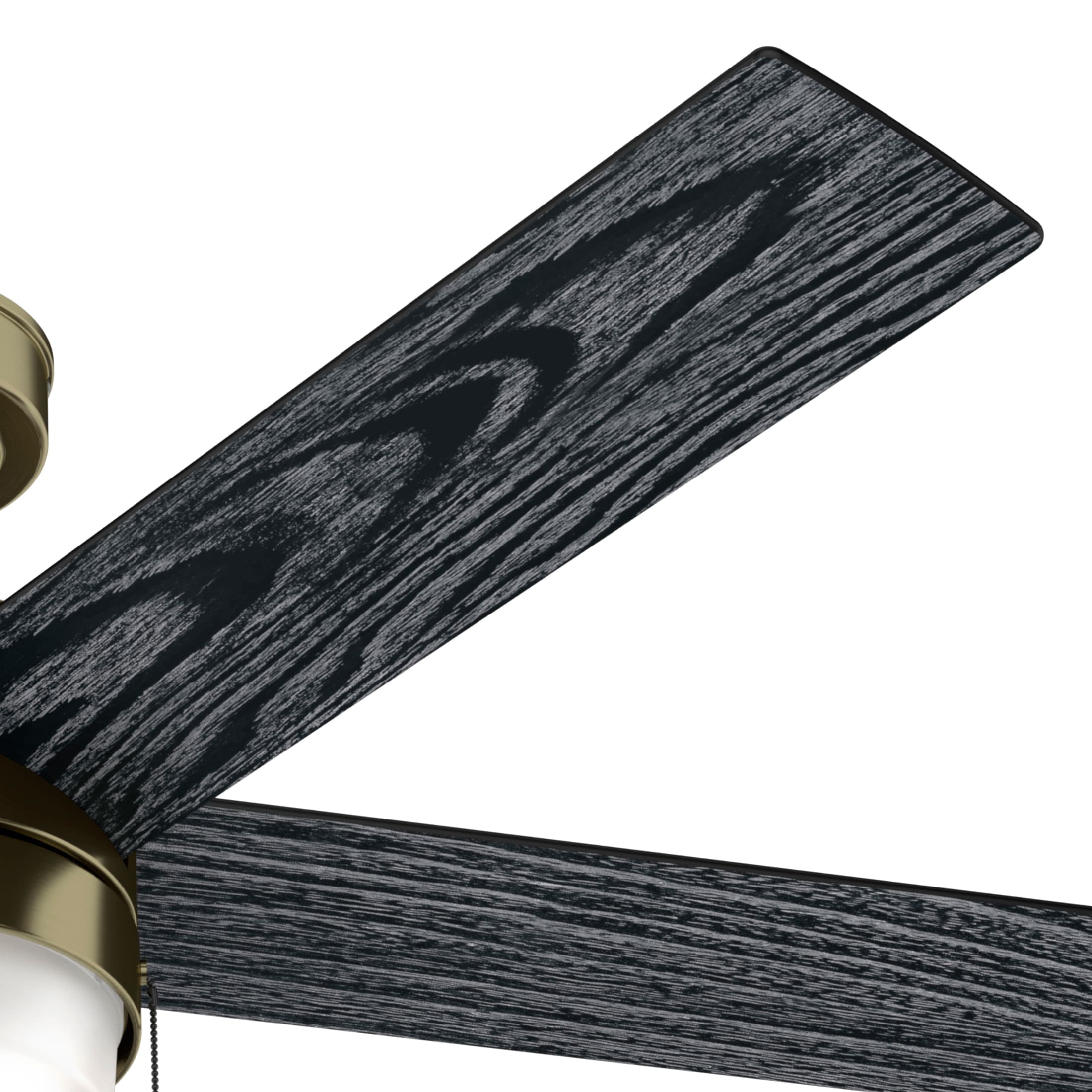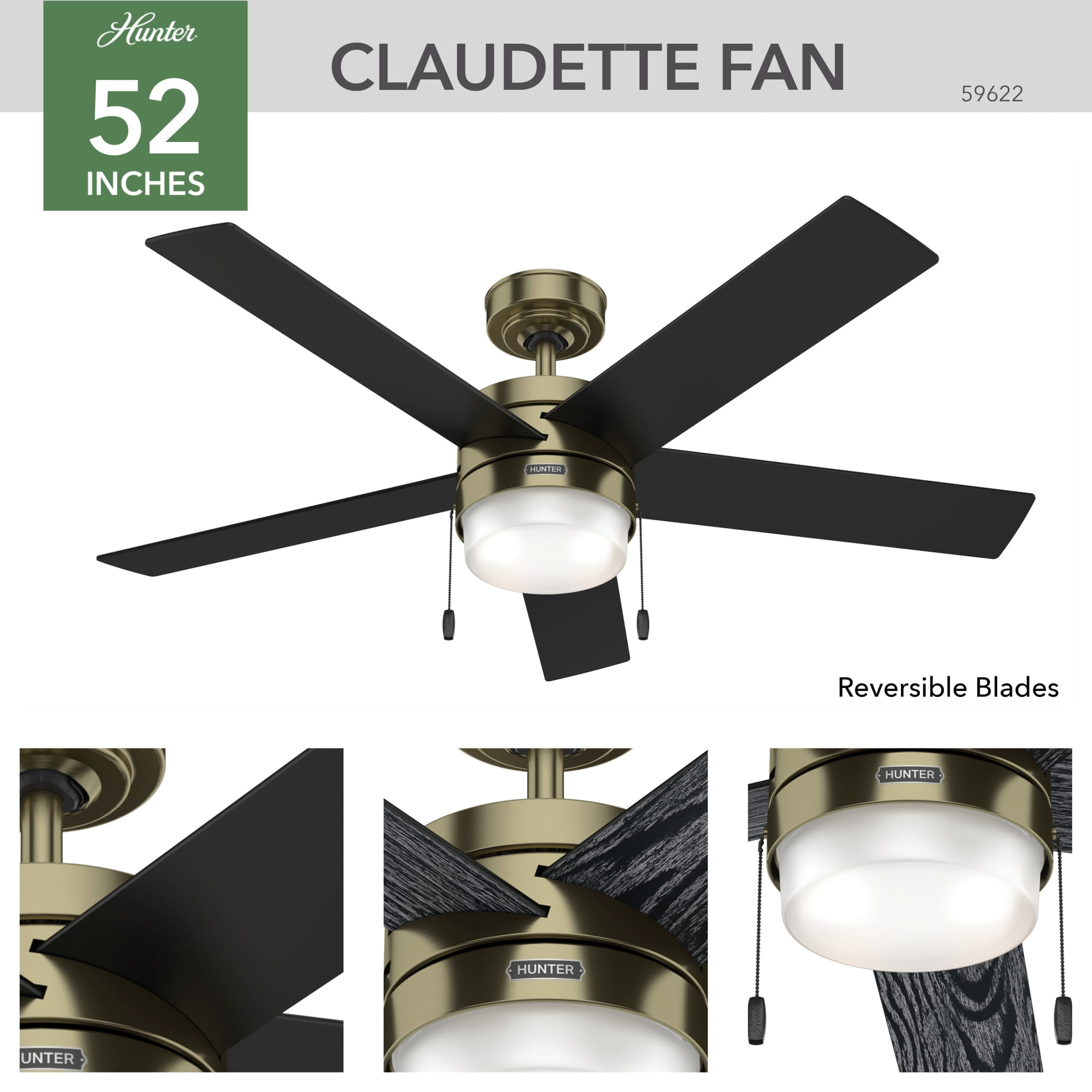 THE CLAUDETTE: A medium-sized, modern ceiling fan perfect for your bedroom, bonus room / game room, guest bedroom, kitchen, laundry room, living room / great room, master bedroom, office CLEARLY BRIGHTER: TrueLight™ products are designed for modern bulbs that provide illumination and efficiency so you get the perfect brightness, every time PULL CHAINS: Includes pull chains for quick and easy on/off and speed adjustments PULL CHAINS: Includes pull chains for quick and easy on/off and speed adjustments AIRFLOW: Strong airflow up to 5863 cubic feet per minute (CFM) on high speed INDOOR ONLY: This ceiling fan is ETL rated for indoor use only, making it ideal for spaces like living rooms, bedrooms, home offices, and kitchens BULBS INCLUDED: Includes two, 7-Watt energy-efficient, long-lasting, dimmable LED bulbs LONGEVITY: Hunter performs twice the agency recommended testing to ensure their ceiling fans – from the finishes to the fan motor your Hunter will stand the test of time WARRANTY: Limited Lifetime Motor Warranty is backed by the only company with over 135 years in the fan business PREMIUM GLASS SHADING: The light kit includes premium white cased shiny glass shading FLIP THE BLADE: This fan features 5 reversible Salted Black and Matte Black blades to help match your room’s design DOWNROD: Includes a single 4-inch downrod to ensure proper distance from the ceiling and optimize air movement WINTER AND SUMMER: Reversible motor allows you to change the direction of your fan from downdraft mode during the summer which helps cool the room to updraft mode during the winter to help circulate trapped warm air near the ceiling BLADE PITCH: 13-degree blade pitch optimized to ensure ideal air movement and peak performance