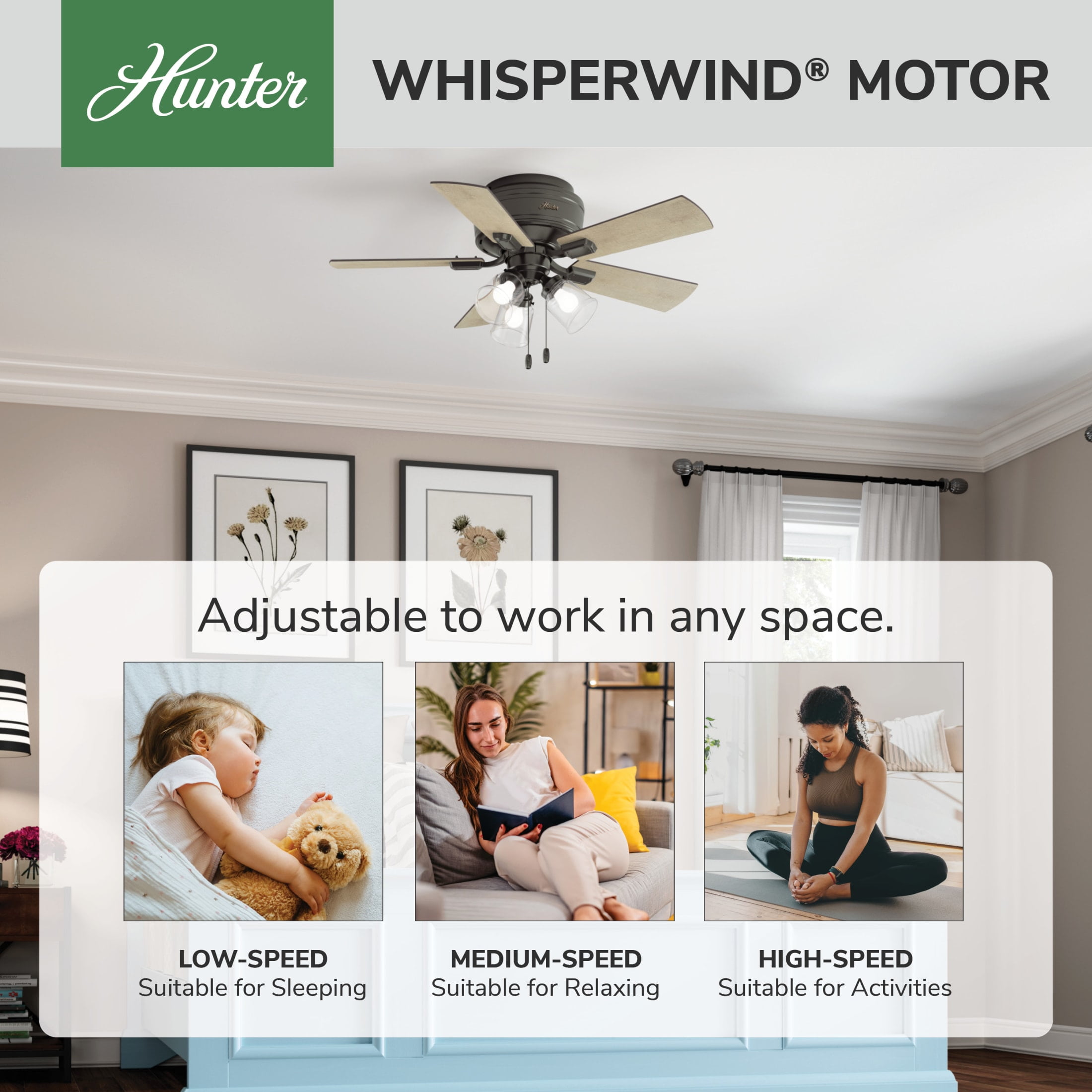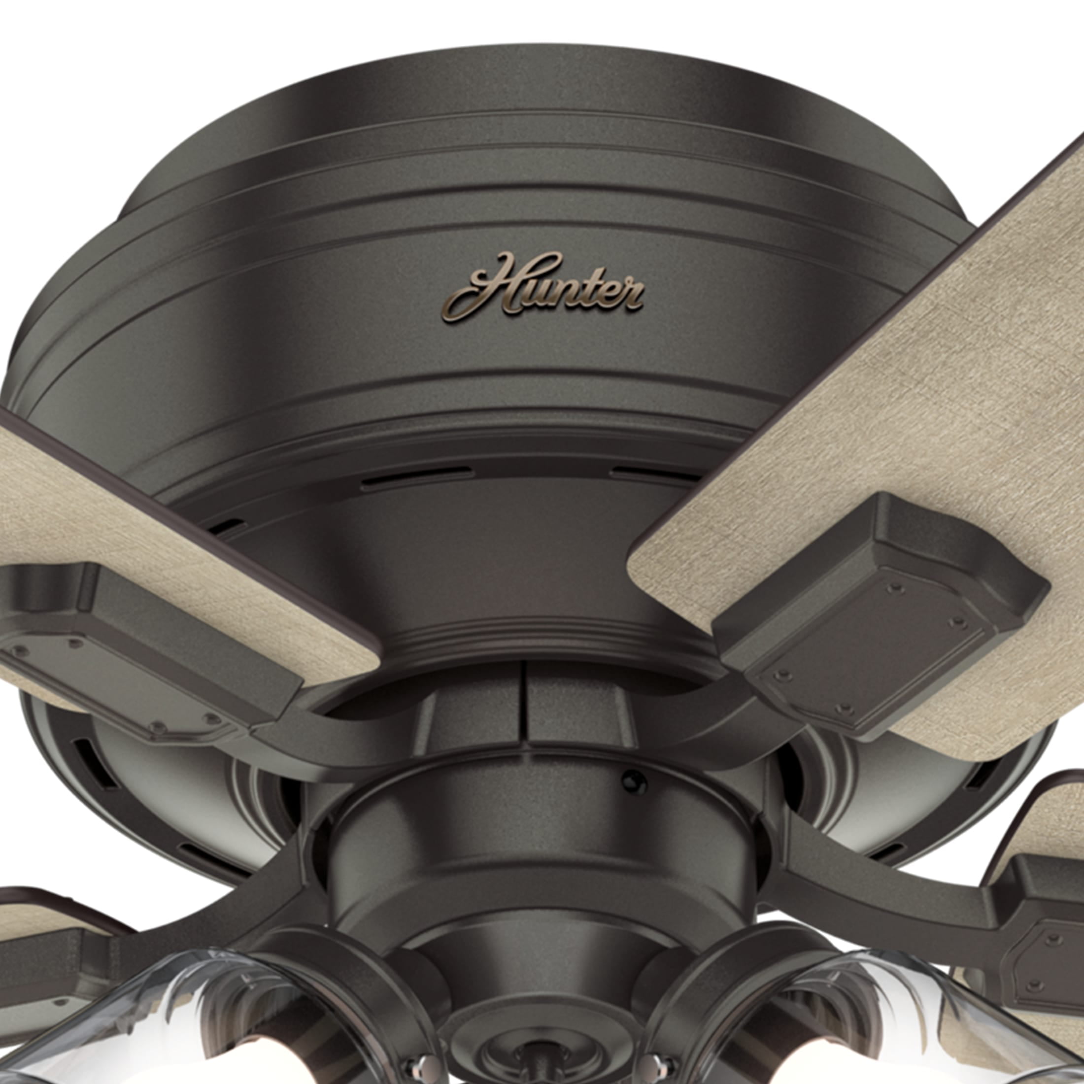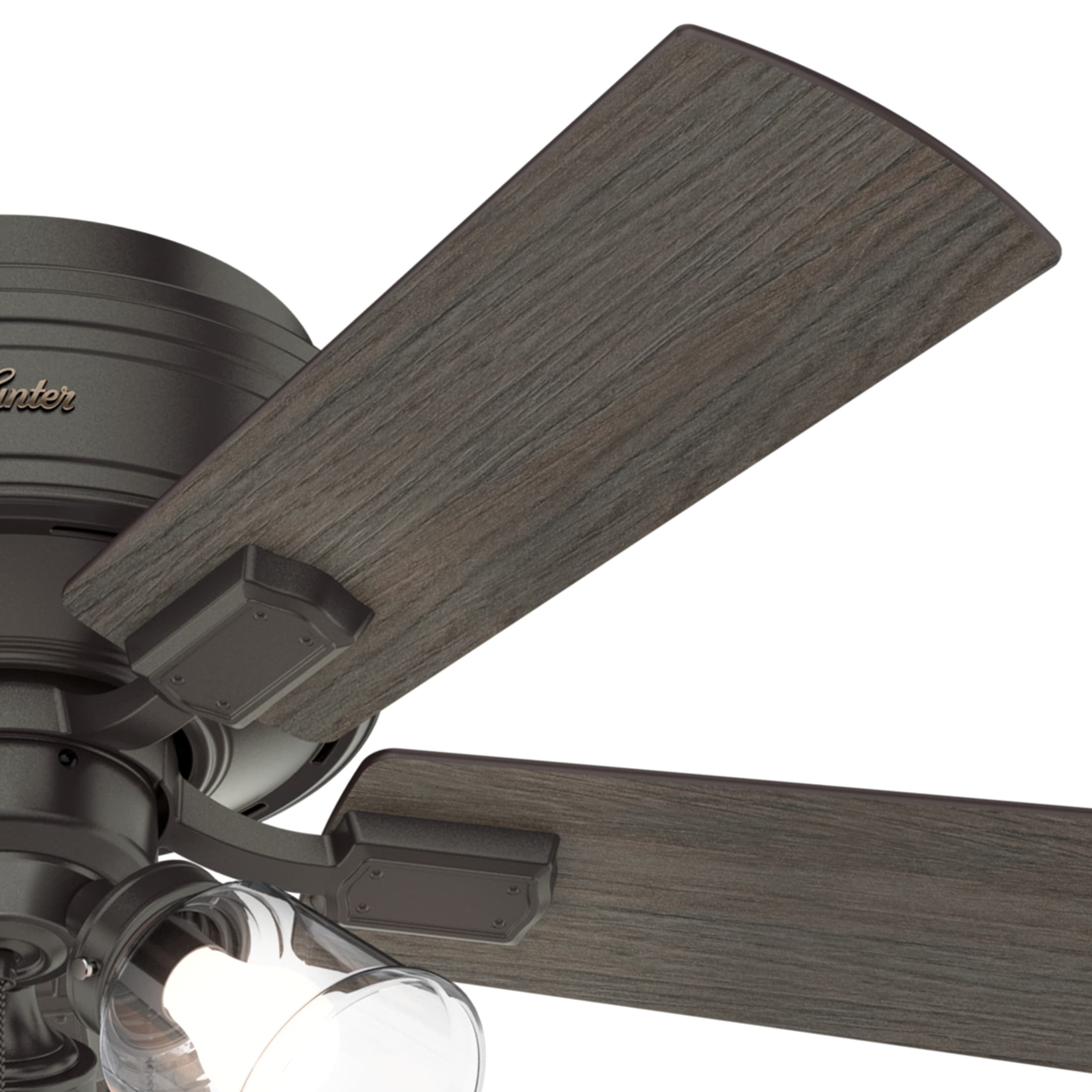 THE CRESTFIELD: A smaller-sized, casual ceiling fan perfect for your foyer / entry way, craft / hobby room, mudroom / utility room, fitness room, kitchen, office, laundry room, bedroom CLEARLY BRIGHTER: TrueLight™ products are designed for modern bulbs that provide illumination and efficiency so you get the perfect brightness, every time PULL CHAINS: Includes pull chains for quick and easy on/off and speed adjustments PULL CHAINS: Includes pull chains for quick and easy on/off and speed adjustments AIRFLOW: Strong airflow up to 3359 cubic feet per minute (CFM) on high speed INDOOR ONLY: This ceiling fan is ETL rated for indoor use only, making it ideal for spaces like living rooms, bedrooms, home offices, and kitchens BULBS INCLUDED: Includes three, 7-Watt energy-efficient, long-lasting, dimmable LED bulbs LONGEVITY: Hunter performs twice the agency recommended testing to ensure their ceiling fans – from the finishes to the fan motor your Hunter will stand the test of time WARRANTY: Limited Lifetime Motor Warranty is backed by the only company with over 135 years in the fan business PREMIUM GLASS SHADING: The light kit includes premium clear glass shading FLIP THE BLADE: This fan features 5 reversible Bleached Grey Pine and Greyed Walnut blades to help match your room’s design WINTER AND SUMMER: Reversible motor allows you to change the direction of your fan from downdraft mode during the summer which helps cool the room to updraft mode during the winter to help circulate trapped warm air near the ceiling BLADE PITCH: 13-degree blade pitch optimized to ensure ideal air movement and peak performance