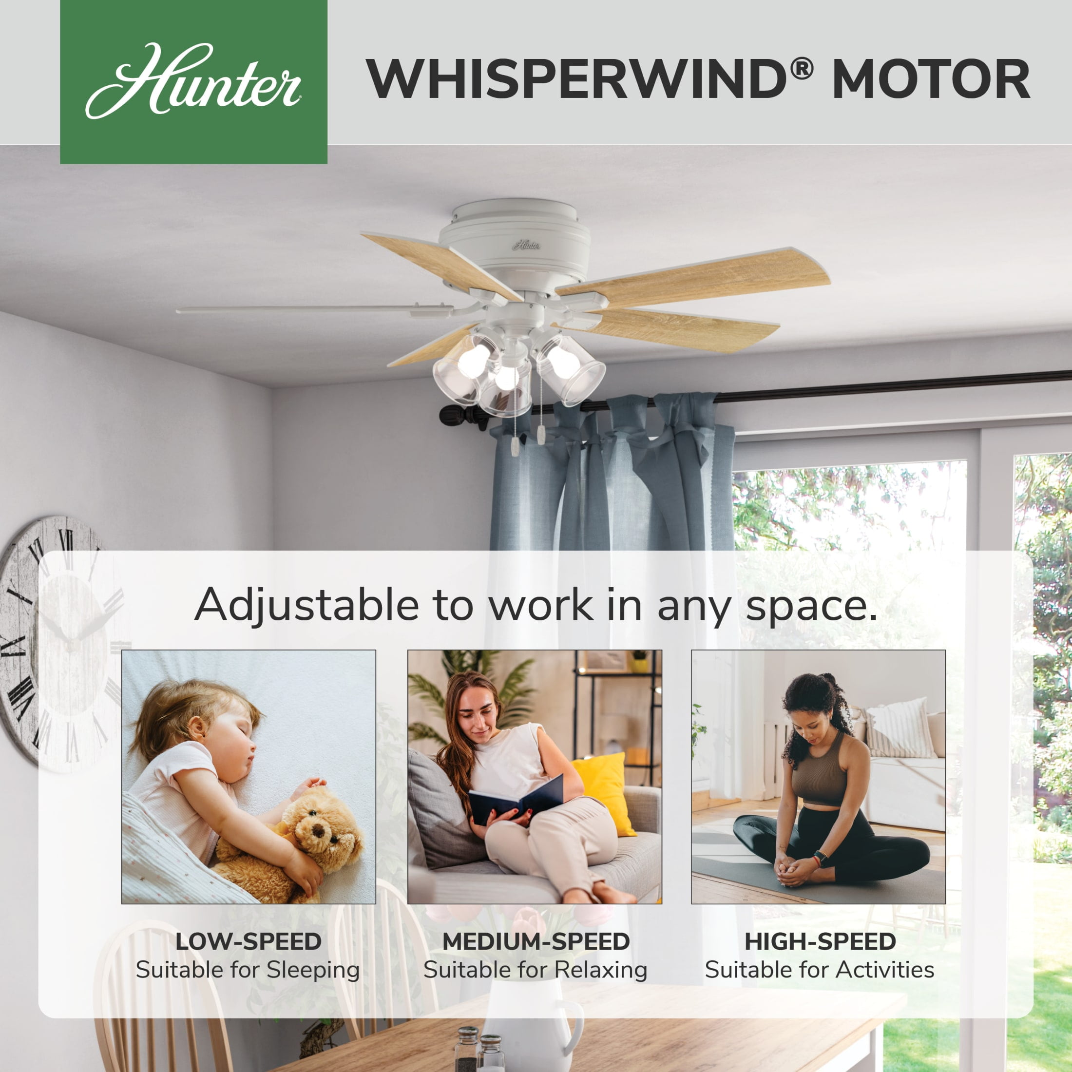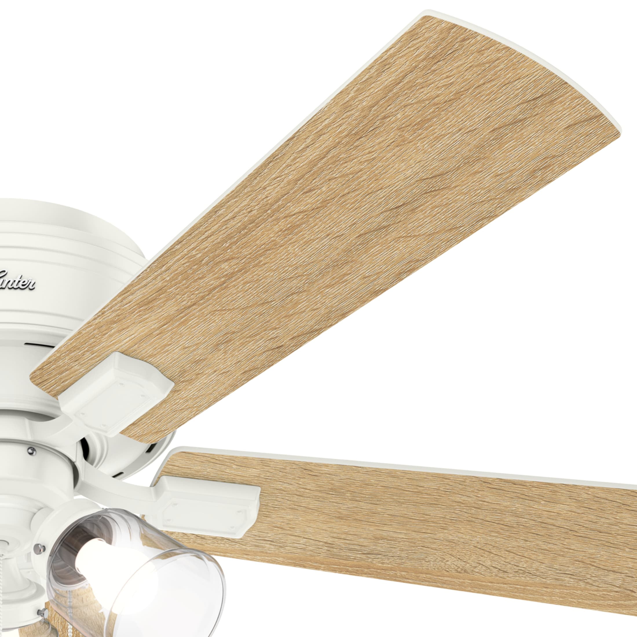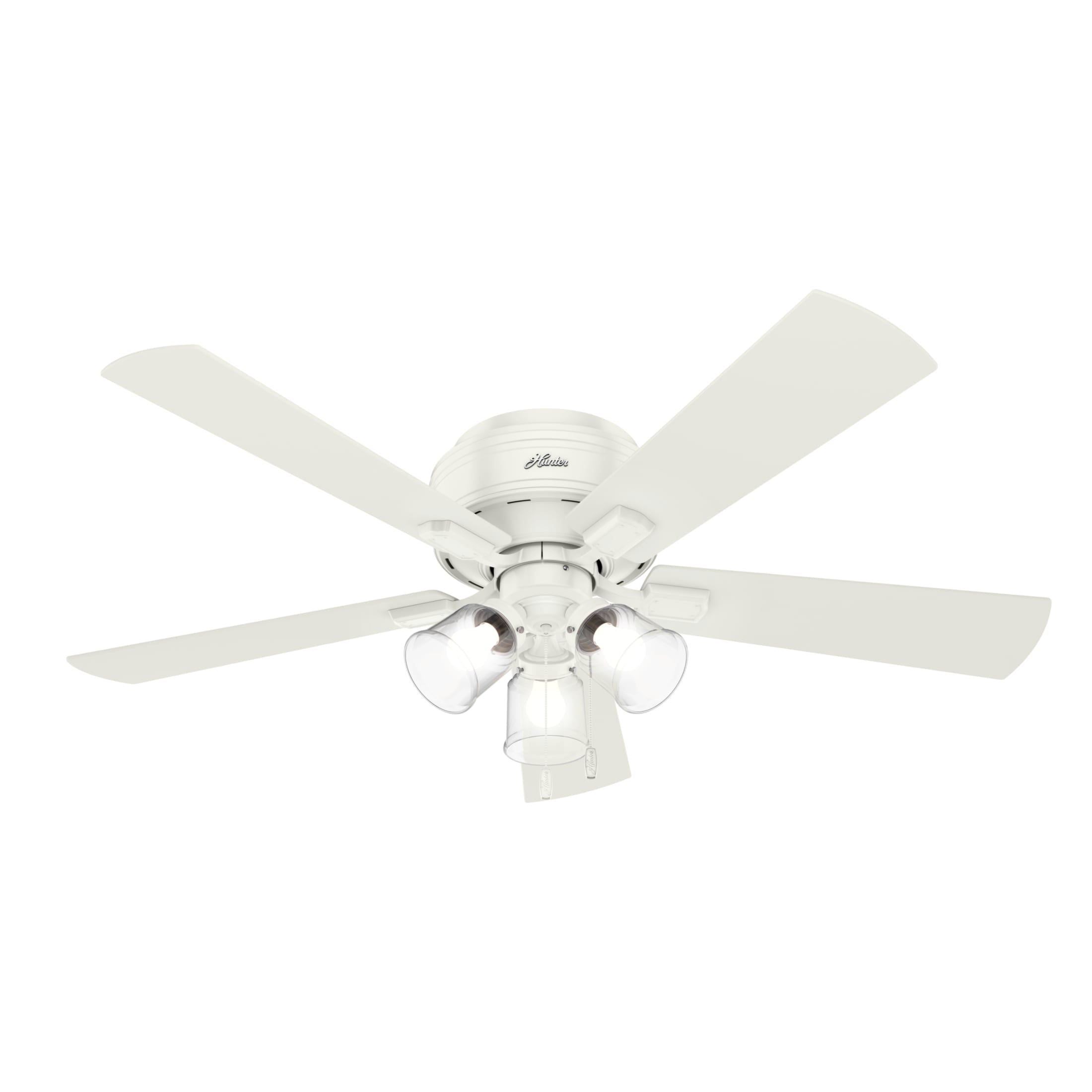 THE CRESTFIELD: A medium-sized, casual ceiling fan perfect for your master bedroom, living room / great room, dining room, bonus room / game room, kitchen, office, laundry room, bedroom, guest bedroom CLEARLY BRIGHTER: TrueLight™ products are designed for modern bulbs that provide illumination and efficiency so you get the perfect brightness, every time PULL CHAINS: Includes pull chains for quick and easy on/off and speed adjustments PULL CHAINS: Includes pull chains for quick and easy on/off and speed adjustments AIRFLOW: Strong airflow up to 4784 cubic feet per minute (CFM) on high speed INDOOR ONLY: This ceiling fan is ETL rated for indoor use only, making it ideal for spaces like living rooms, bedrooms, home offices, and kitchens BULBS INCLUDED: Includes three, 9-Watt energy-efficient, long-lasting, dimmable LED bulbs LONGEVITY: Hunter performs twice the agency recommended testing to ensure their ceiling fans – from the finishes to the fan motor your Hunter will stand the test of time WARRANTY: Limited Lifetime Motor Warranty is backed by the only company with over 135 years in the fan business PREMIUM GLASS SHADING: The light kit includes premium clear glass shading FLIP THE BLADE: This fan features 5 reversible Fresh White and Drifted Oak blades to help match your room’s design WINTER AND SUMMER: Reversible motor allows you to change the direction of your fan from downdraft mode during the summer which helps cool the room to updraft mode during the winter to help circulate trapped warm air near the ceiling BLADE PITCH: 13-degree blade pitch optimized to ensure ideal air movement and peak performance