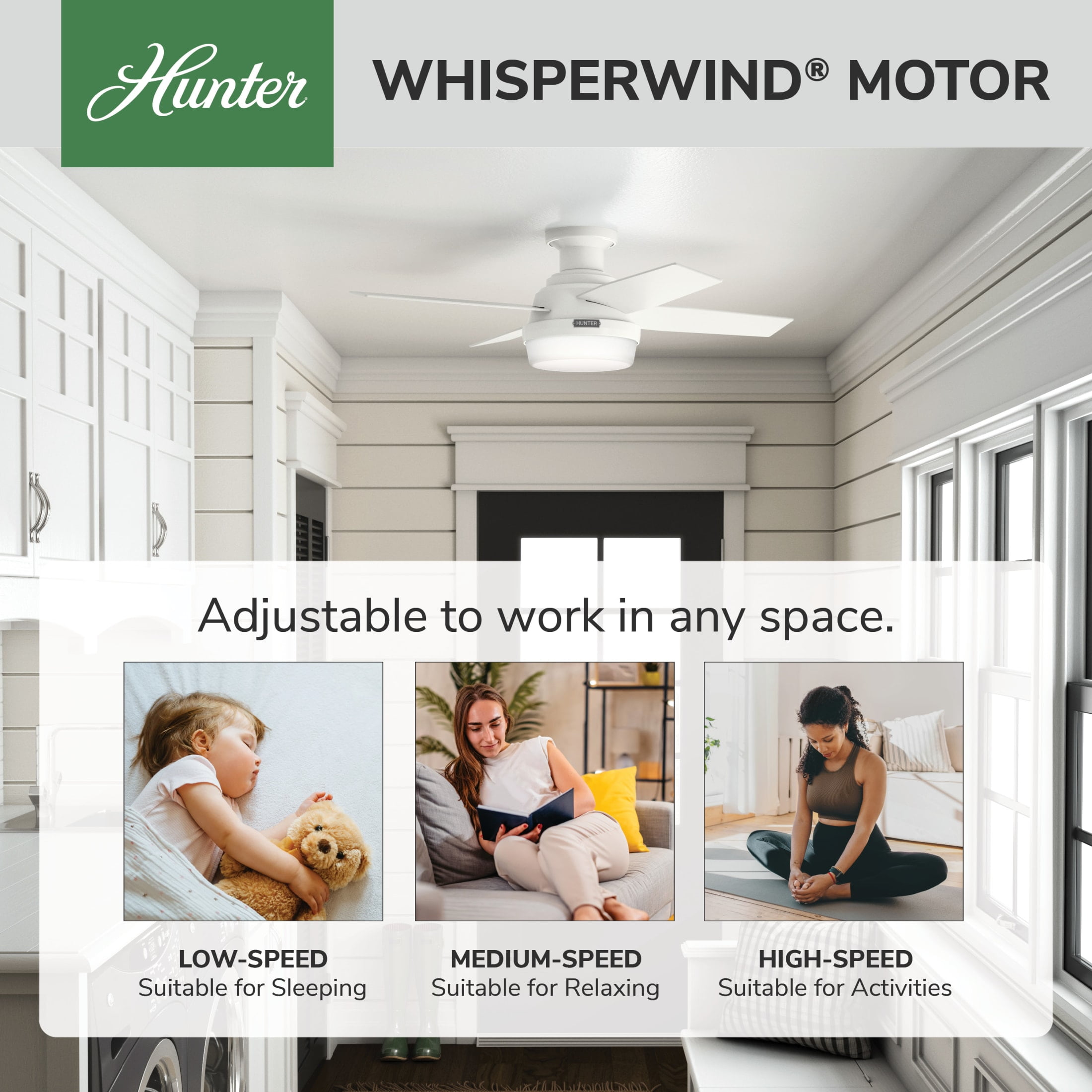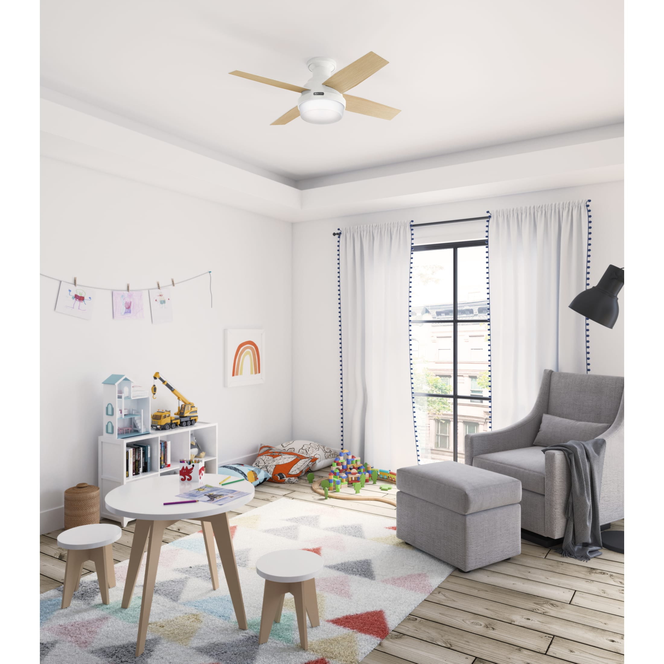 THE DEMPSEY: A smaller-sized, modern ceiling fan perfect for your foyer / entry way, craft / hobby room, mudroom / utility room, fitness room, kitchen, office, laundry room, bedroom, child’s bedroom DIGITAL MANUAL: Installation made easy with Hunter’s 3D InterActive Guide—just scan the QR code for quick setup CLEARLY BRIGHTER: TrueLight™ products are designed for modern bulbs that provide illumination and efficiency so you get the perfect brightness, every time PREMIUM CONTROL: Handheld remote included for easy fan adjustments from anywhere in the room AIRFLOW: Strong airflow up to 3768 cubic feet per minute (CFM) on high speed INDOOR ONLY: This ceiling fan is ETL rated for indoor use only, making it ideal for spaces like living rooms, bedrooms, home offices, and kitchens BULBS INCLUDED: Includes two, 9.8-Watt energy-efficient, long-lasting, dimmable LED bulbs LONGEVITY: Hunter performs twice the agency recommended testing to ensure their ceiling fans – from the finishes to the fan motor your Hunter will stand the test of time WARRANTY: Limited Lifetime Motor Warranty is backed by the only company with over 135 years in the fan business PREMIUM GLASS SHADING: The light kit includes premium painted cased white glass shading FLIP THE BLADE: This fan features 4 reversible Blonde Oak and Fresh White blades to help match your room’s design WINTER AND SUMMER: Reversible motor allows you to change the direction of your fan from downdraft mode during the summer which helps cool the room to updraft mode during the winter to help circulate trapped warm air near the ceiling BLADE PITCH: 13-degree blade pitch optimized to ensure ideal air movement and peak performance