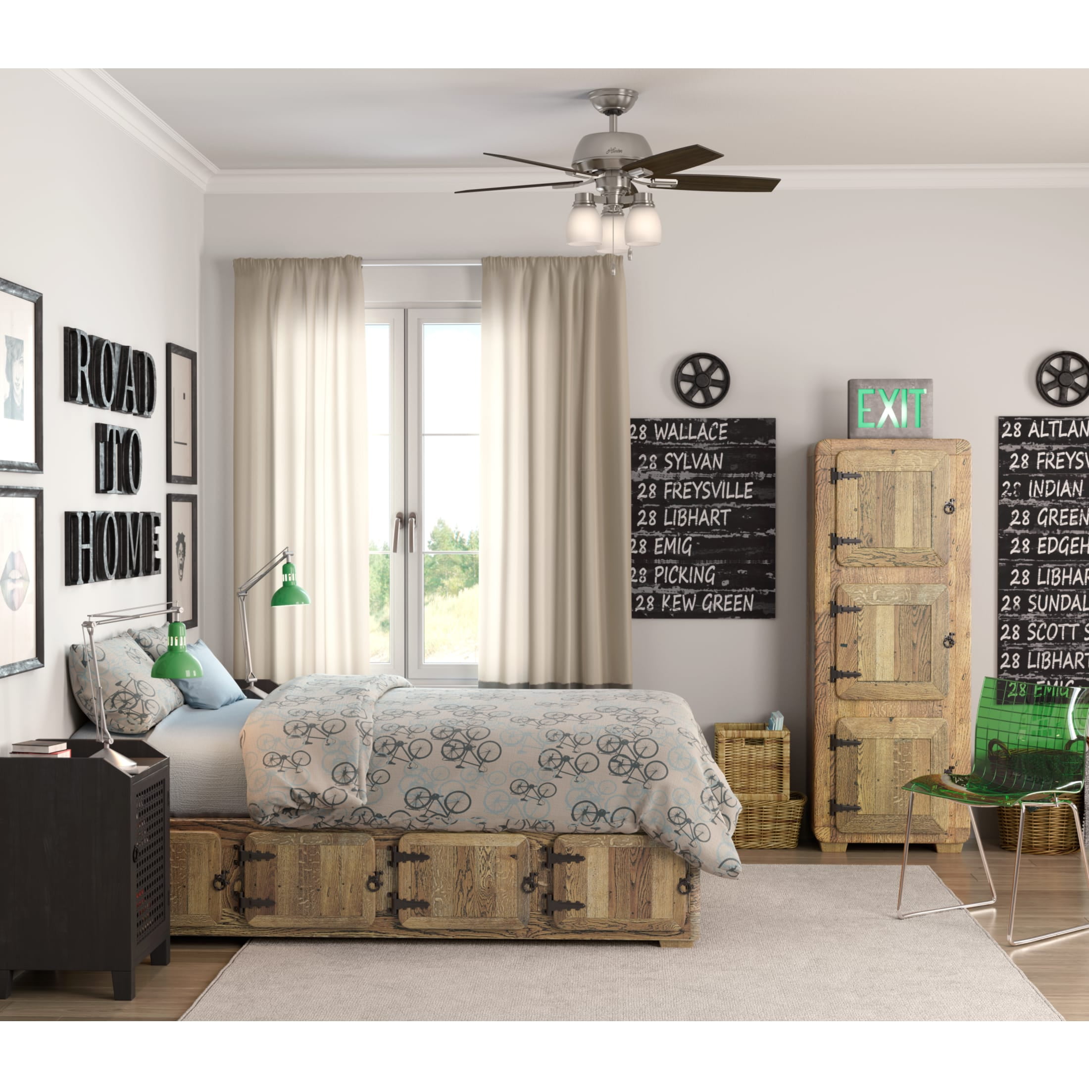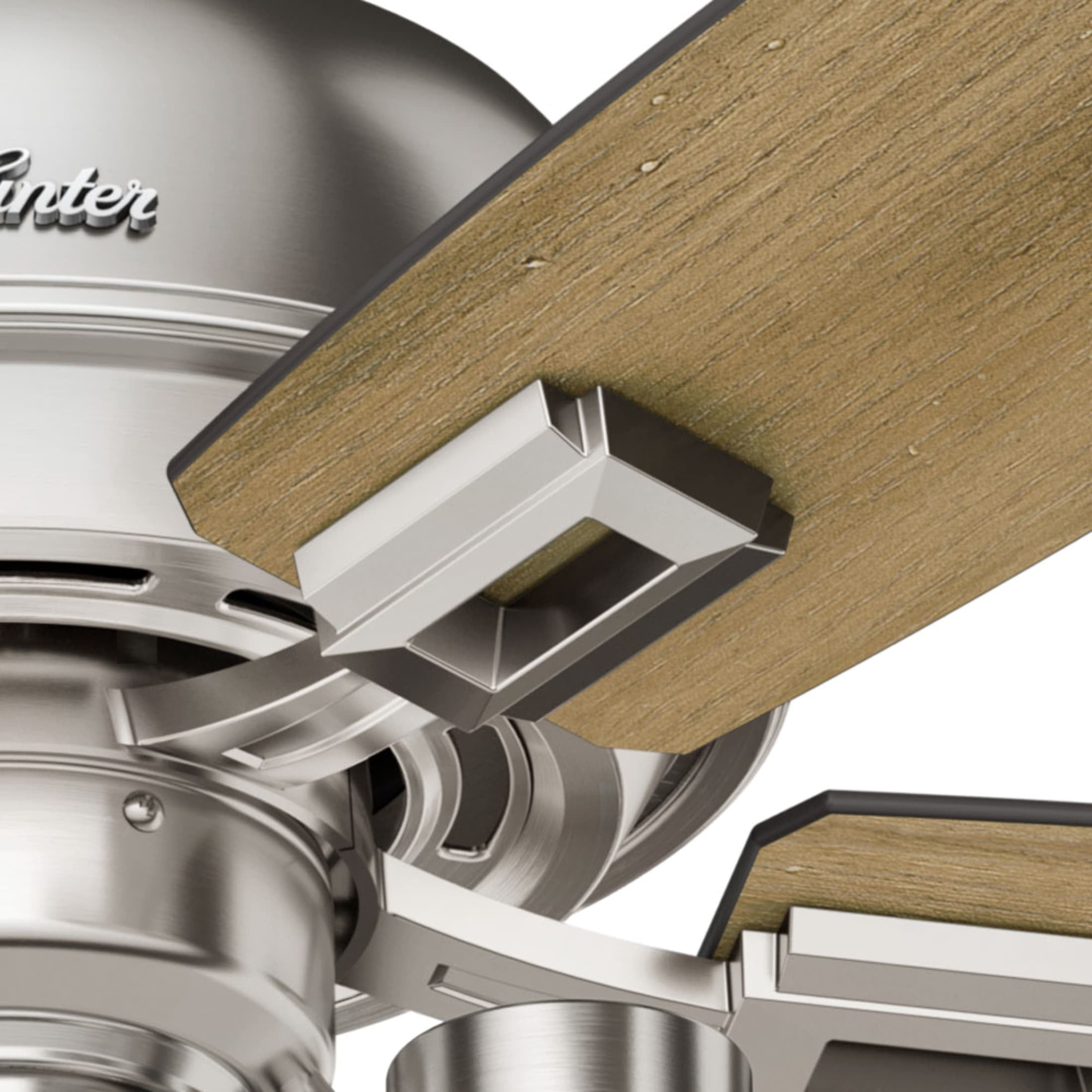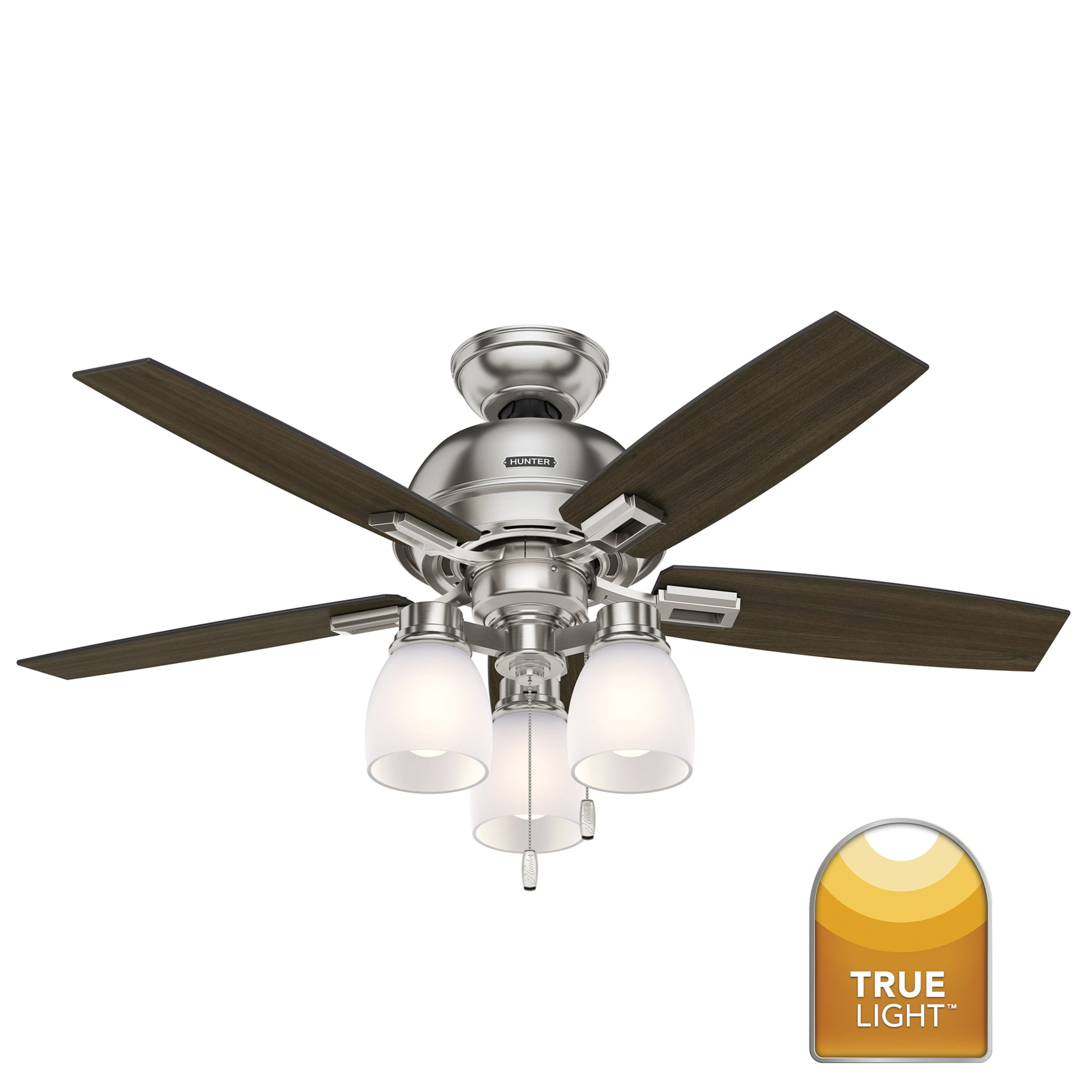 THE DONEGAN: A smaller-sized, rustic ceiling fan perfect for your foyer / entry way, craft / hobby room, dining room, mudroom / utility room, fitness room, kitchen, office, laundry room, bedroom CLEARLY BRIGHTER: TrueLight™ products are designed for modern bulbs that provide illumination and efficiency so you get the perfect brightness, every time PULL CHAINS: Includes pull chains for quick and easy on/off and speed adjustments PULL CHAINS: Includes pull chains for quick and easy on/off and speed adjustments AIRFLOW: Strong airflow up to 3946 cubic feet per minute (CFM) on high speed INDOOR ONLY: This ceiling fan is ETL rated for indoor use only, making it ideal for spaces like living rooms, bedrooms, home offices, and kitchens BULBS INCLUDED: Includes three, 9-Watt energy-efficient, long-lasting, dimmable LED bulbs LONGEVITY: Hunter performs twice the agency recommended testing to ensure their ceiling fans – from the finishes to the fan motor your Hunter will stand the test of time WARRANTY: Limited Lifetime Motor Warranty is backed by the only company with over 135 years in the fan business PREMIUM GLASS SHADING: The light kit includes premium clear frosted glass shading FLIP THE BLADE: This fan features 5 reversible Distressed Oak and Dark Walnut blades to help match your room’s design DOWNROD: Includes a single 3-inch downrod to ensure proper distance from the ceiling and optimize air movement WINTER AND SUMMER: Reversible motor allows you to change the direction of your fan from downdraft mode during the summer which helps cool the room to updraft mode during the winter to help circulate trapped warm air near the ceiling BLADE PITCH: 13-degree blade pitch optimized to ensure ideal air movement and peak performance