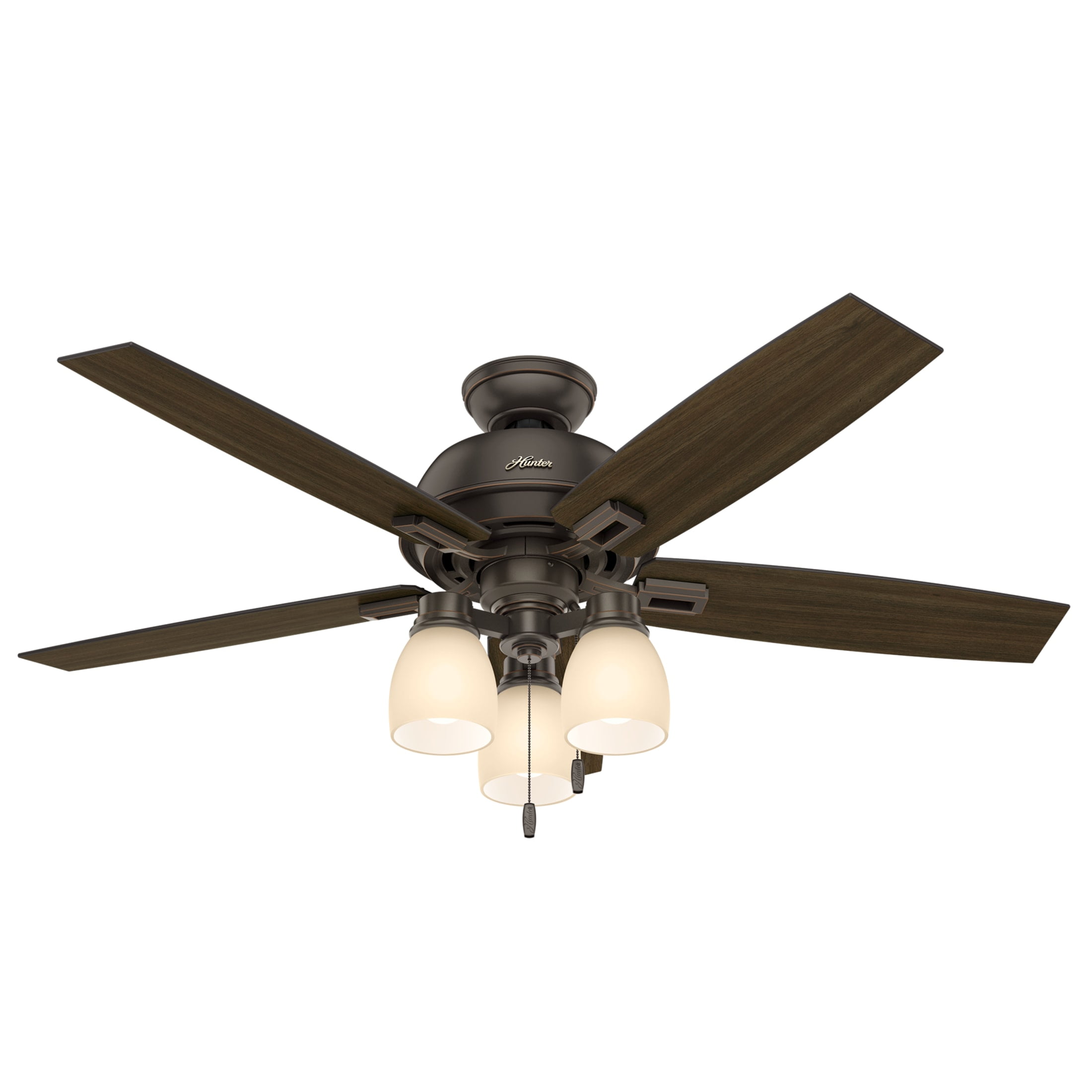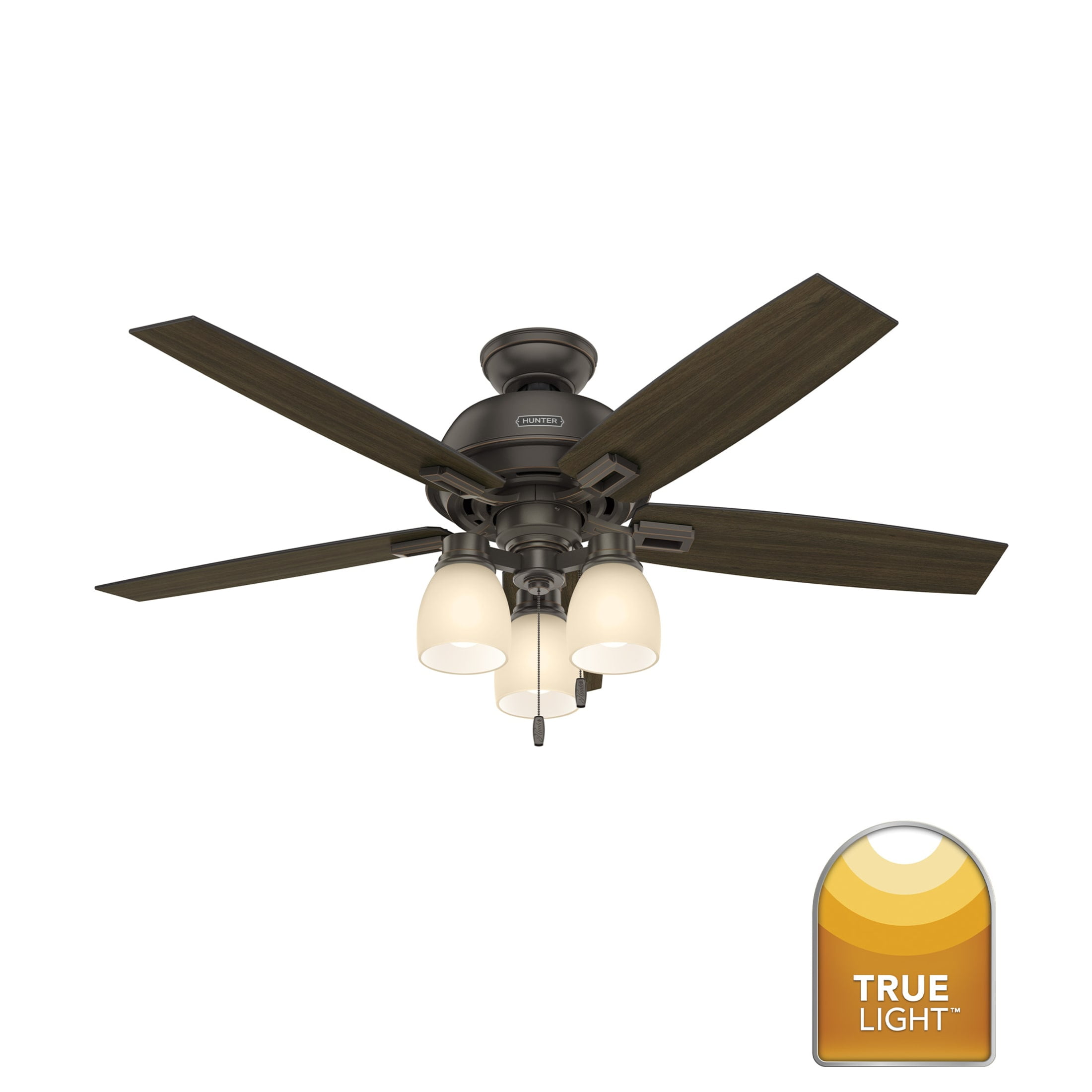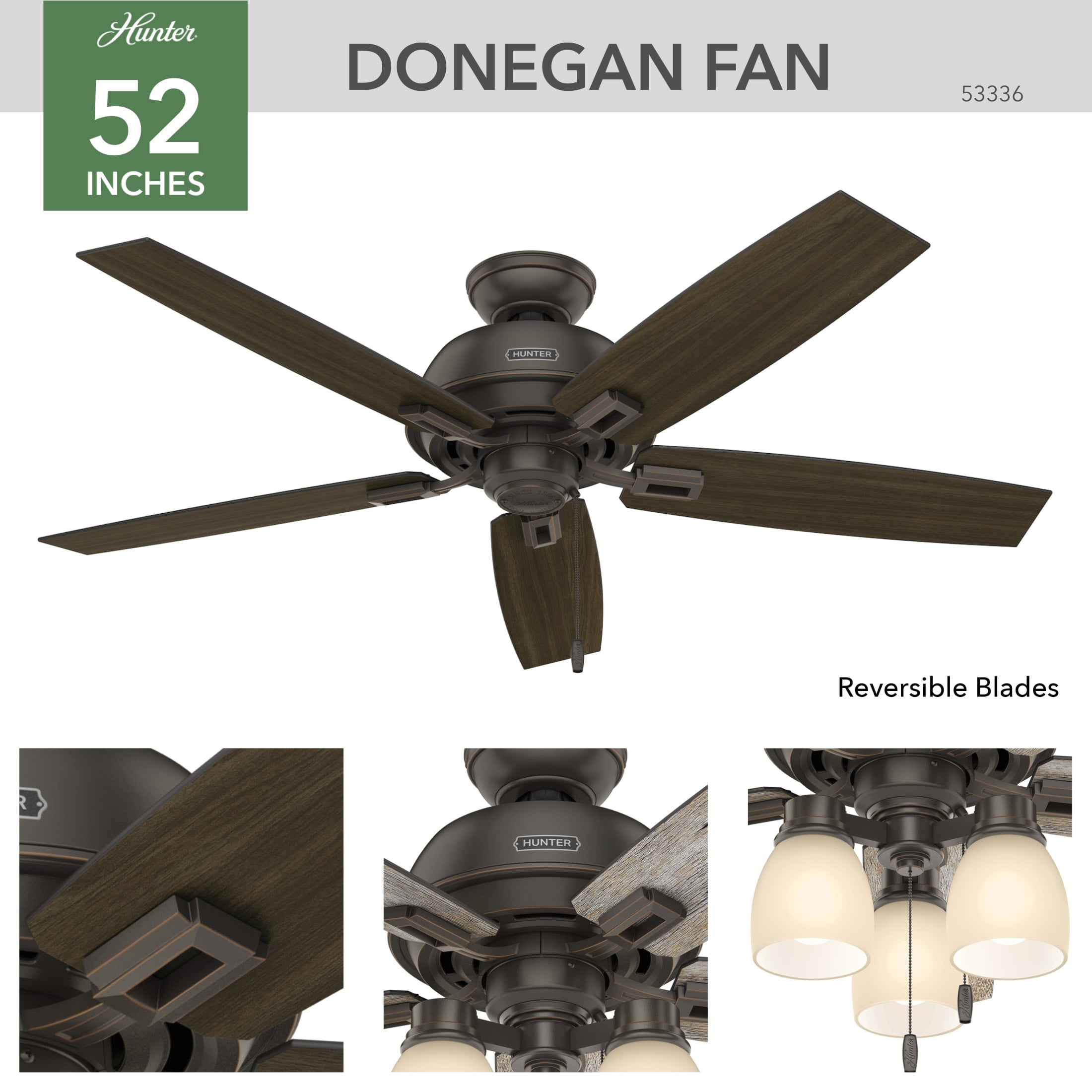 The Donegan boasts a sophisticated design with casual appeal. As part of the Hunter® Designer Series, this fan showcases high-end finishes and rustic features making it a perfect accent in any room with a farmhouse home decor style. The powerful motor and 52-inch blades will keep the air moving in your bedroom and living room, and the high-efficiency, dimmable LED bulbs in the three-light fixture are fully adjustable for the perfect amount of light. The Donegan collection has a large variety of finishes, sizes, lighting options, and more so you can carry a consistent design theme throughout every room in your home.